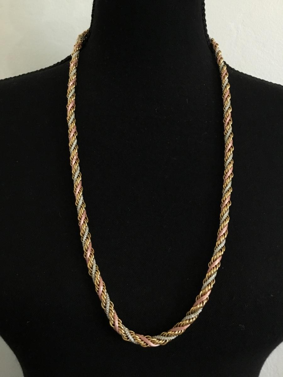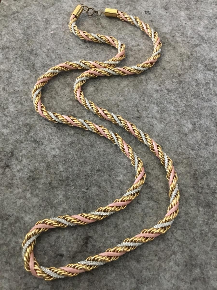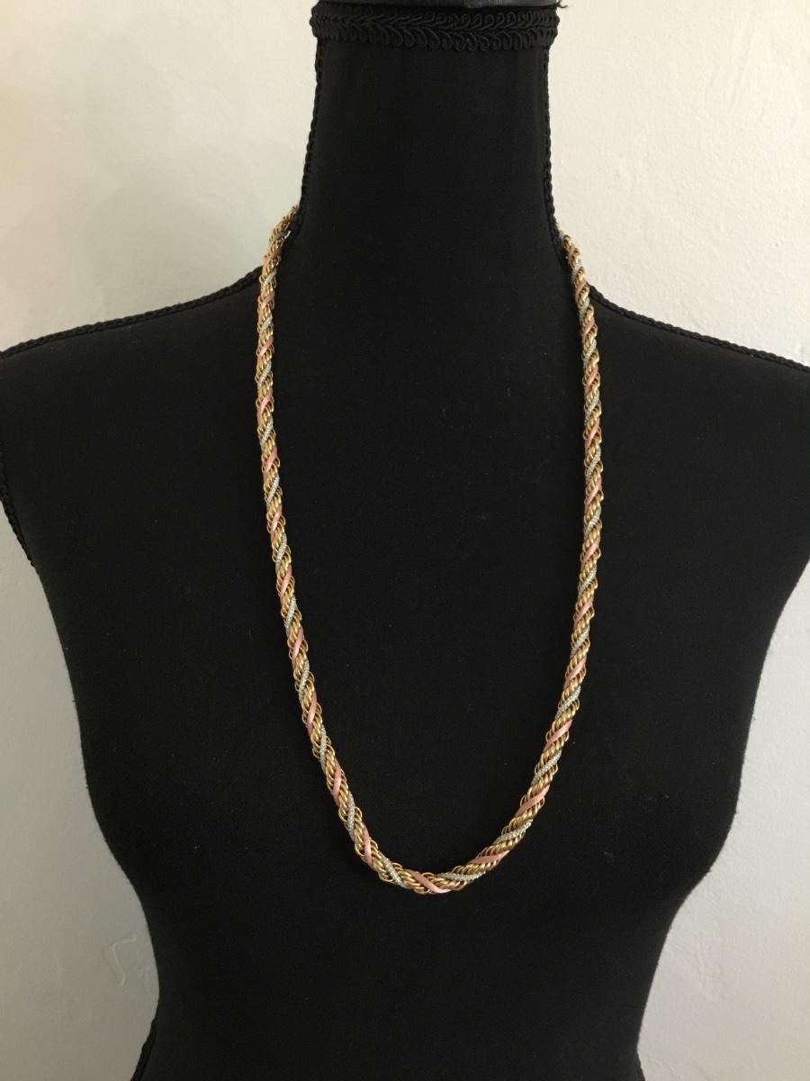 Vintage braided gold tone, pink and silver chain necklace