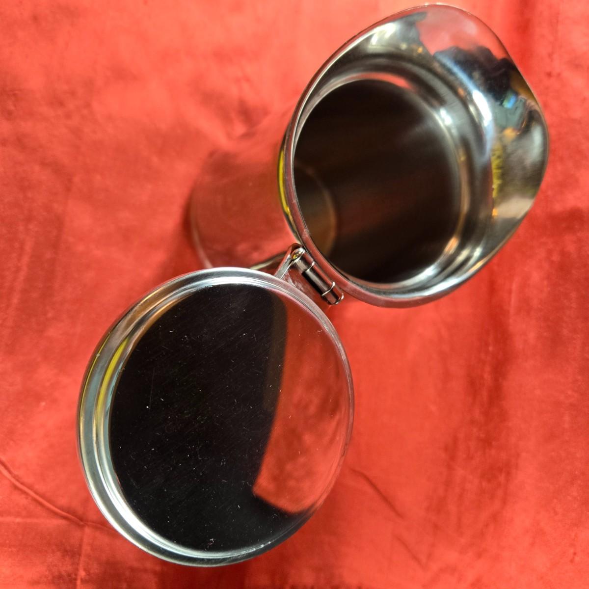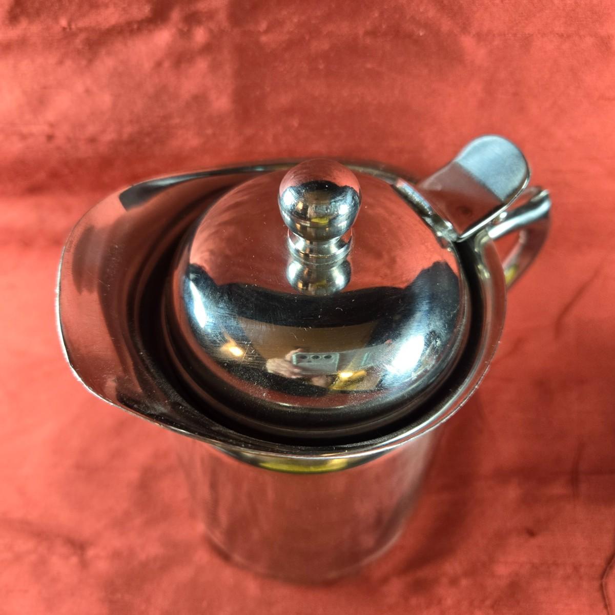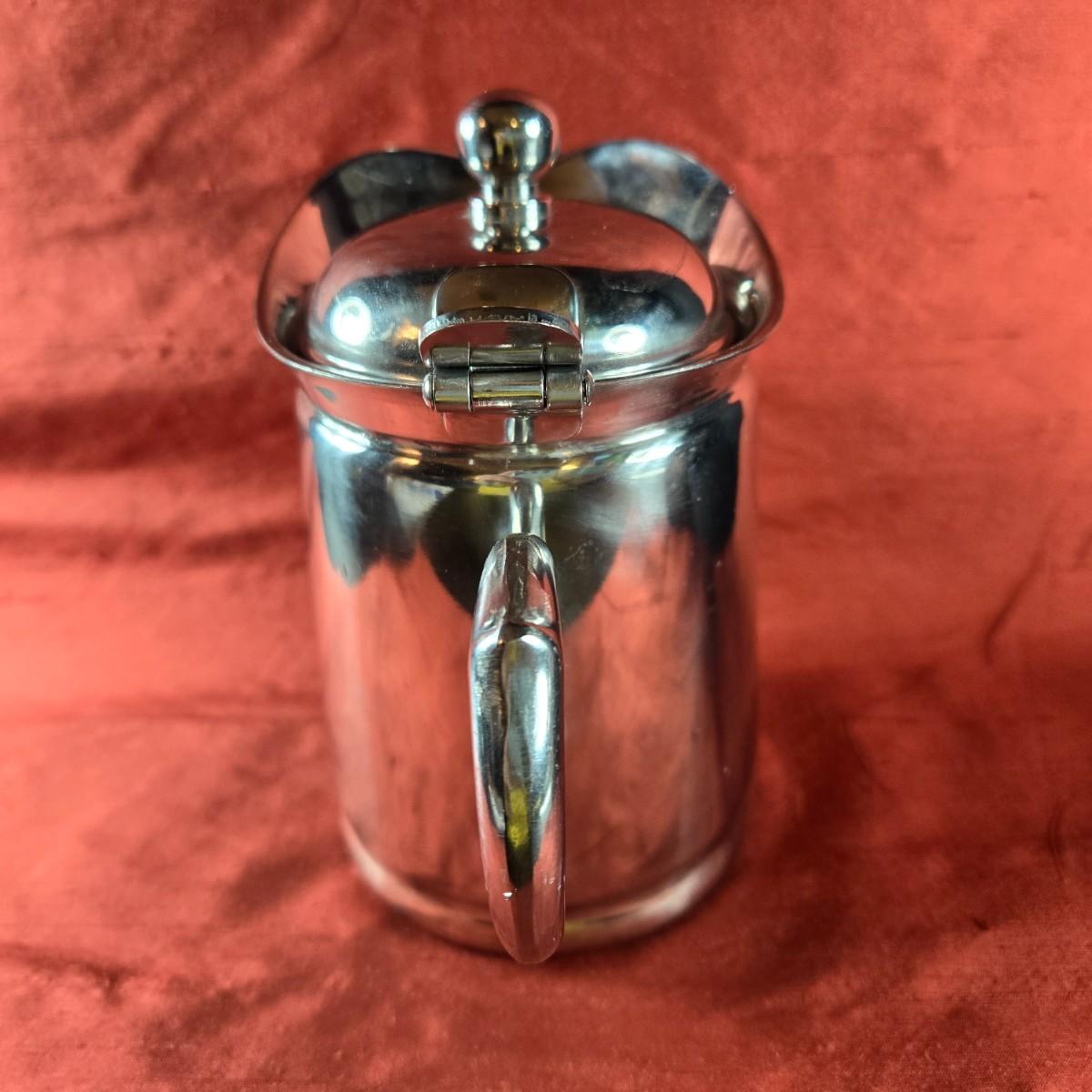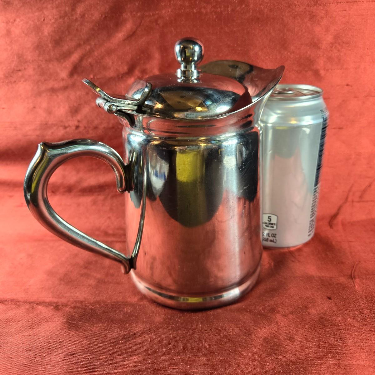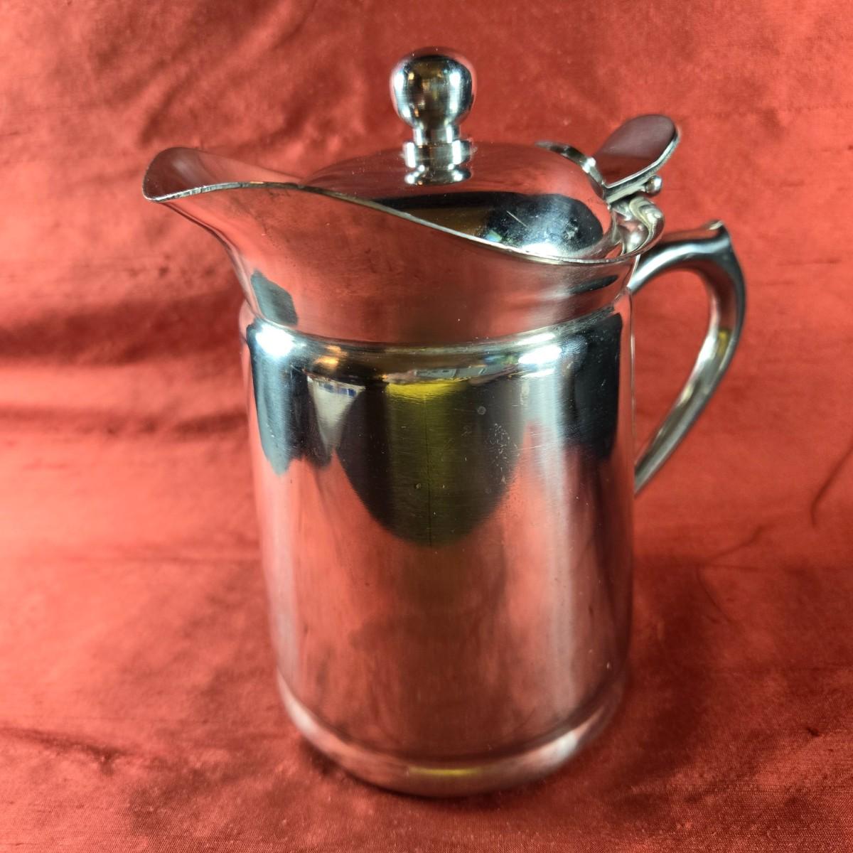 This auction lot is for a Vintage Brand Ware Pitcher. This is a stylish, stainless steel, Mid-Century service item. It is in very good condition for it's age and use. It is about 6-1/2-inches tall X 4-inches in diameter. It could really come in handy especially with it's attached pop-up lid.