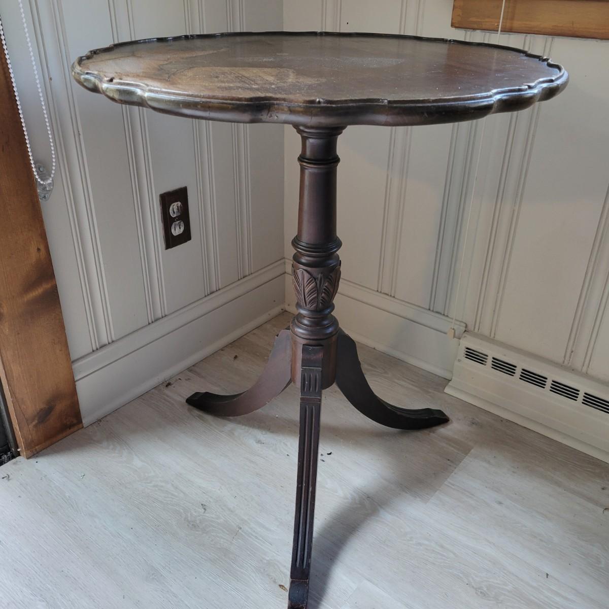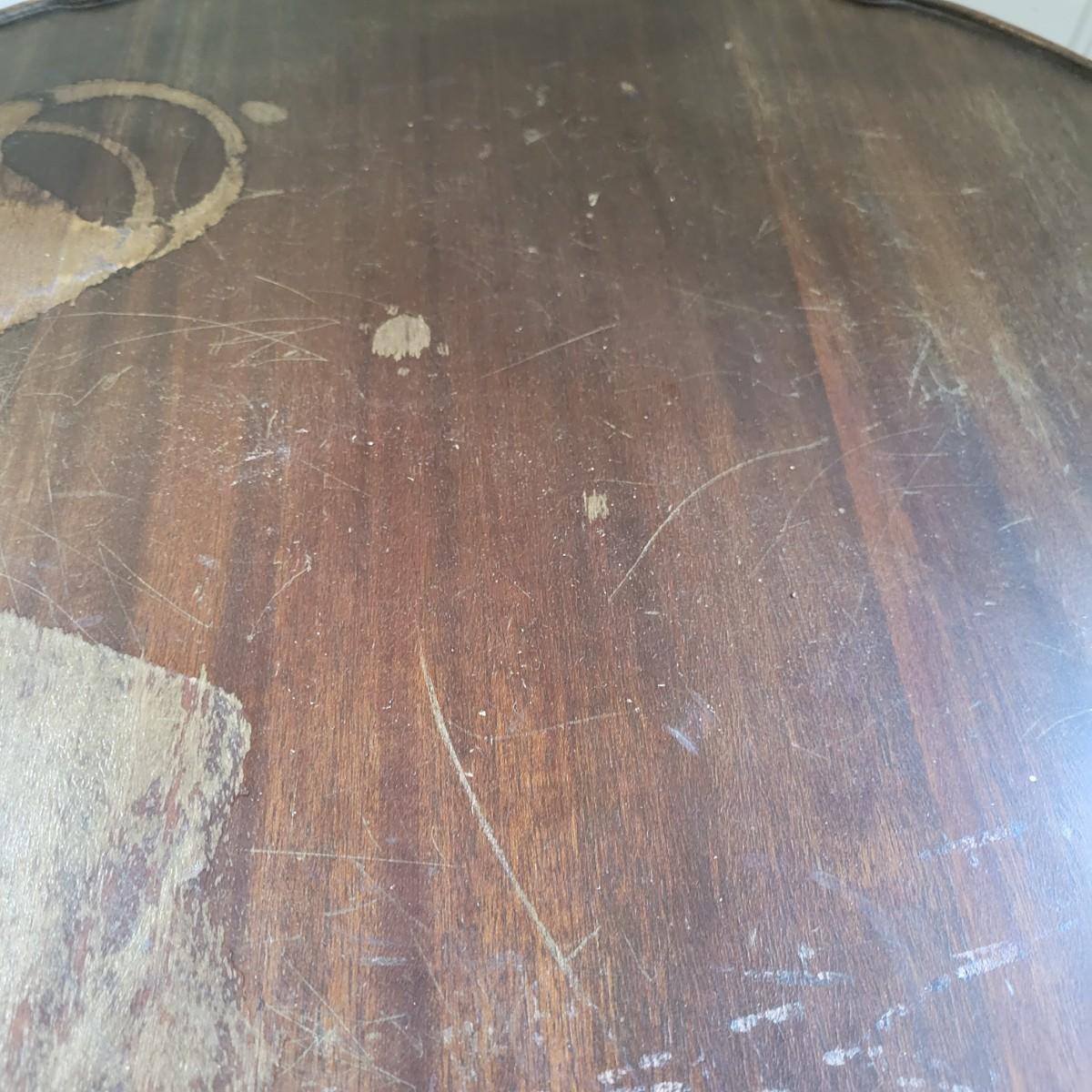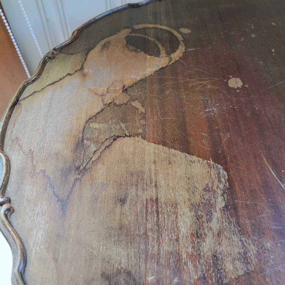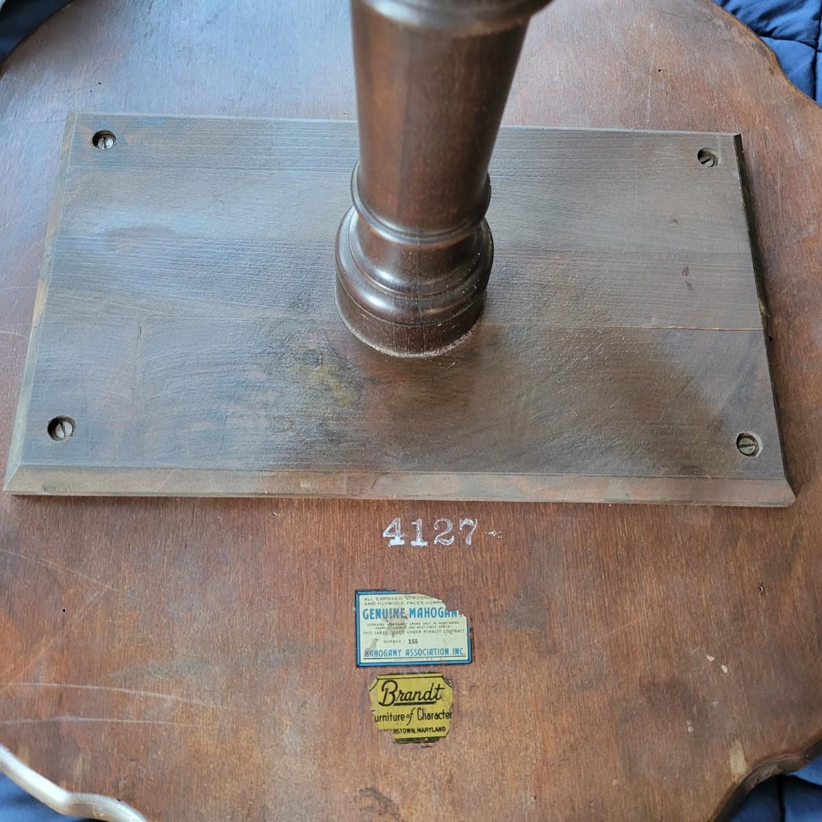 A vintage Brandt furniture George III style mahogany tea table in fair condition due to water stains, but could easily be refinished to give it new life. This table features scalloped pie edges and three feet with beautiful wood carvings. Measures approximately 23" x 27" Local pickup only