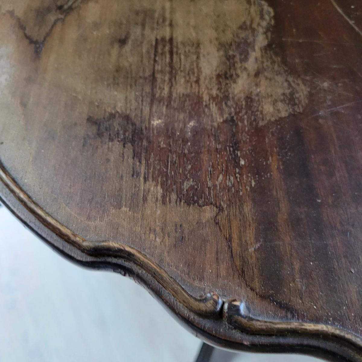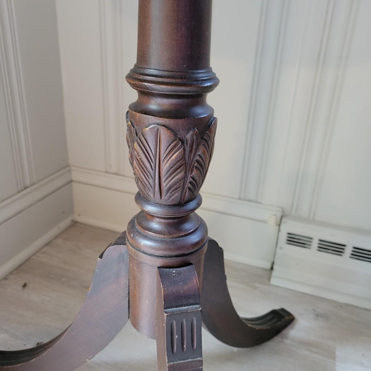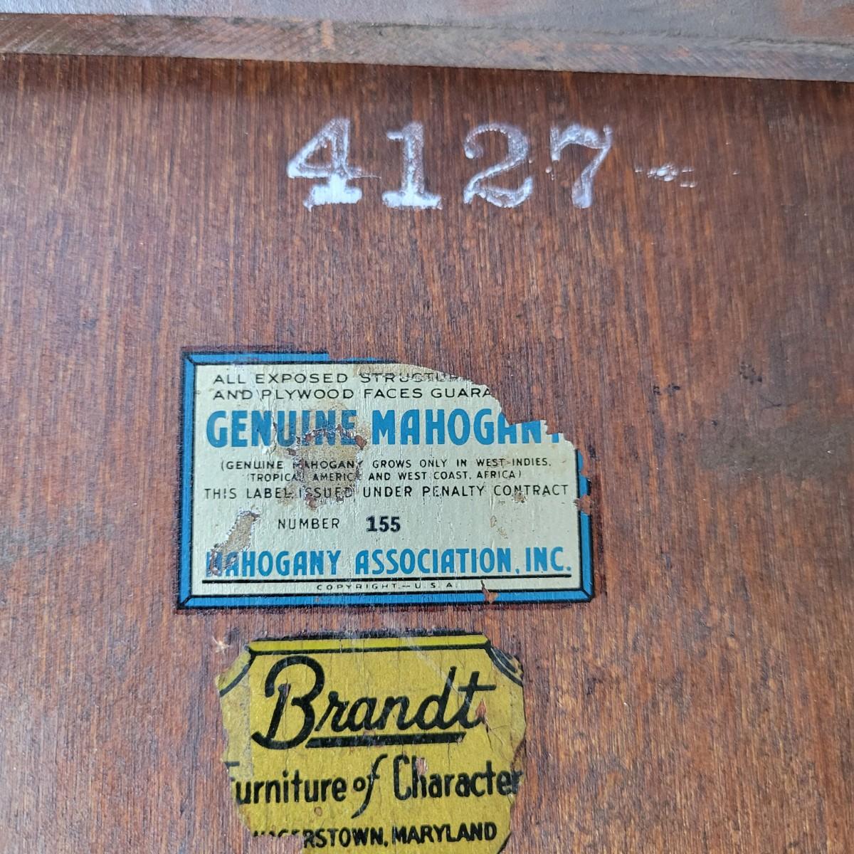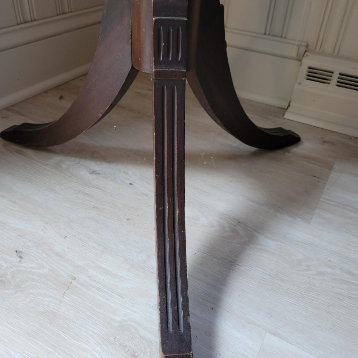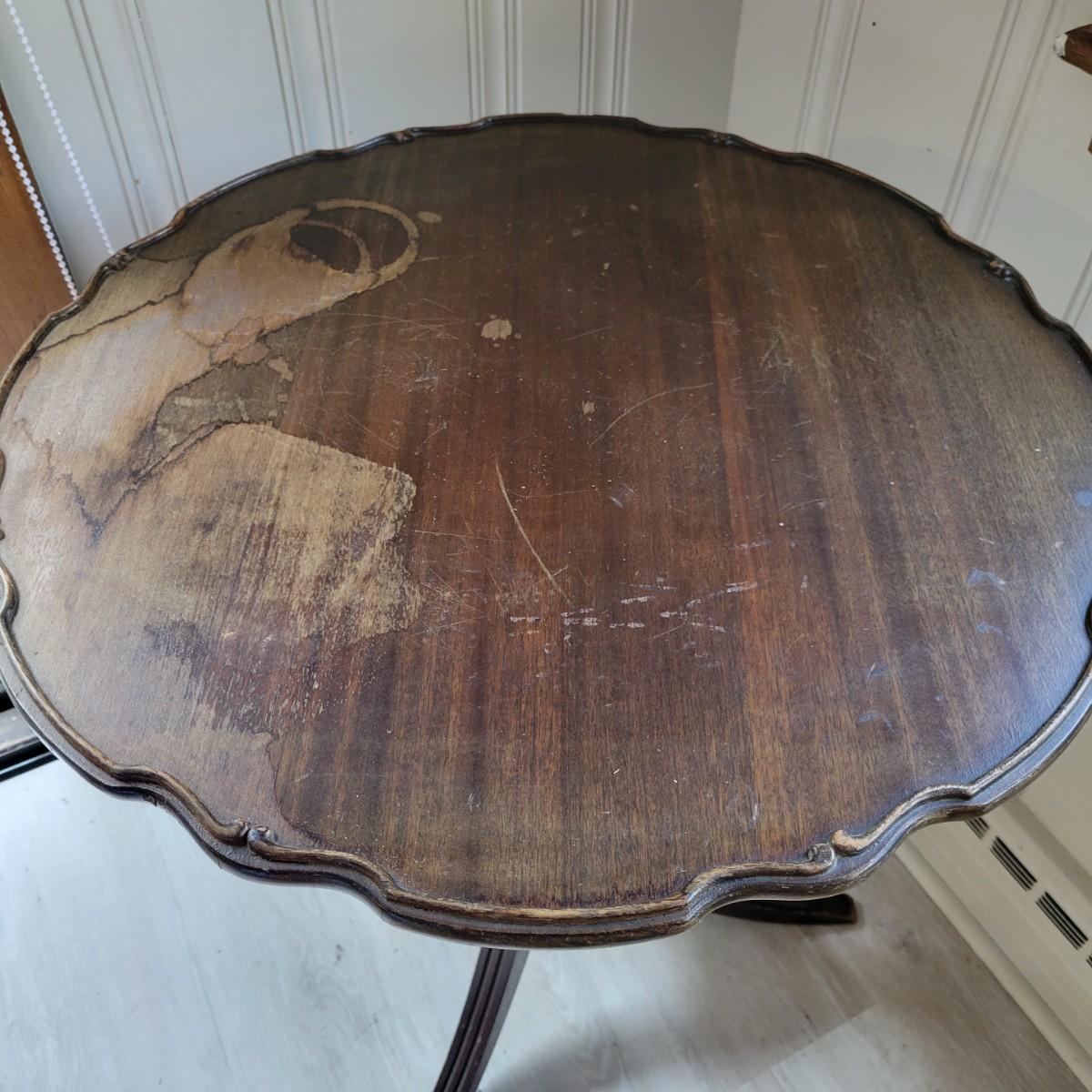 A vintage Brandt furniture George III style mahogany tea table in fair condition due to water stains, but could easily be refinished to give it new life. This table features scalloped pie edges and three feet with beautiful wood carvings. Measures approximately 23" x 27" Local pickup only
