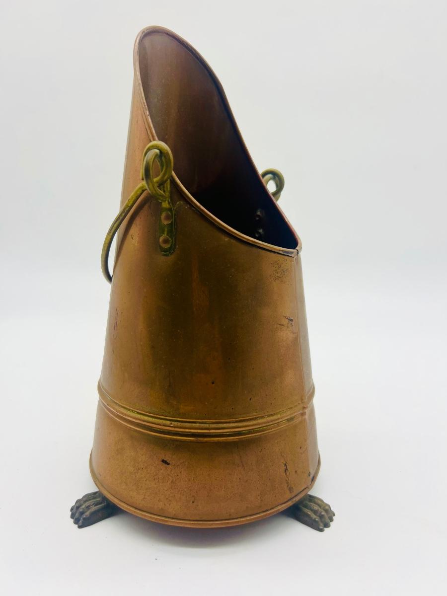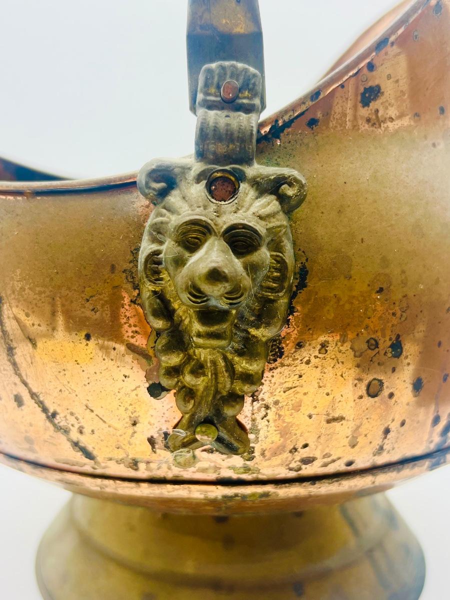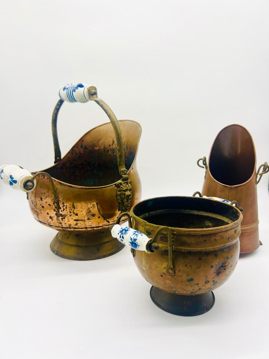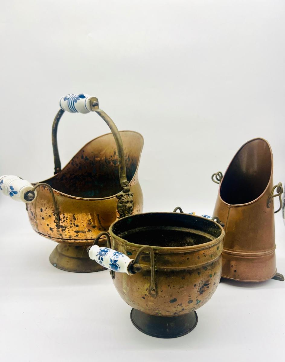 This are MUCH BIGGER THAN THEY APPEAR, read measurements! Early 20th Century lion head brass coal scuttle Ash bucket measures 13 1/2 tall Brass Cooper bucket 5 1/2 inches tall, Footed Brass Measures 10 1/2 inches tall.