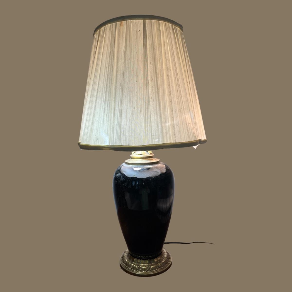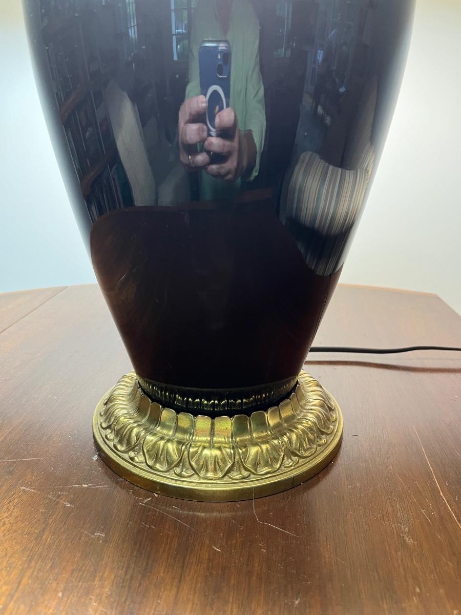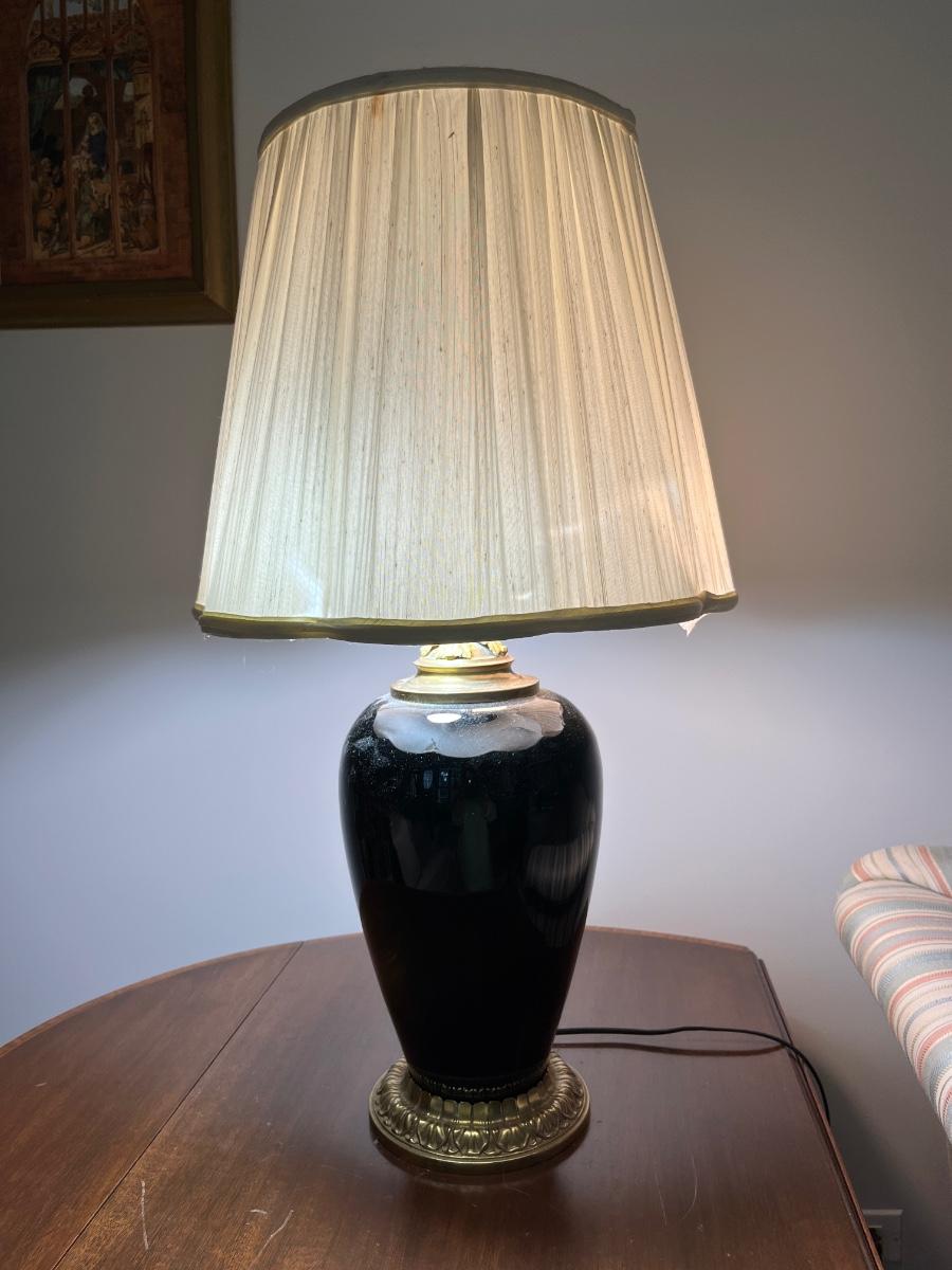 27"h x 16"w--very attractive black Steuben glass lamp with brass top and base. It's a lovely lamp but the shade needs to be replaced.