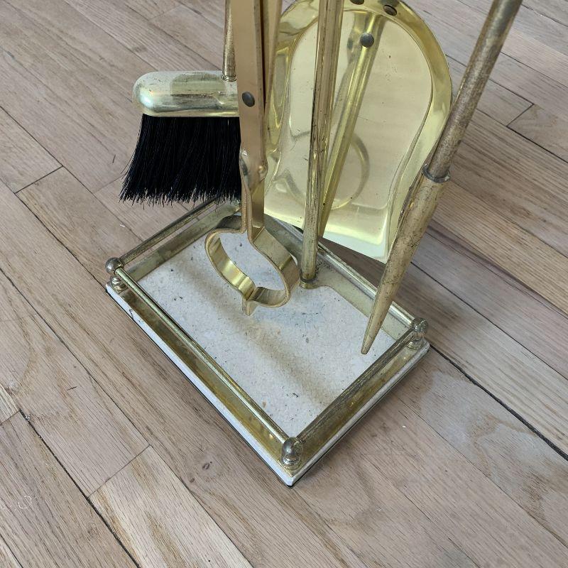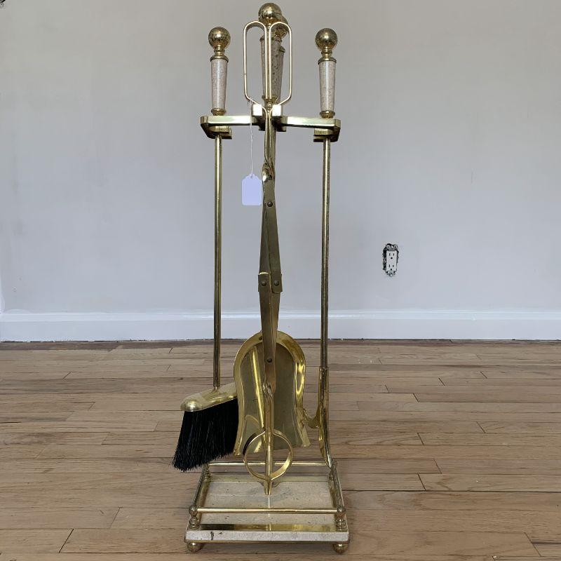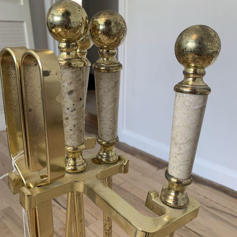 Brass and granite Fireplace Tool Set Consists of Tongs, Poker, Brush and Shovel with granite inlay on the handles and base. This is a beautiful set with soft usage. Loving wear to go along with its age.