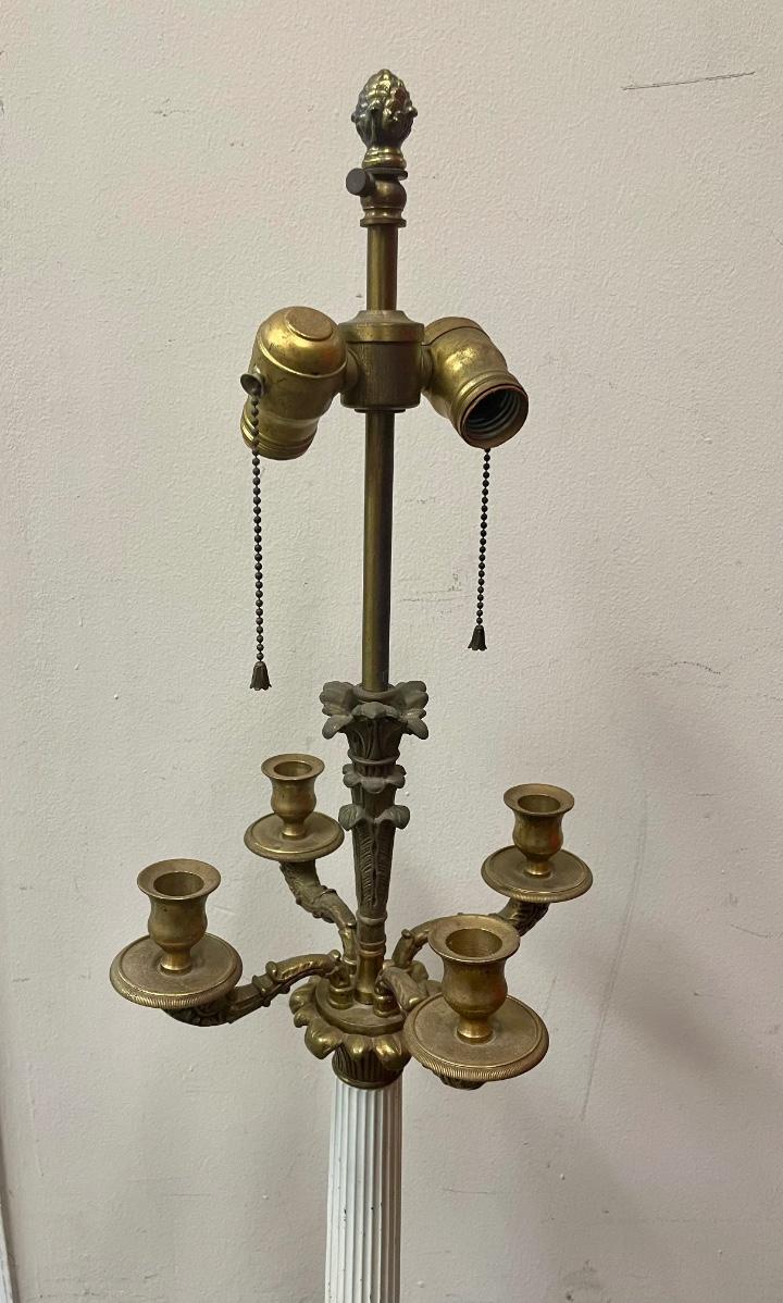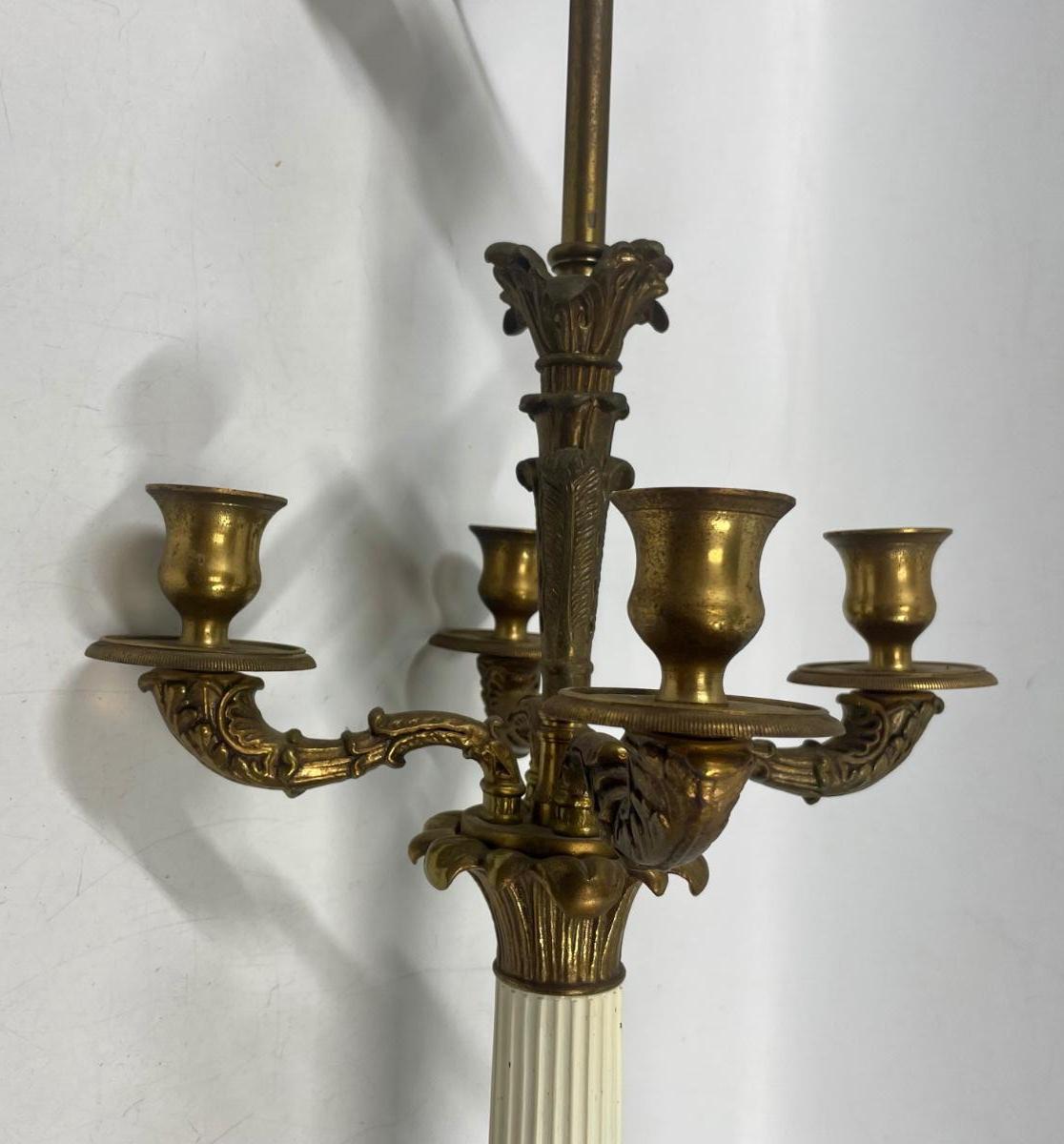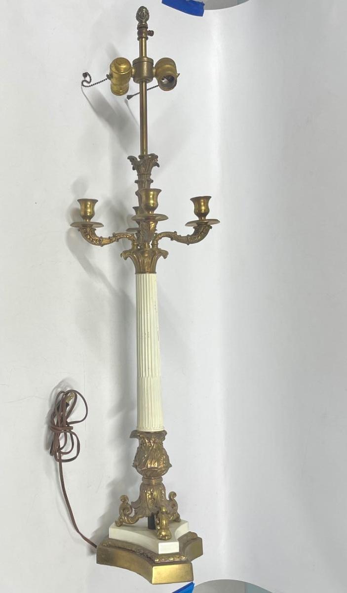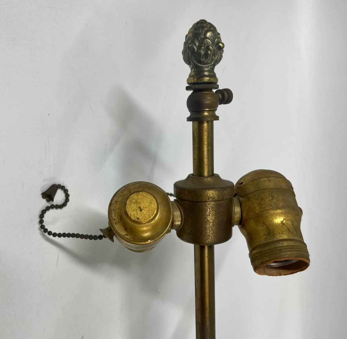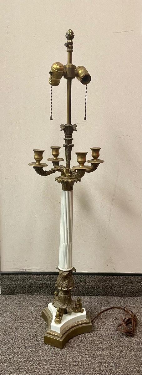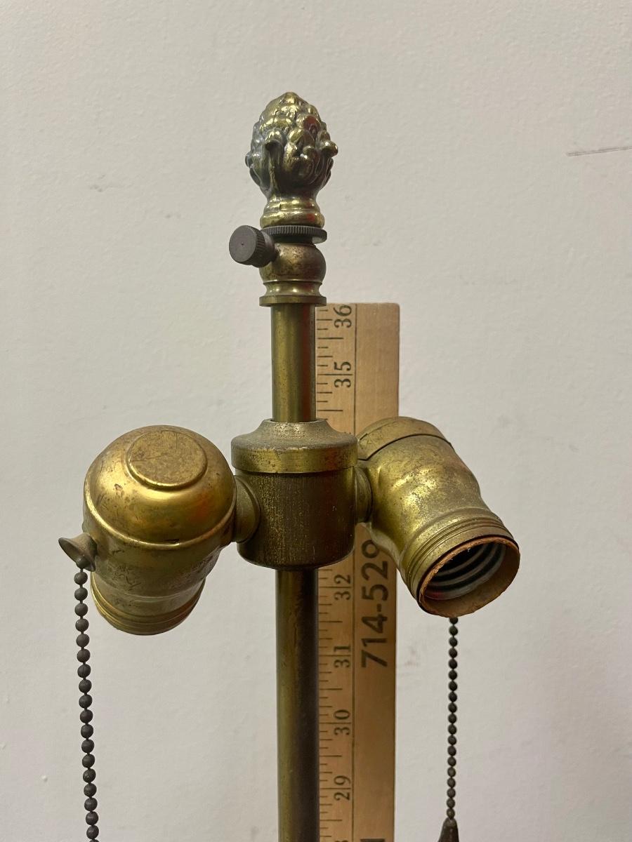 Table lamp has 2 sockets with individual pull chains. Tested, both sockets work smoothly. Does not have a shade. Candelabra for 4 candles in middle section of lamp. Approx. 38” tall.