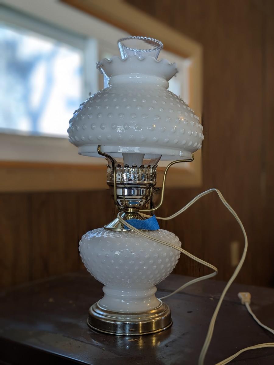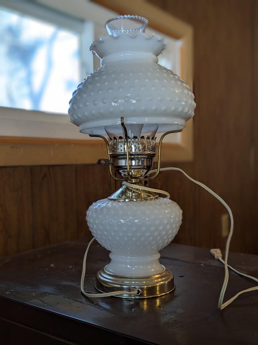 Vintage Brass Base Table Lamp Diamond Quilted Milk Glass Shade Hurricane