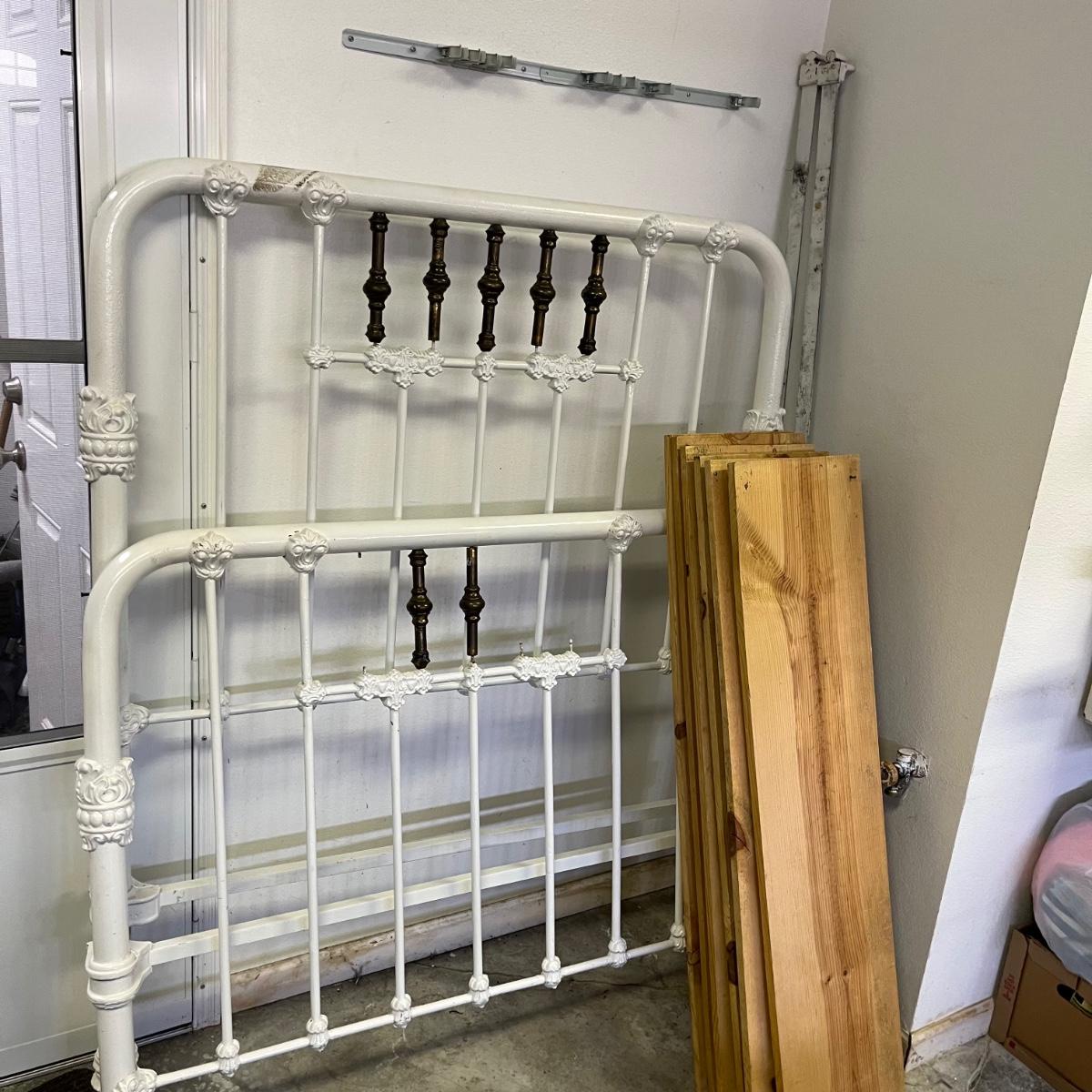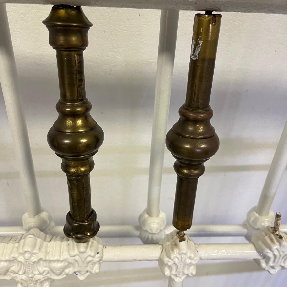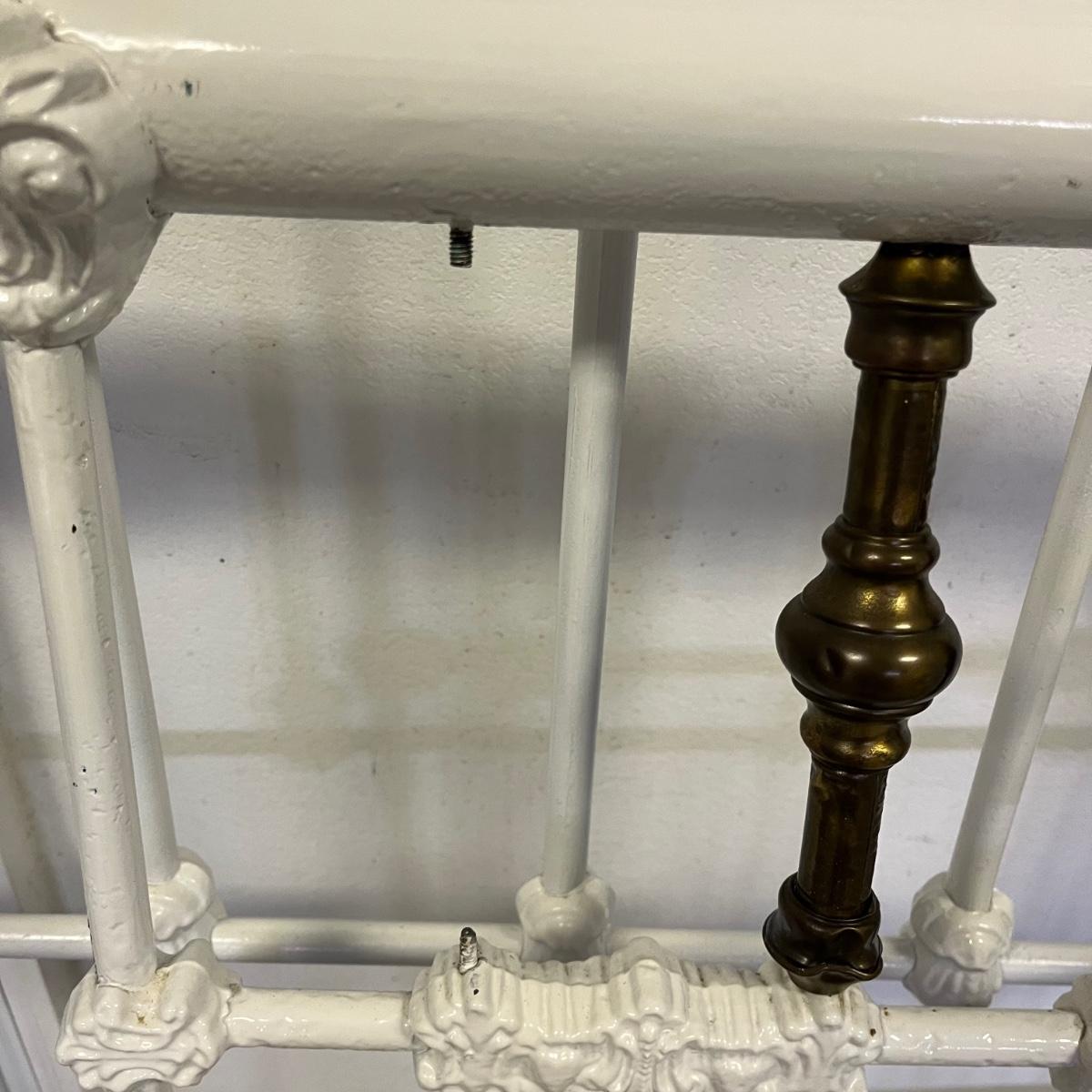 Lot contains a vintage brass bed that includes headboard, footboard rails and wood for mattress. Footboard is missing a few pieces from the middle and headboard is missing one wheel, see pictures. Bring help item is substantial. Headboard measures 50” x 60”, footboard measures 50” x 42” and the rail measure 74” long.