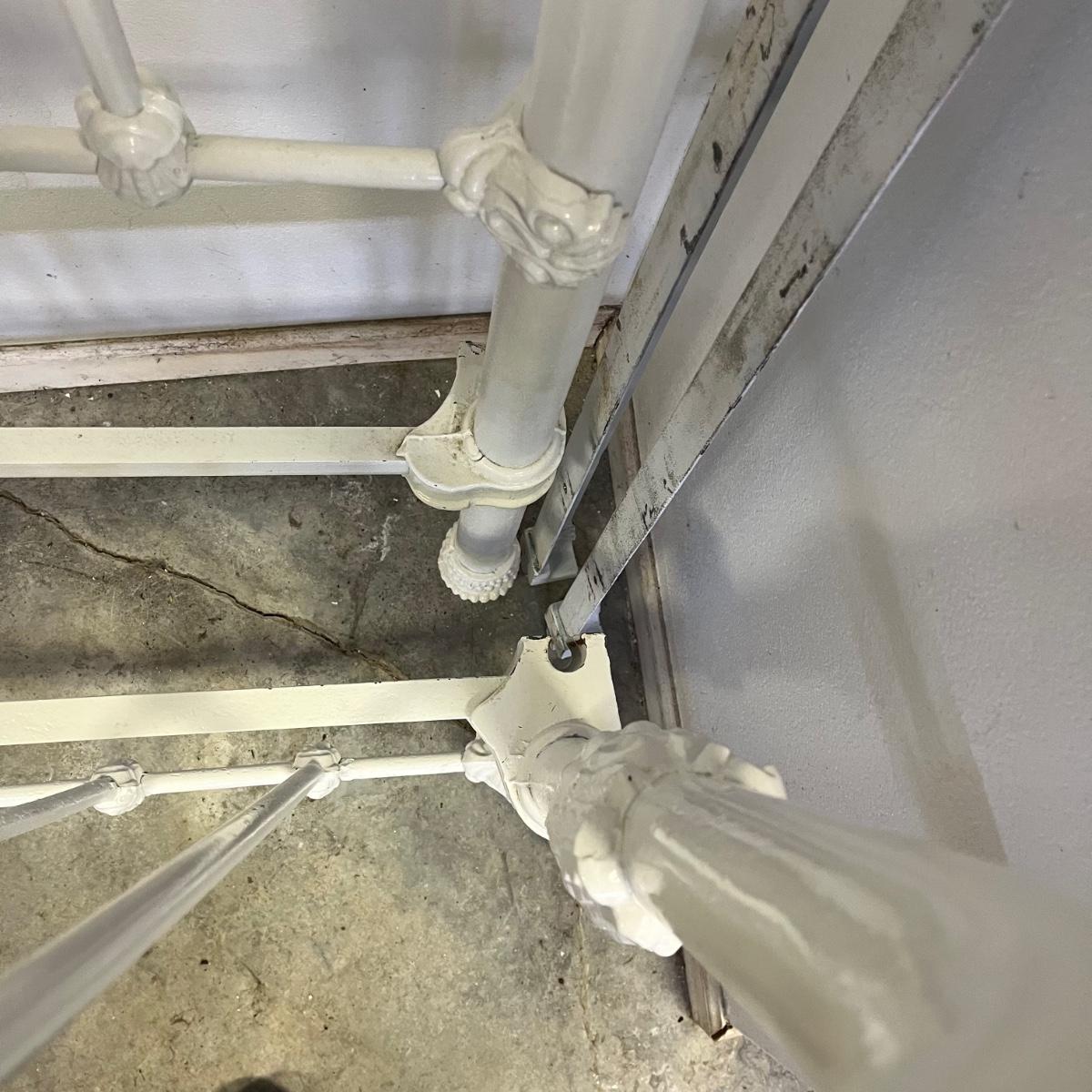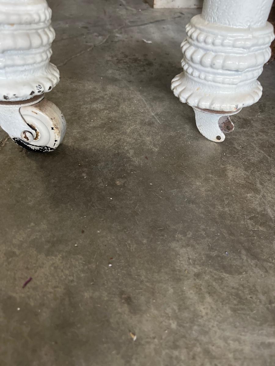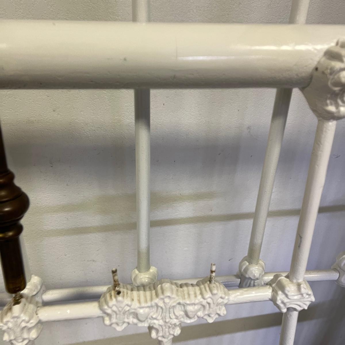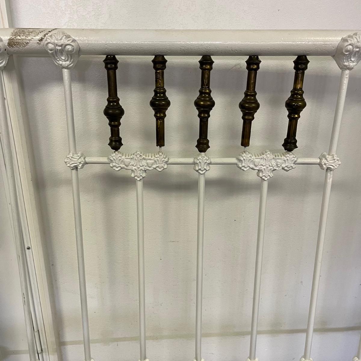 Lot contains a vintage brass bed that includes headboard, footboard rails and wood for mattress. Footboard is missing a few pieces from the middle and headboard is missing one wheel, see pictures. Bring help item is substantial. Headboard measures 50” x 60”, footboard measures 50” x 42” and the rail measure 74” long.