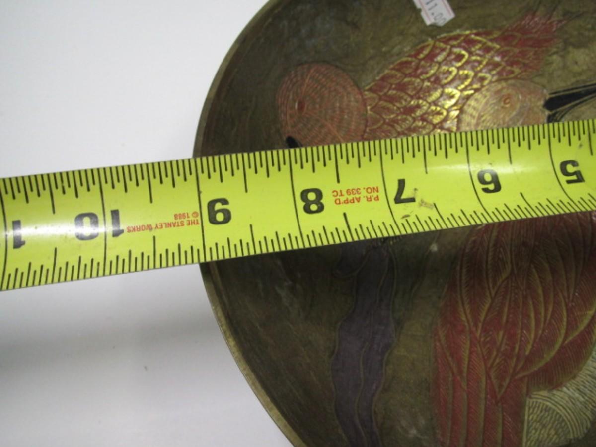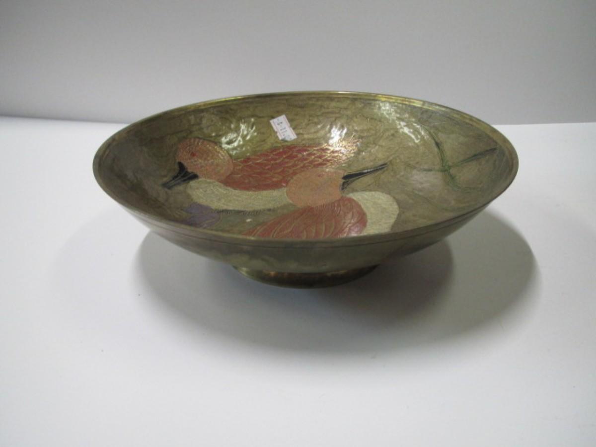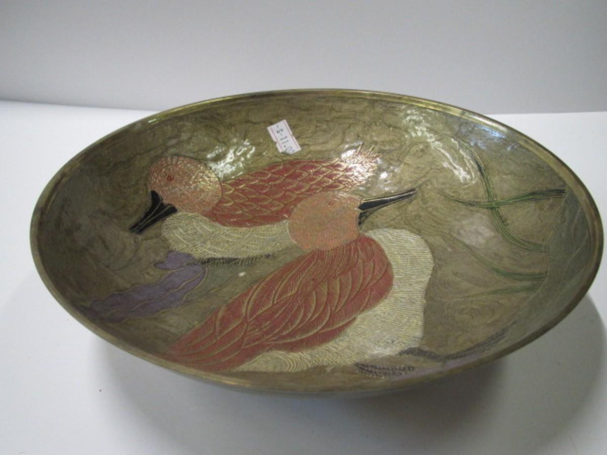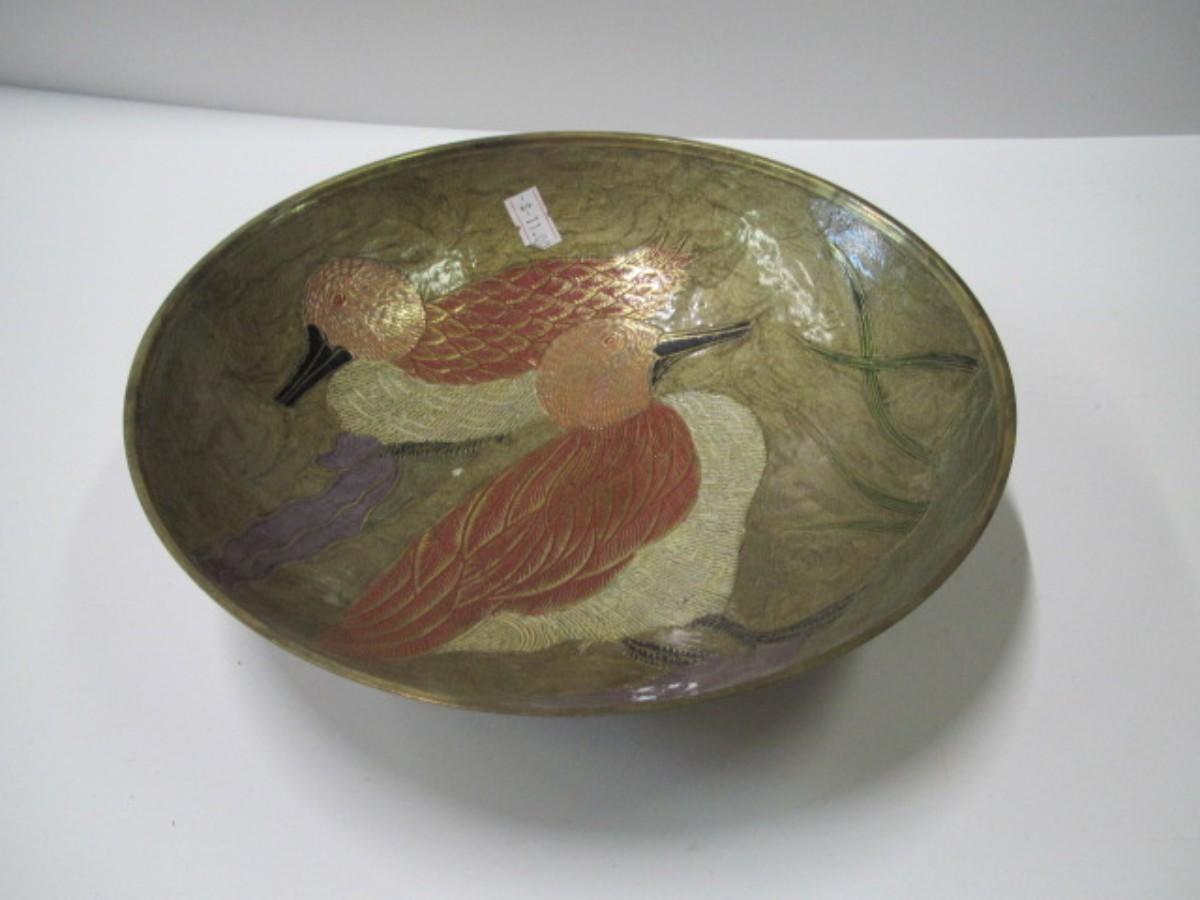 Vintage Brass Bowl With Enameled Birds Approx 9"