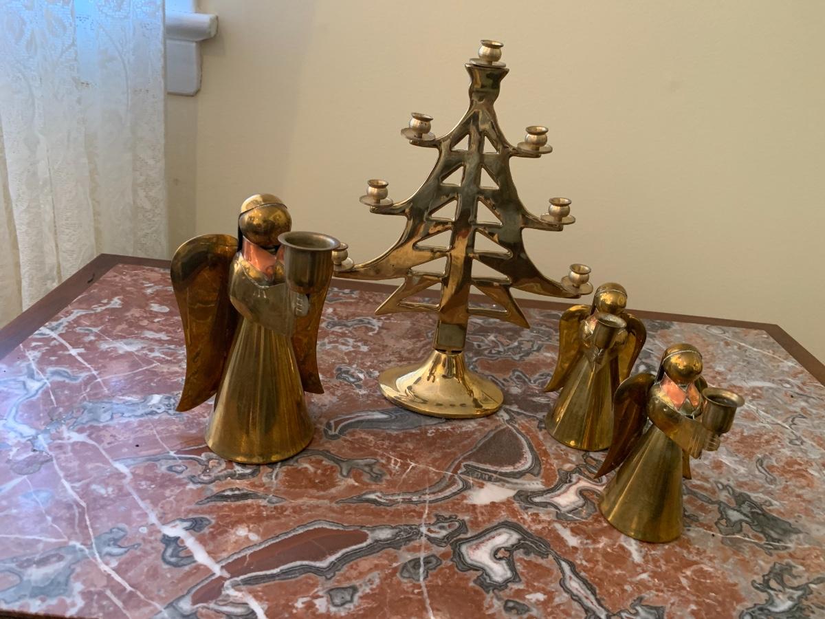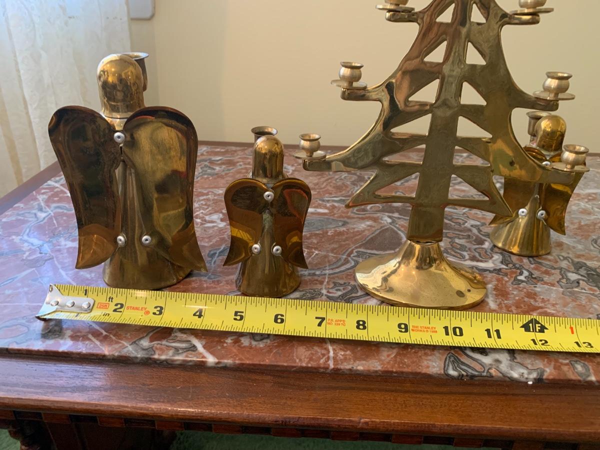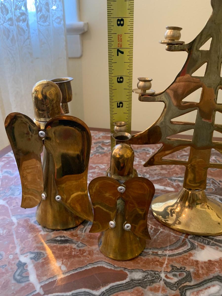 Christmas tree taper candle holder and 1 larger angel candle holder, 2 smaller.