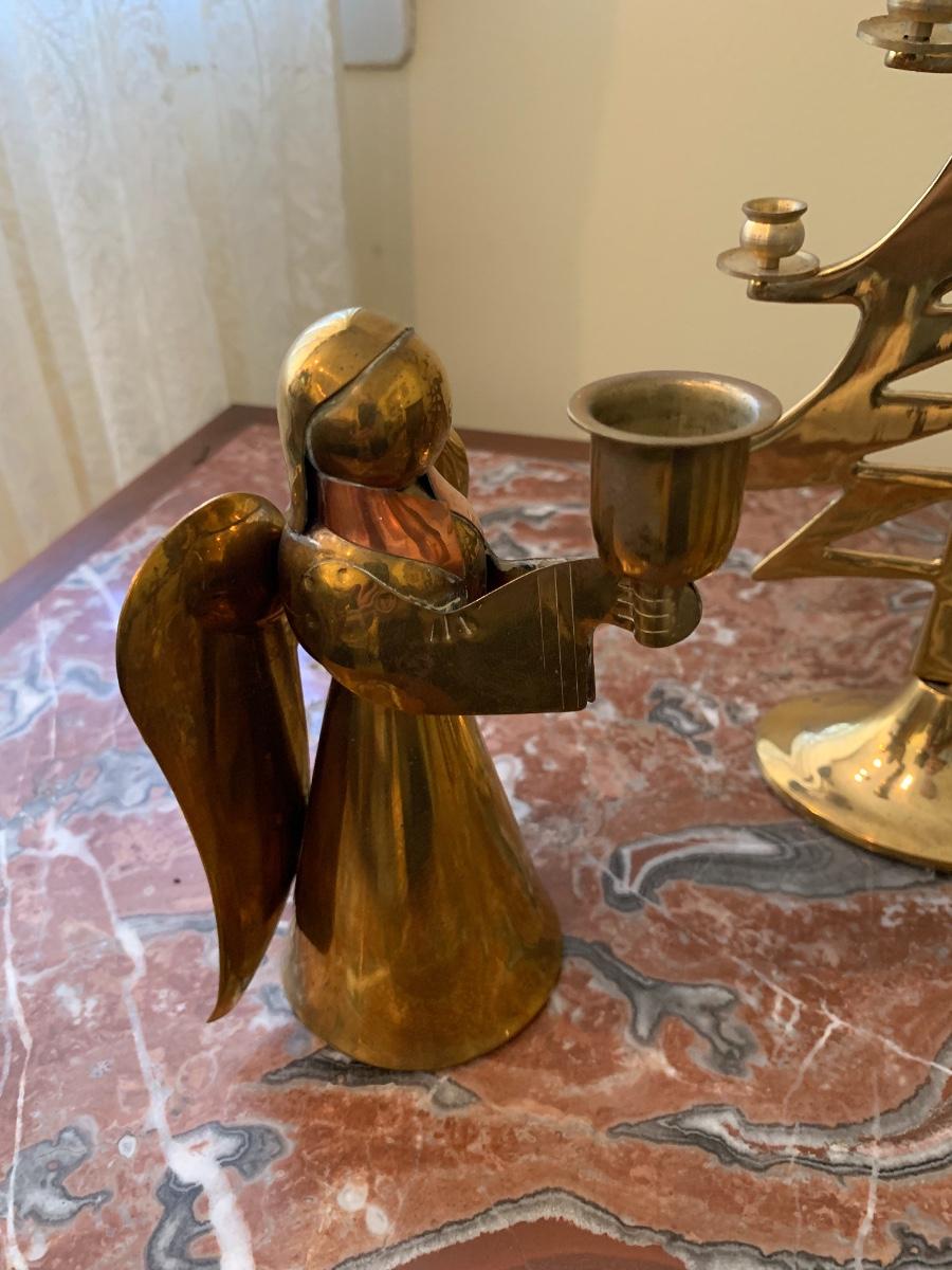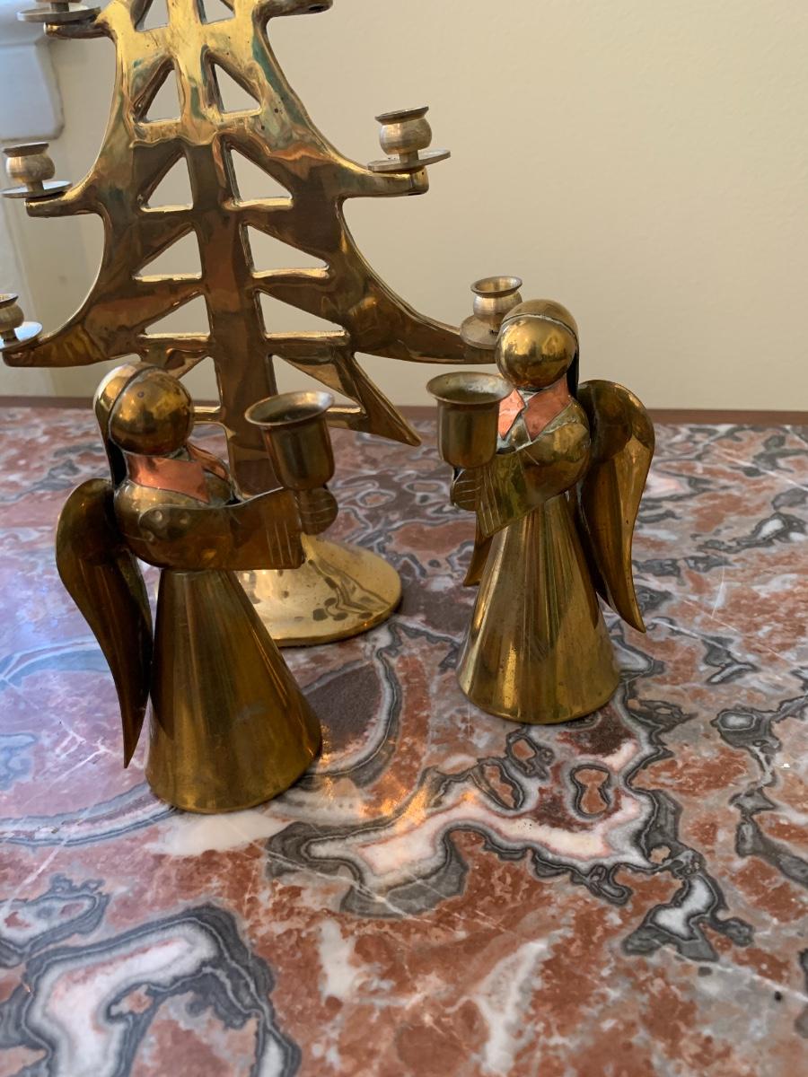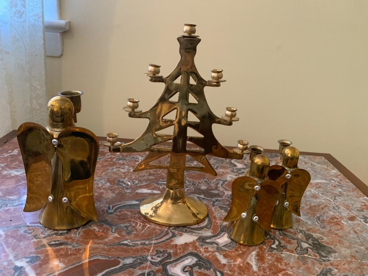 Christmas tree taper candle holder and 1 larger angel candle holder, 2 smaller.