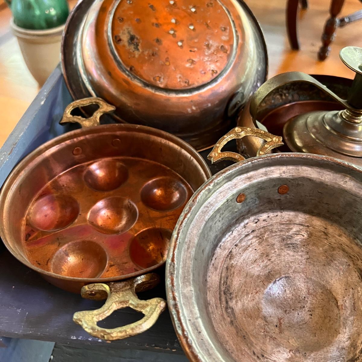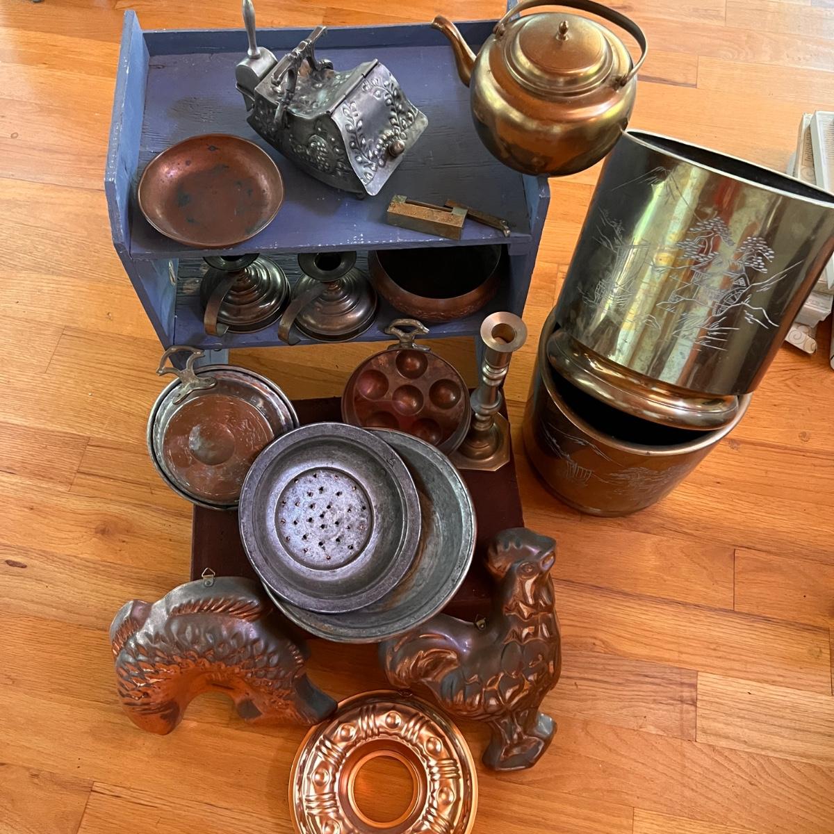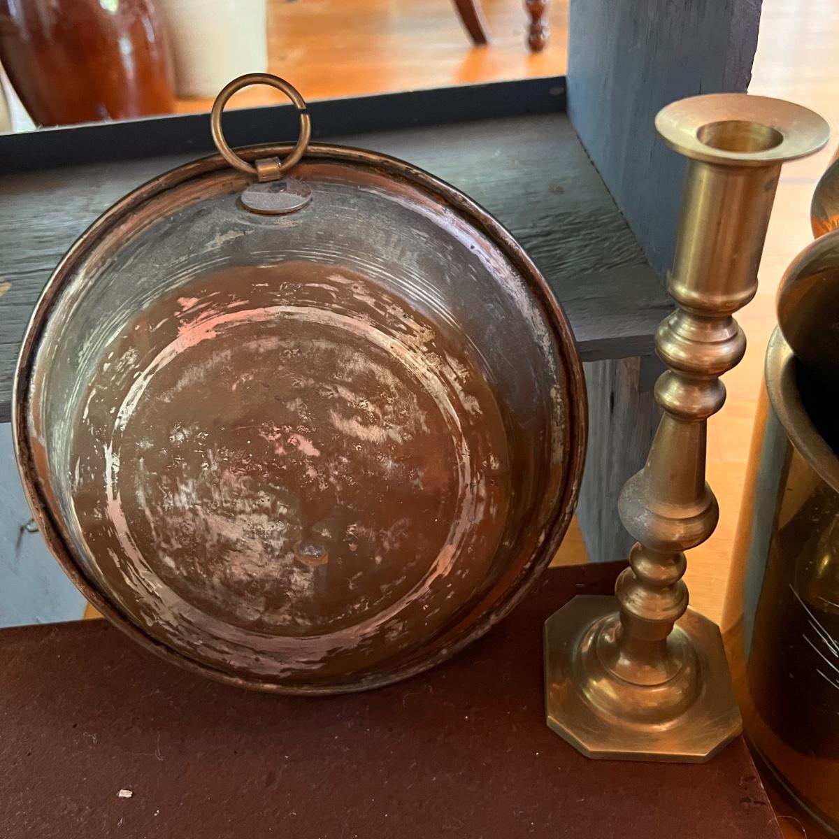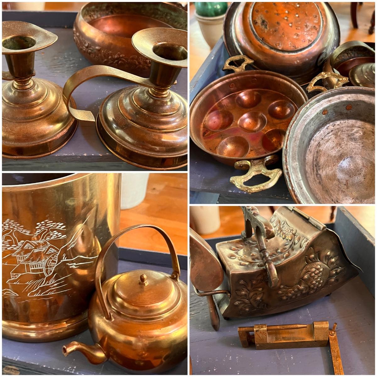 Antique ash coal scuttle, 2 brass planters, Traditional Chinese antique lock brass engraved padlock with key, MCM Chamber Candle Stick Holders with Finger Ring Pair, decorative copper bowls, 4 antique copper pans/egg poacher/strainer, copper tea pot, cake tins.