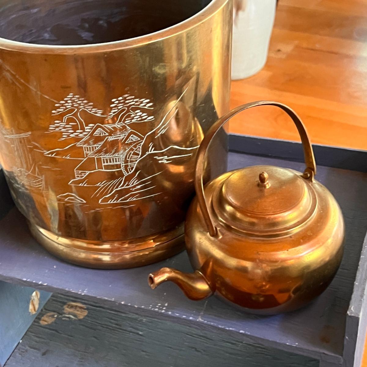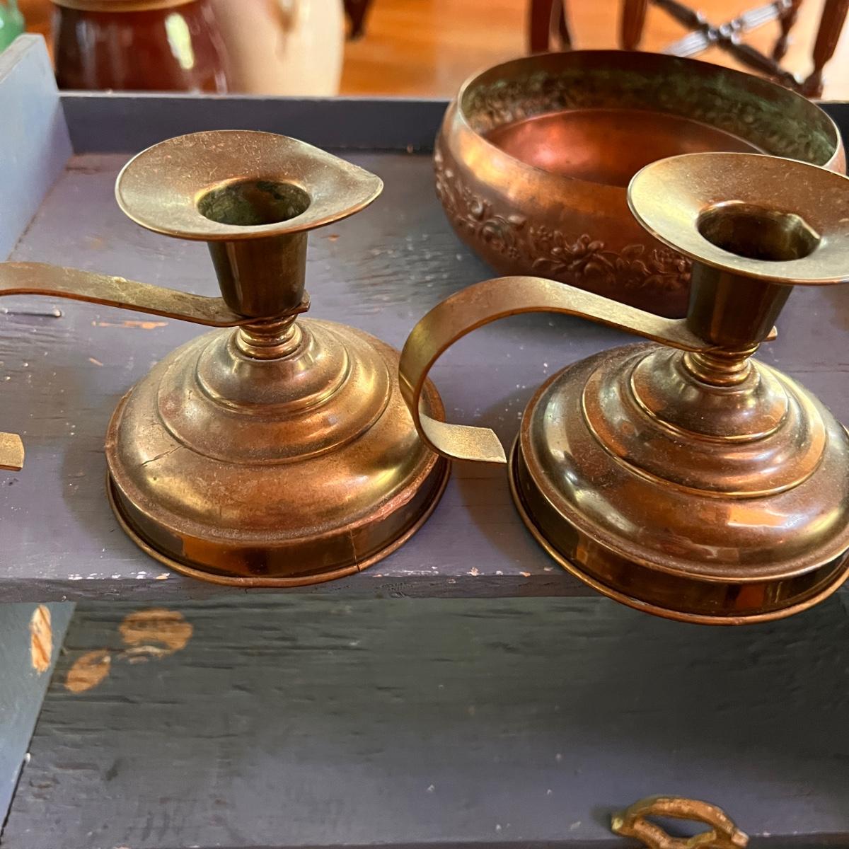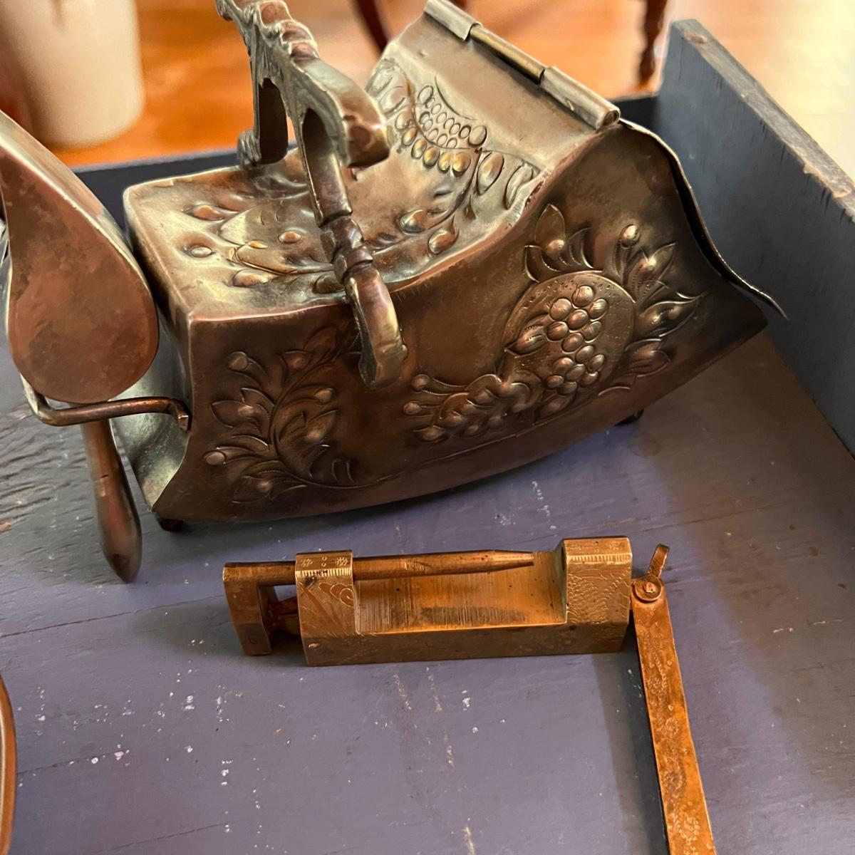 Antique ash coal scuttle, 2 brass planters, Traditional Chinese antique lock brass engraved padlock with key, MCM Chamber Candle Stick Holders with Finger Ring Pair, decorative copper bowls, 4 antique copper pans/egg poacher/strainer, copper tea pot, cake tins.