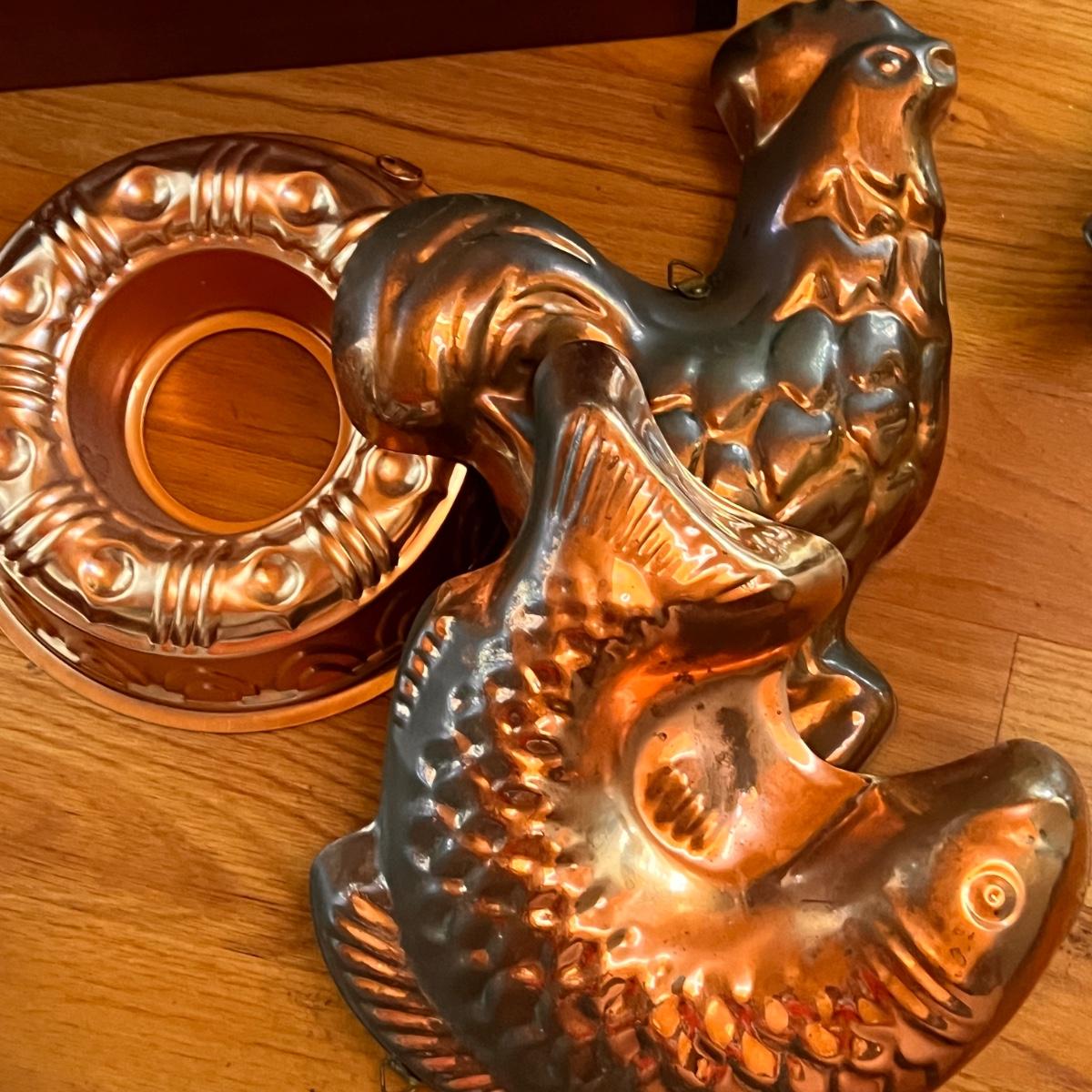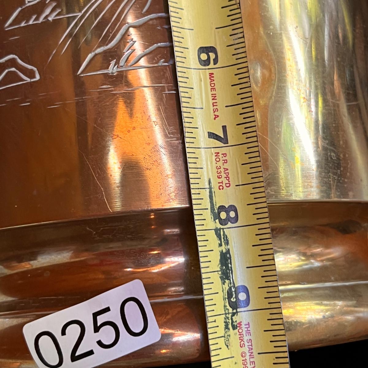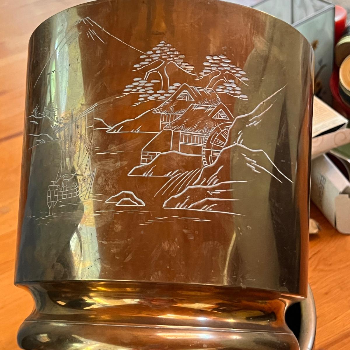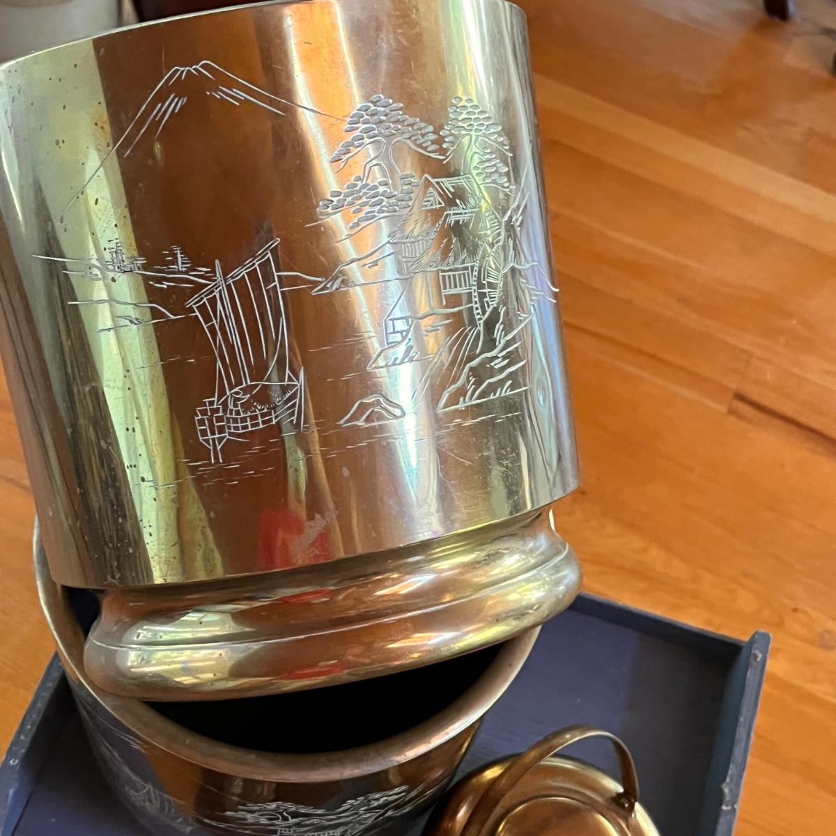 Antique ash coal scuttle, 2 brass planters, Traditional Chinese antique lock brass engraved padlock with key, MCM Chamber Candle Stick Holders with Finger Ring Pair, decorative copper bowls, 4 antique copper pans/egg poacher/strainer, copper tea pot, cake tins.