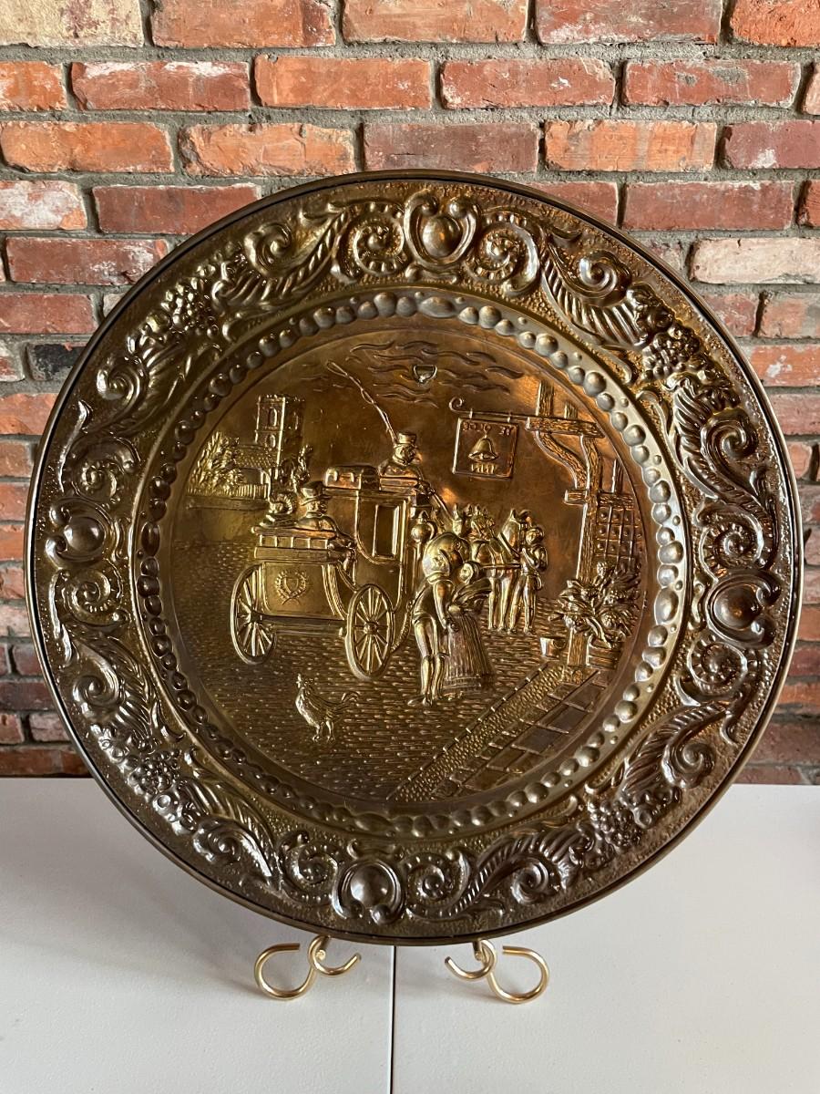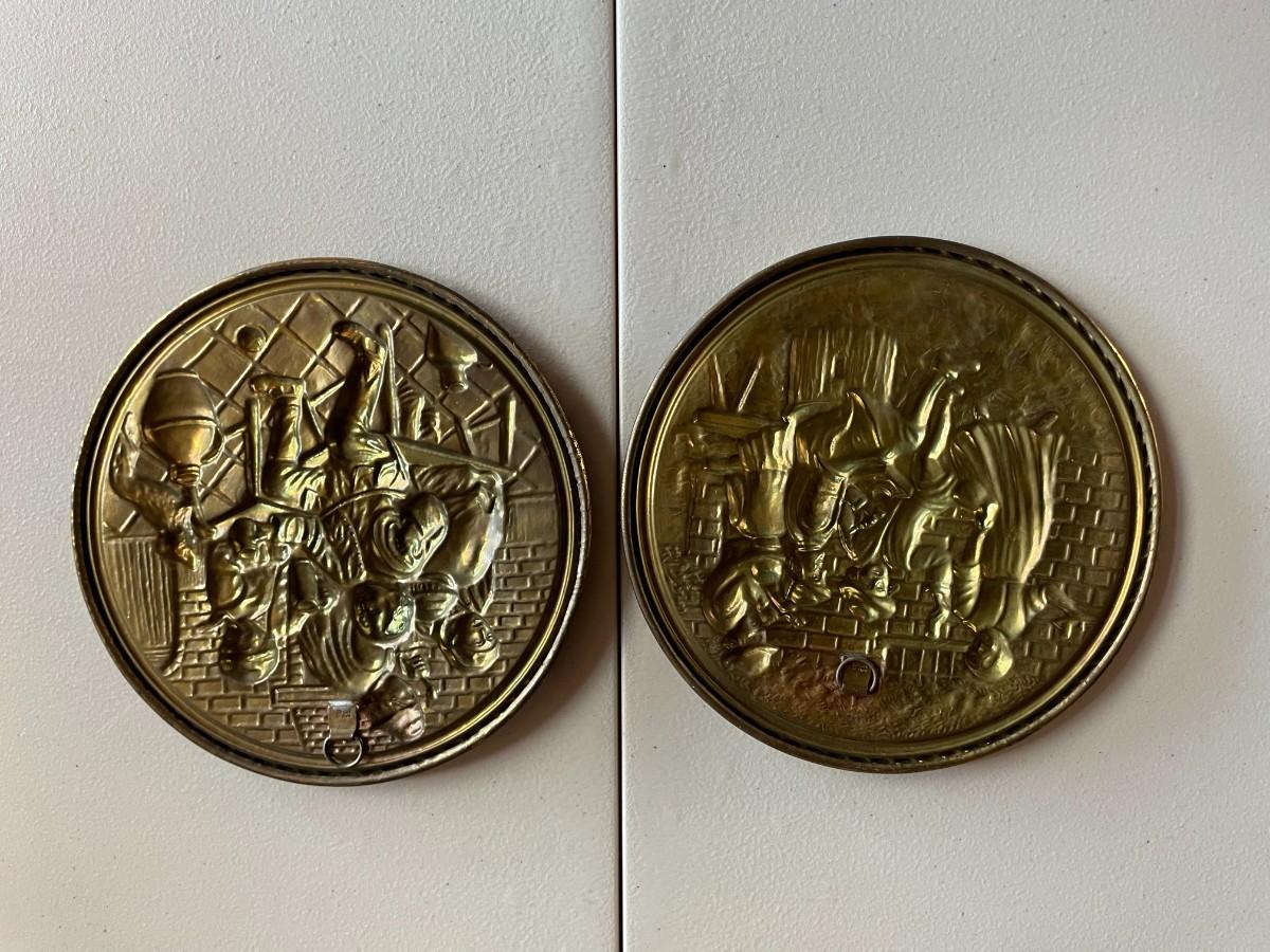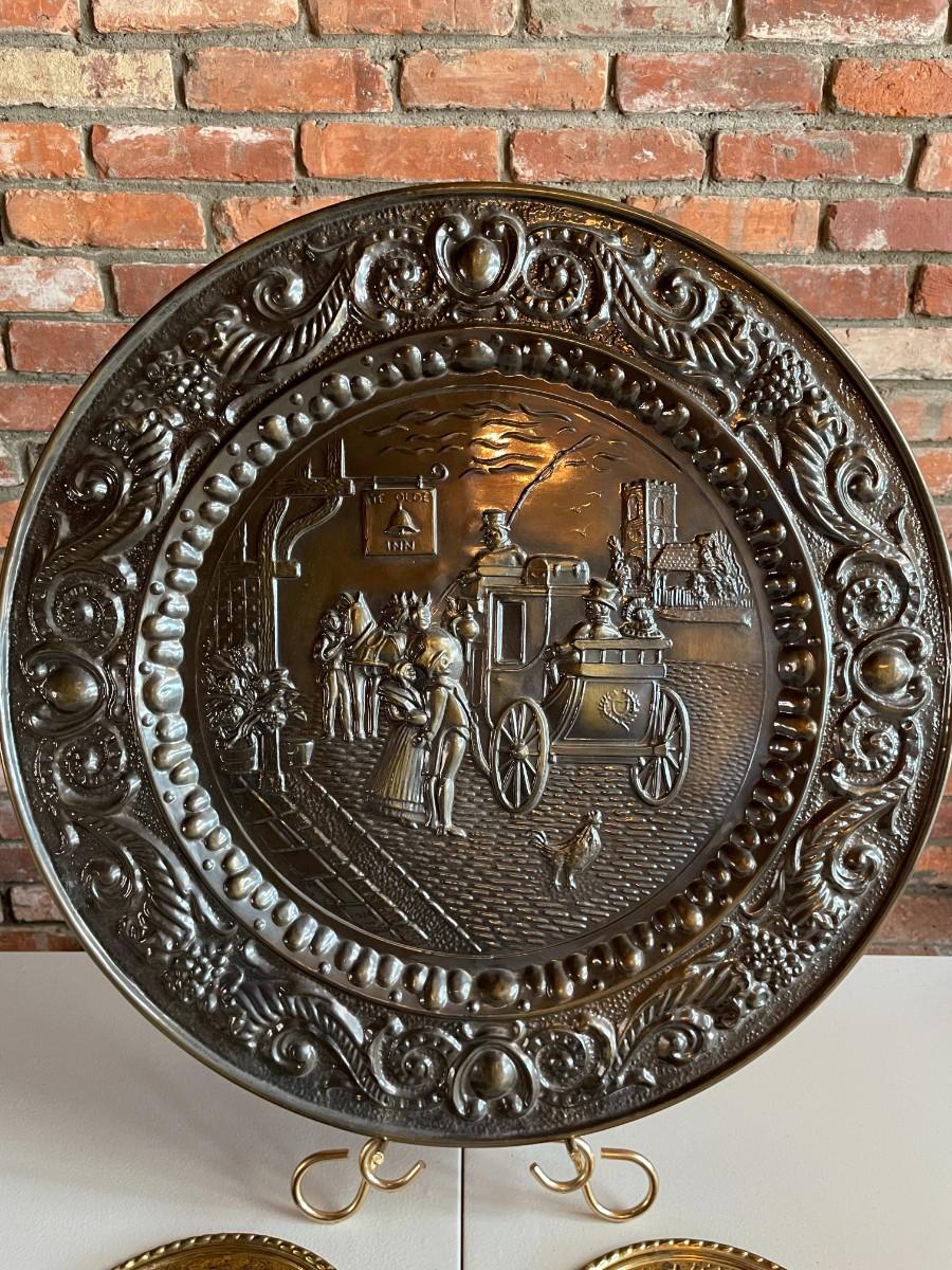 Lot includes one large and 2 small brass plates. Larger plate is 22”. Smaller ones are: 8”.