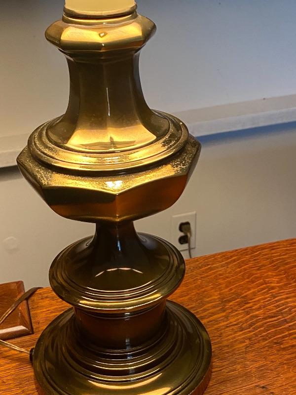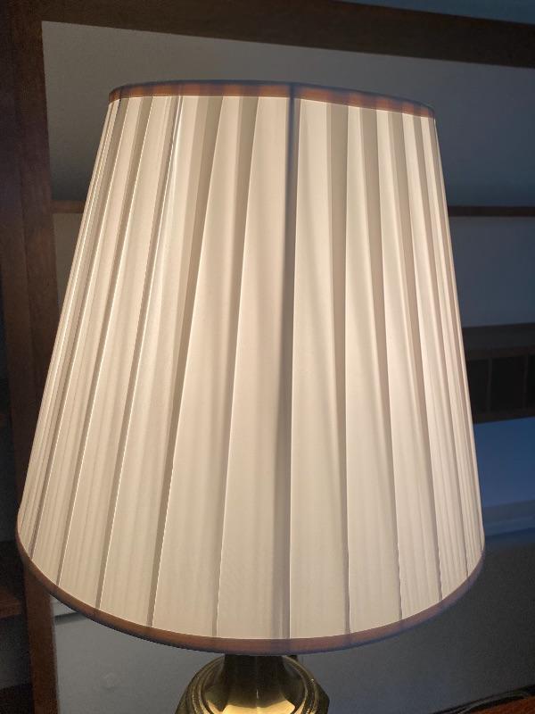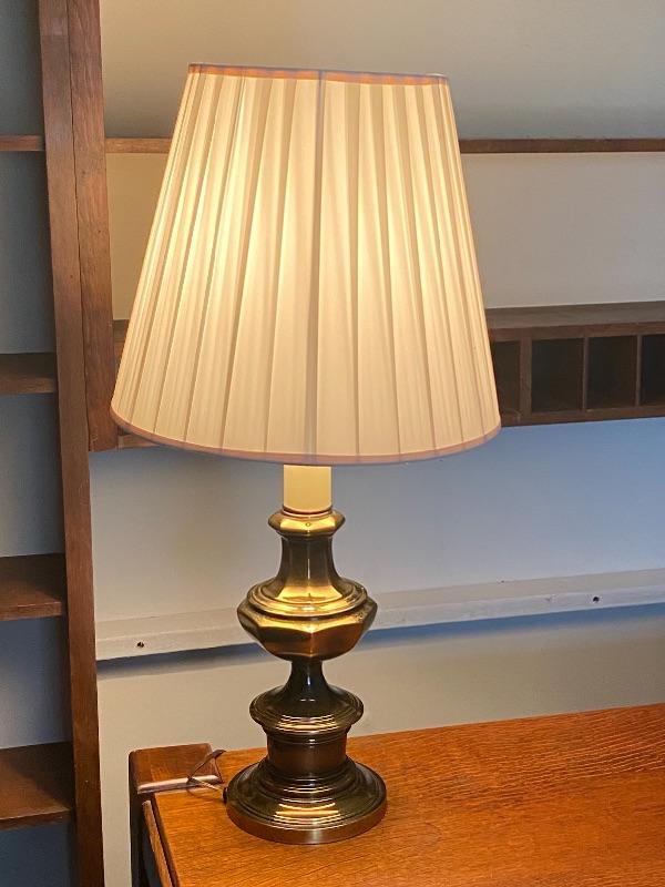 Solid Brass Desk Lamp with hexagon shapes and cream pleated shade.