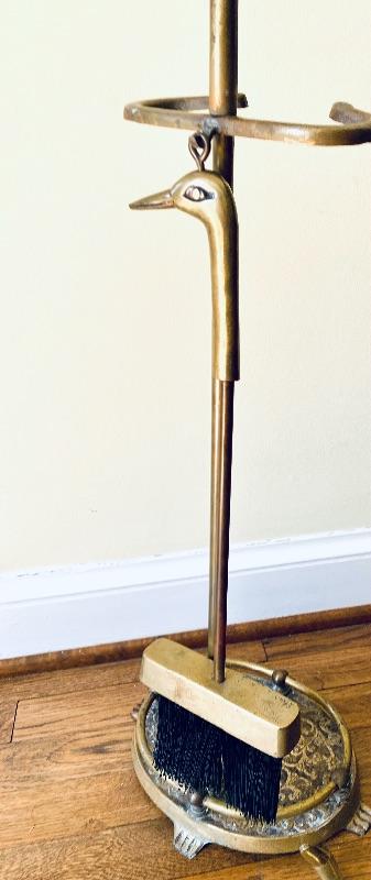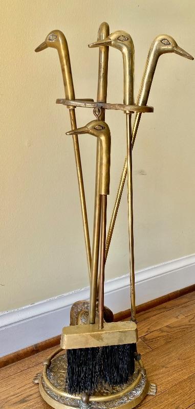 Vintage brass 6-piece fireplace tools with duck head tops. Includes broom, 2 shovels, poker, and oval base. Barely any sign of use on broom bristles and shovels.