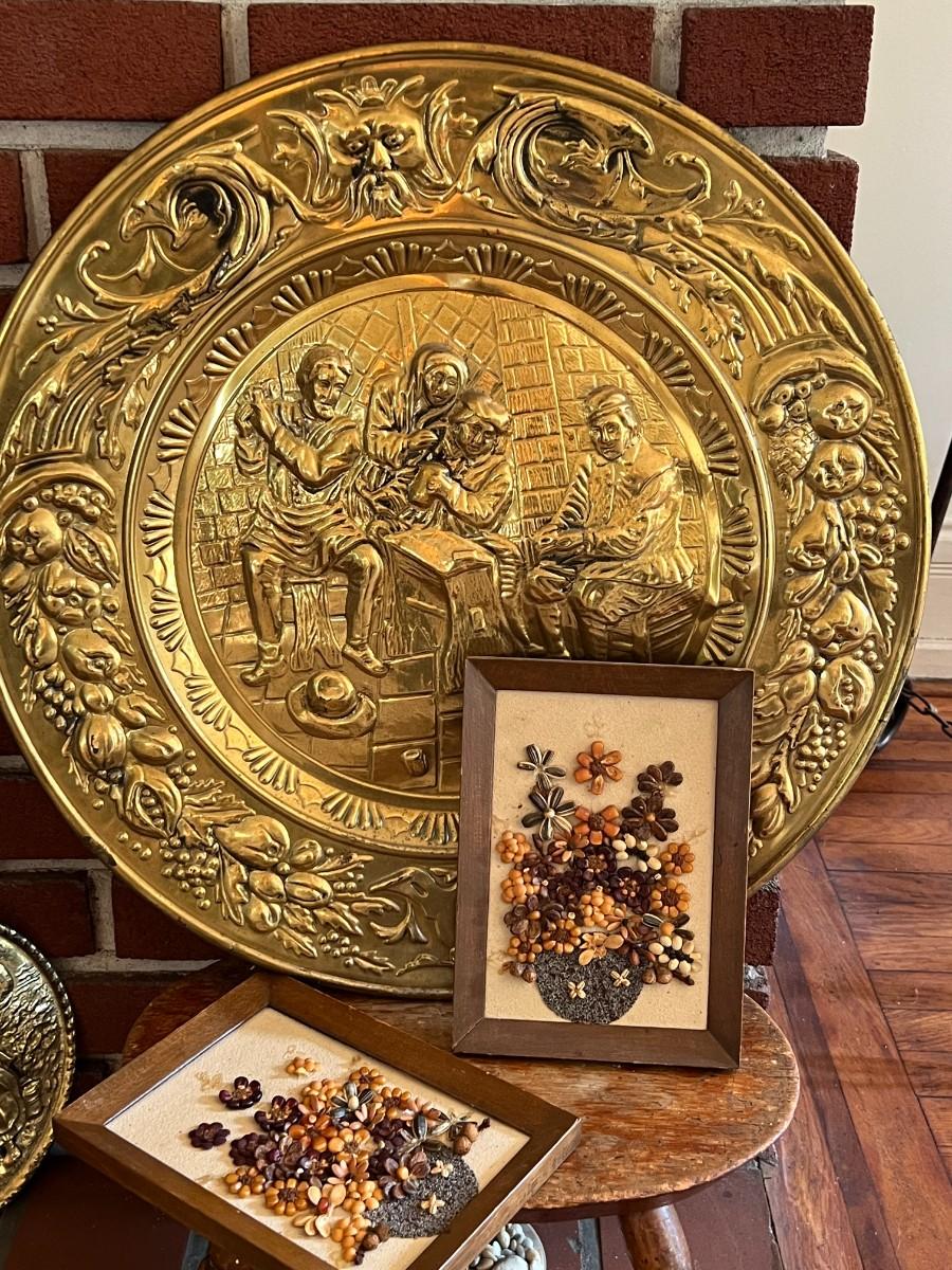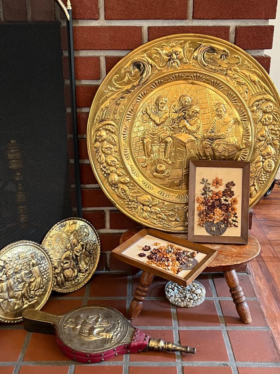 Vintage Brass Embossed Plates and Fireplace Bellow Lot