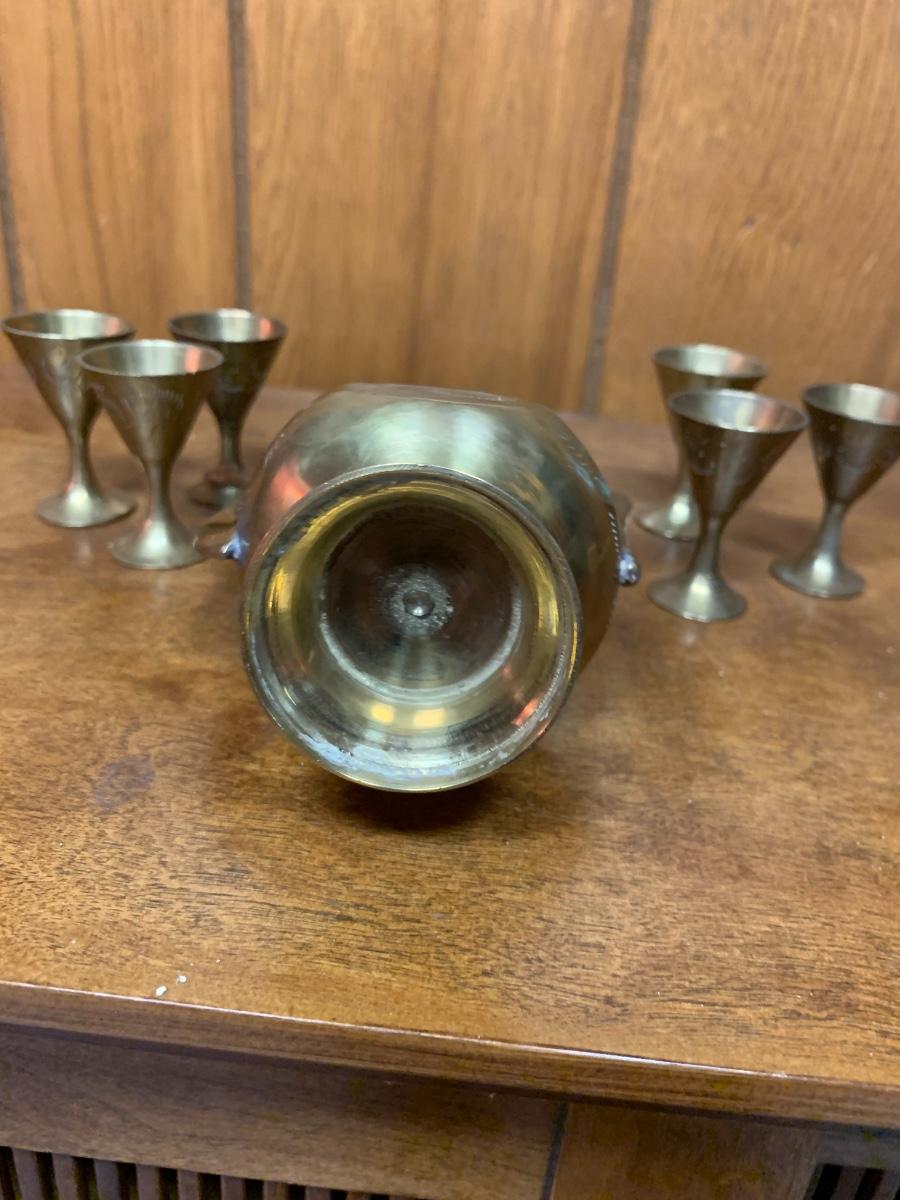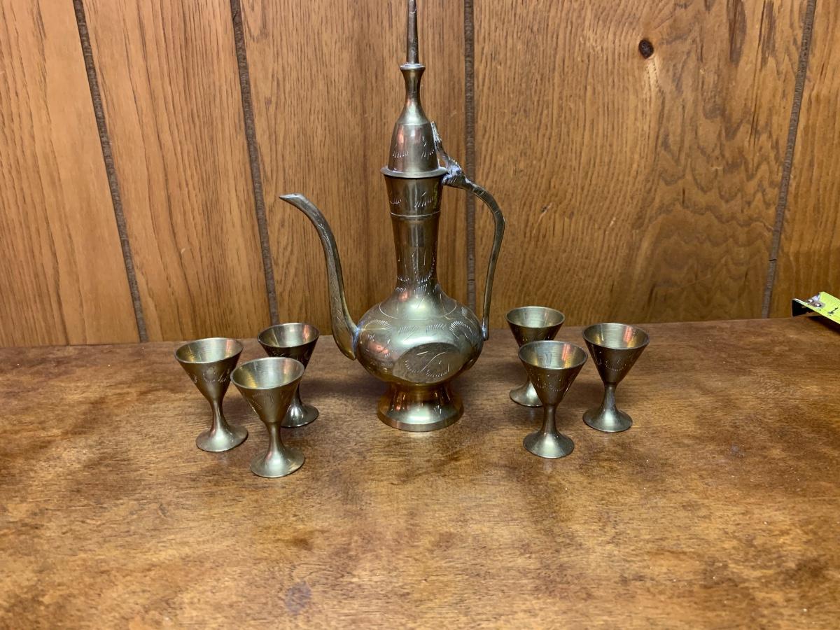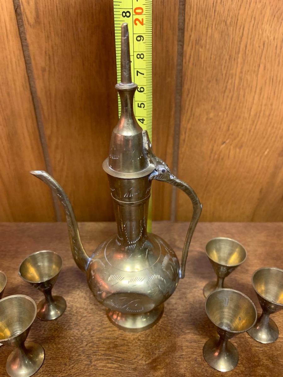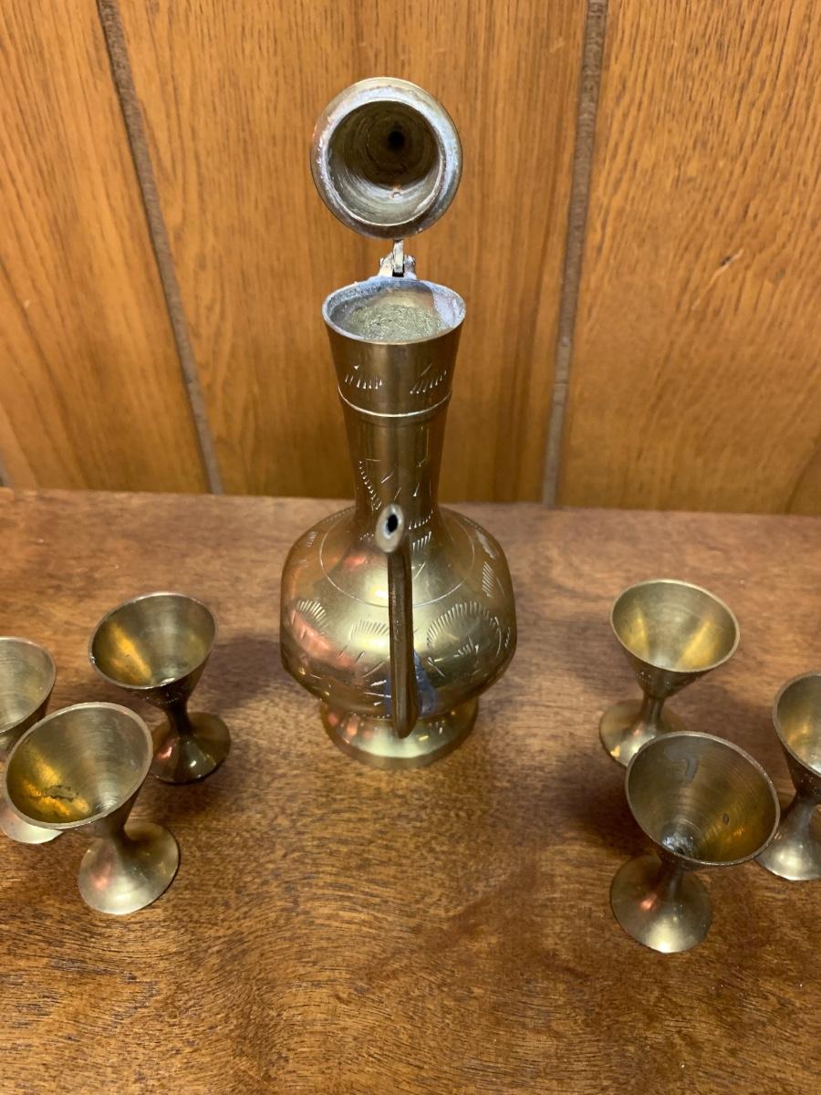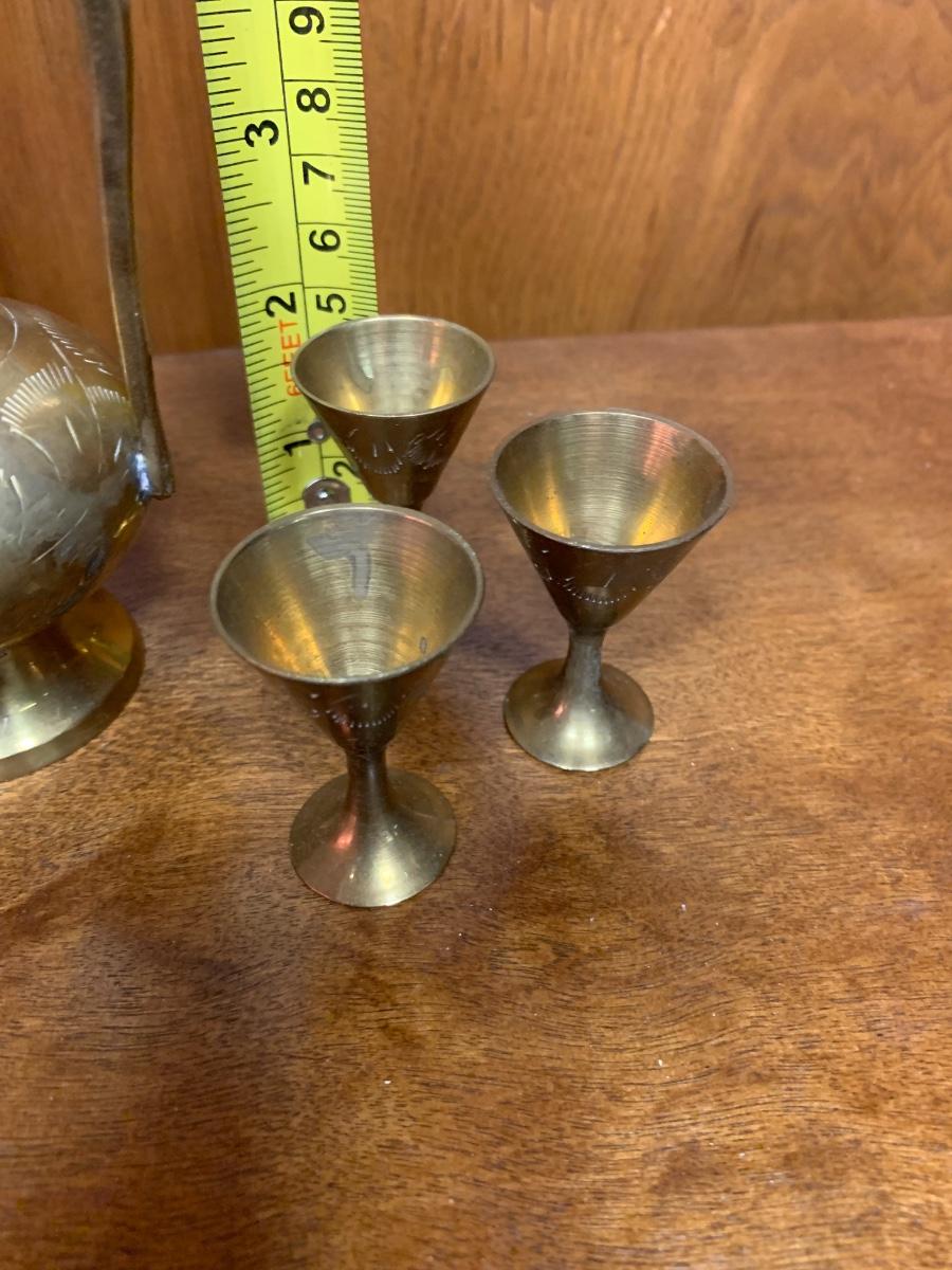 Vintage 8" brass ewer wtih tiny cups. Decorative.