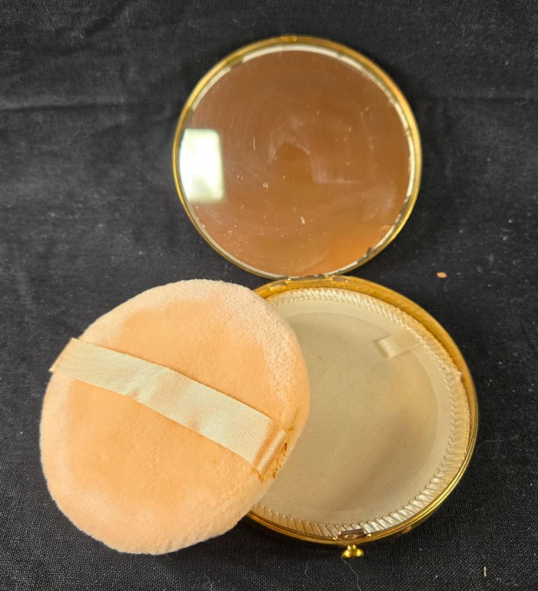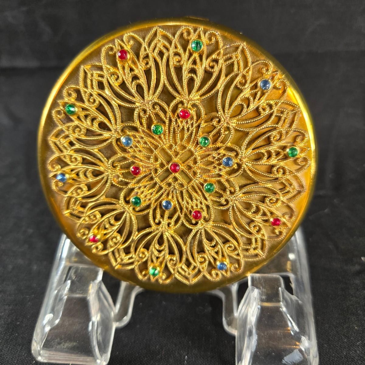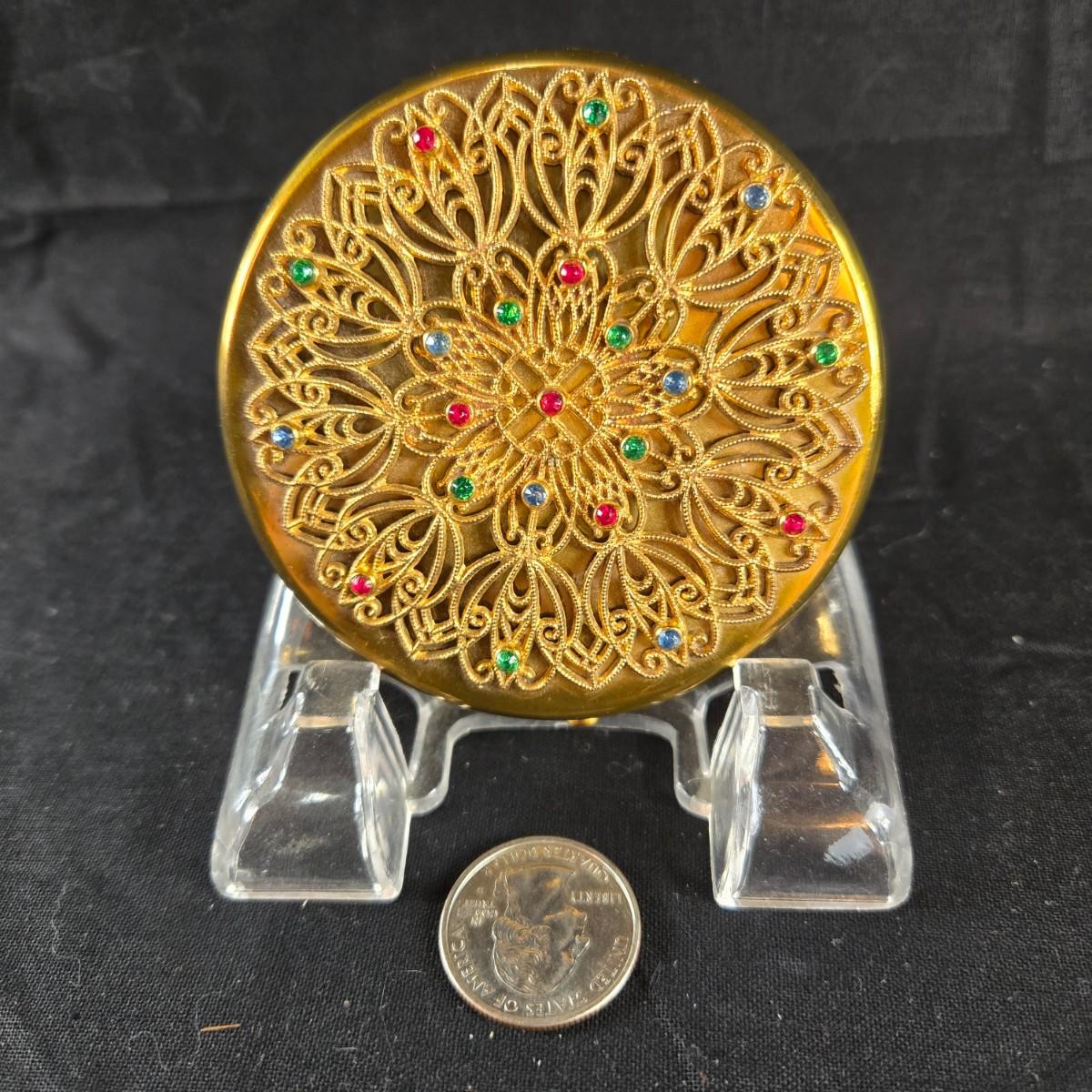 This auction lot is for a Vintage Brass Filigree with Jewels Compact. This is a beautiful ladies compact. The filigree is very nice and it has all the adorned glass jewels. The opener is a push button. The mirror on the inside shows age. It contains no powder. No makesr name. It measures about 3.25-inches in diameter.