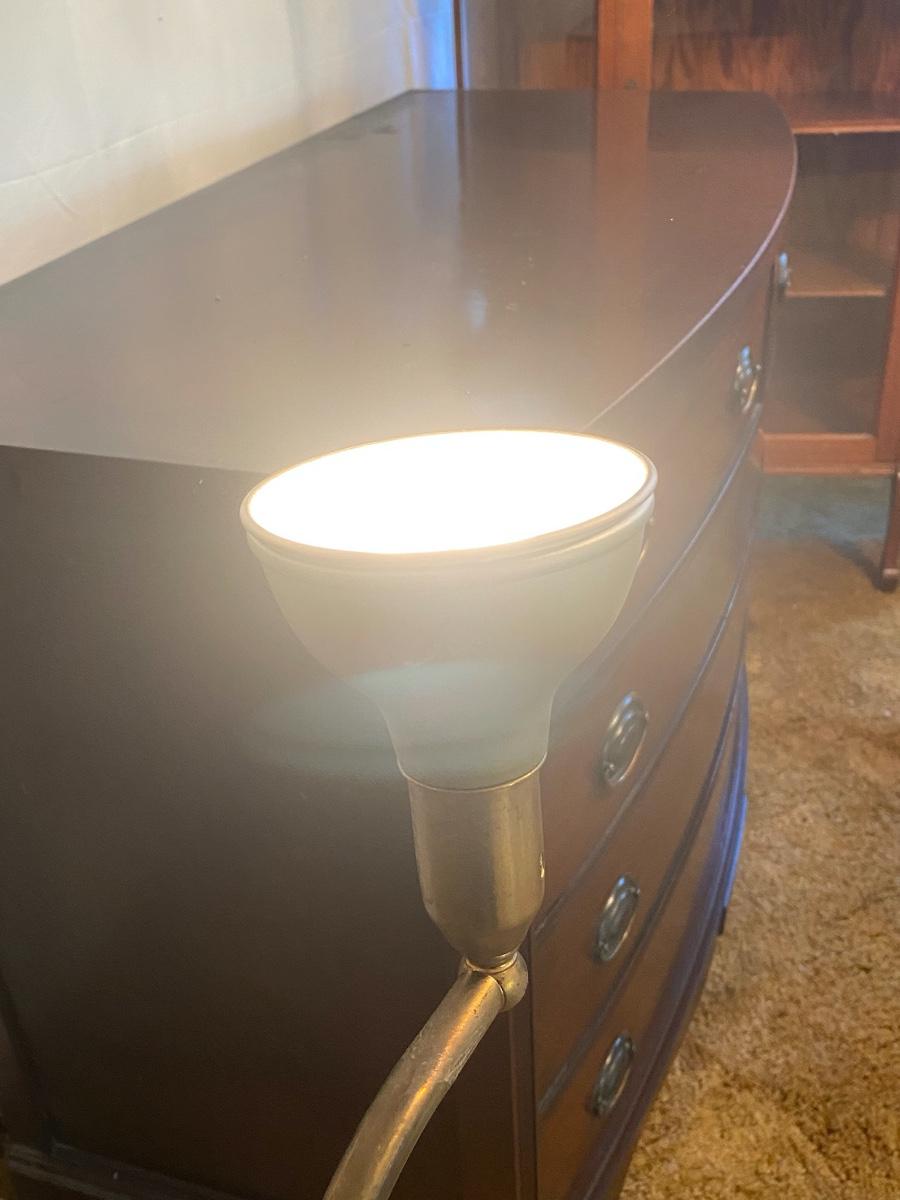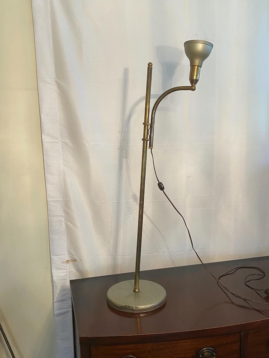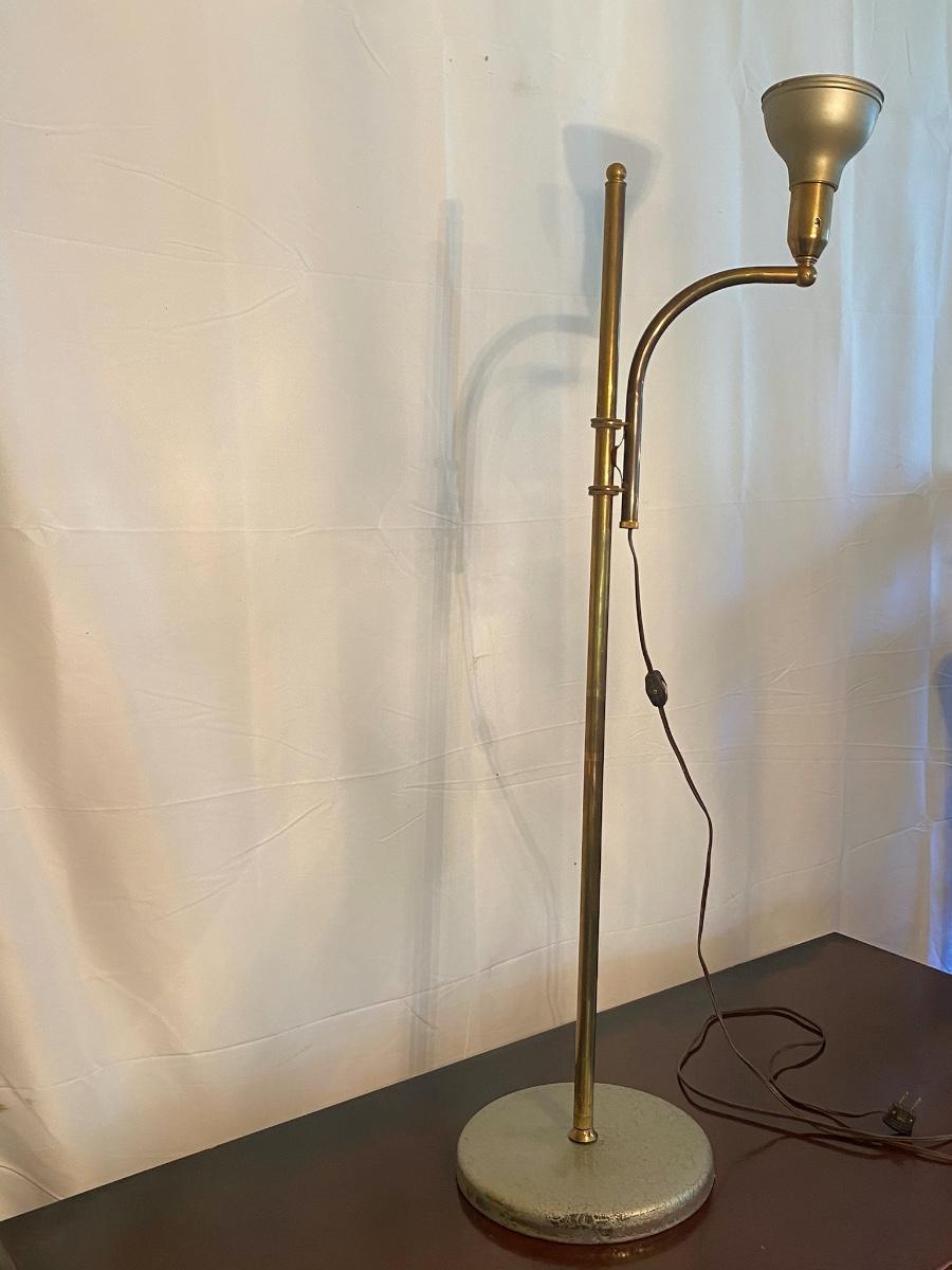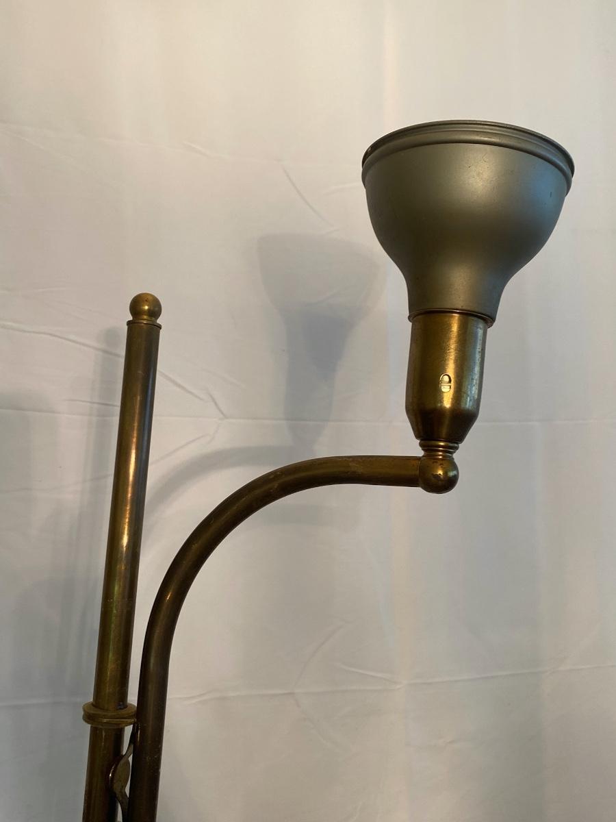 This is a working vintage brass floor lamp, with a metal shade. Light points toward ceiling. Needs a polish to bring luster of brass.