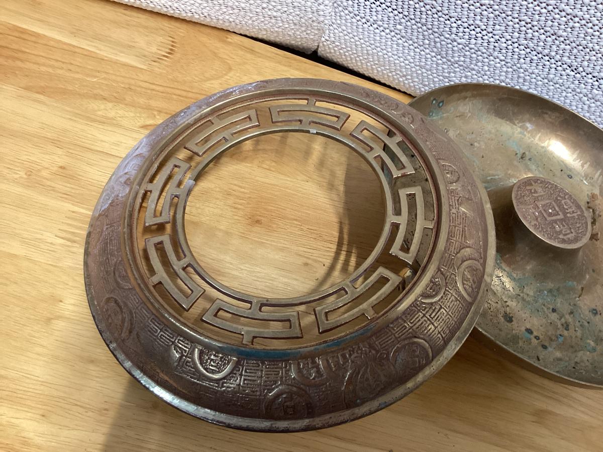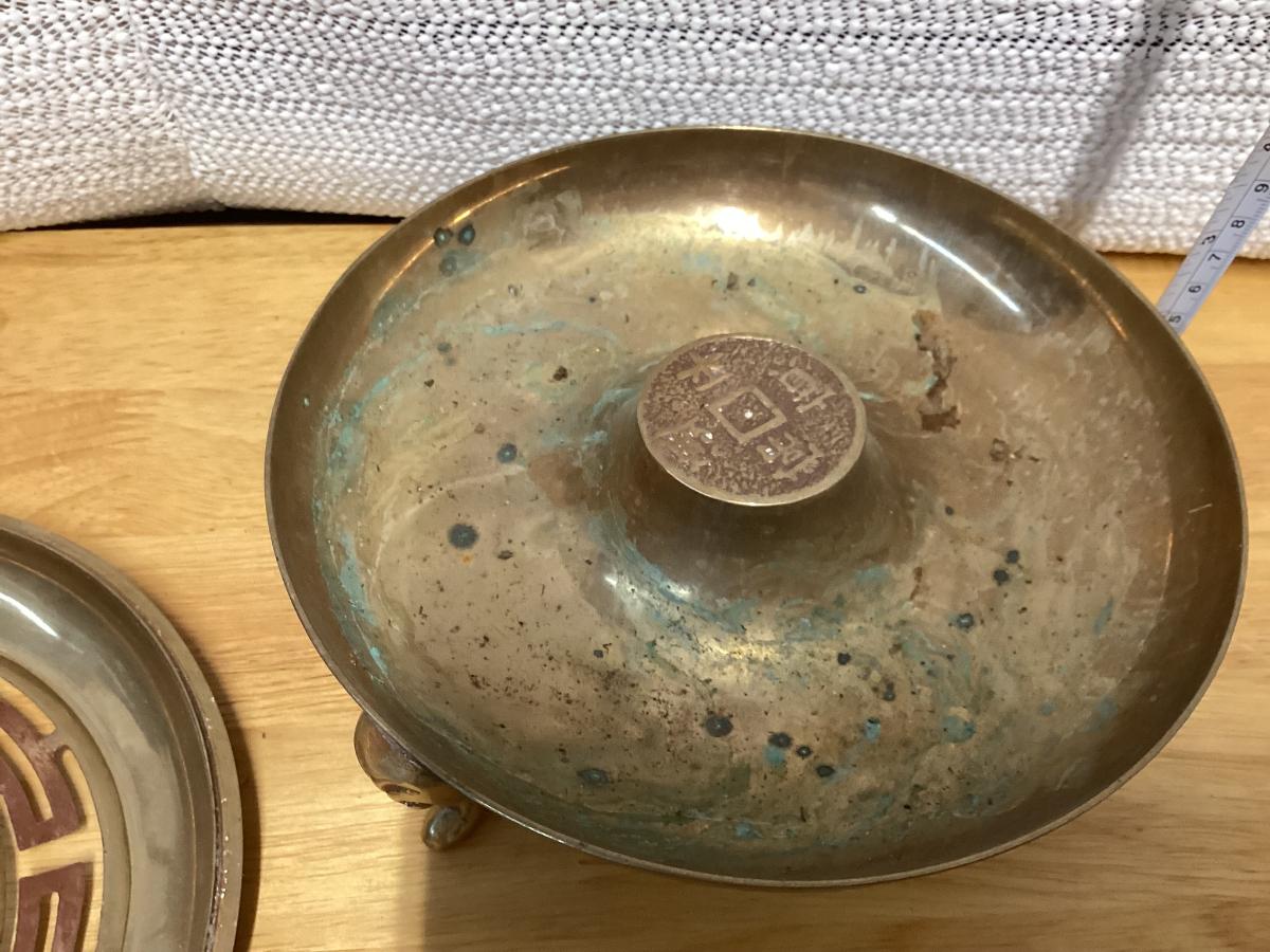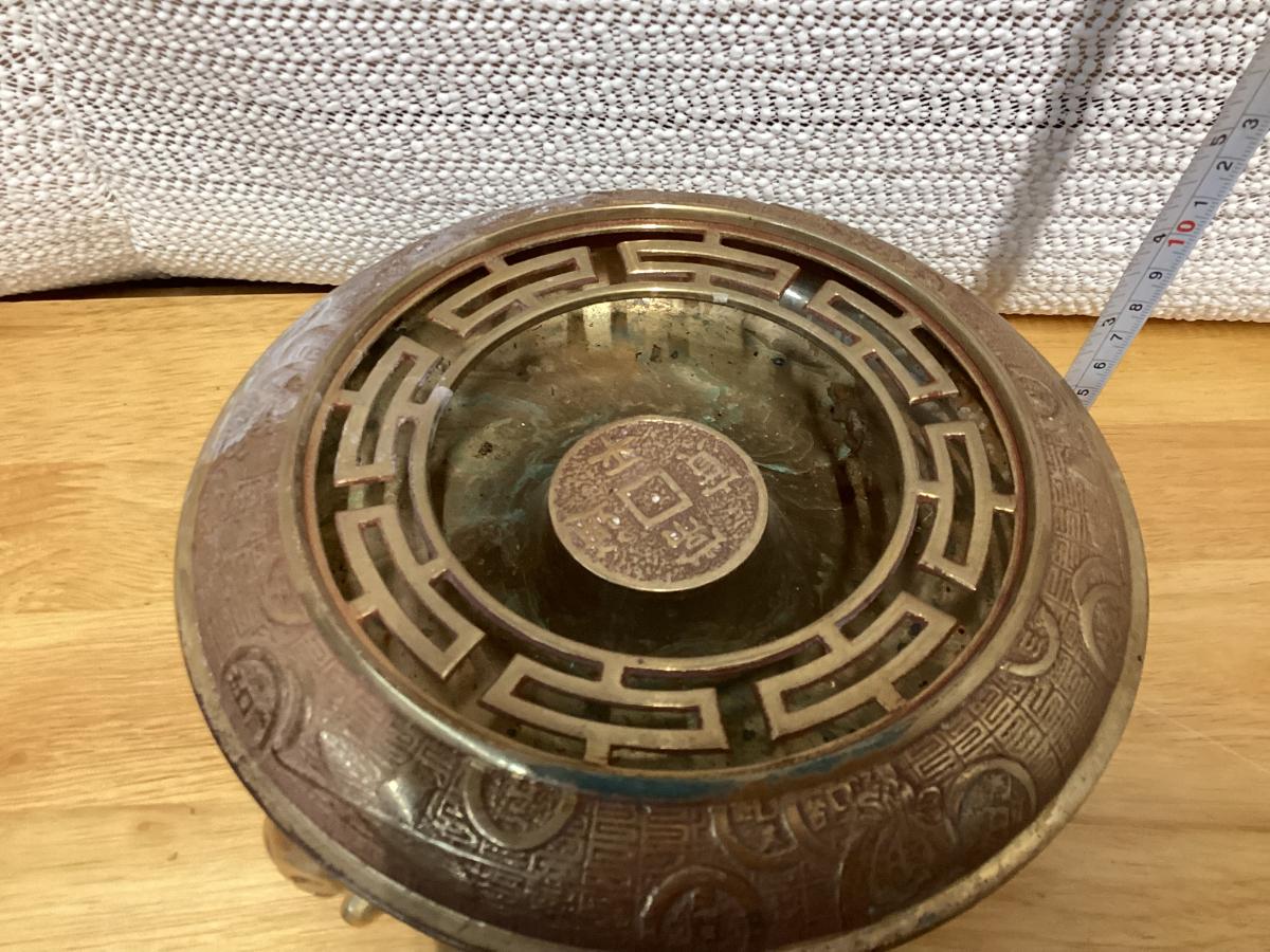 vintage brass incense burner, also known as a censer or ashtray, featuring Chinese zodiac signs on the sides.