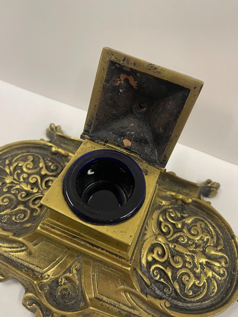 Vintage reproduction brass inkwell with cobalt ink jar. Excellent condition. 9" long.