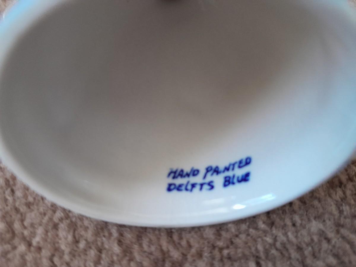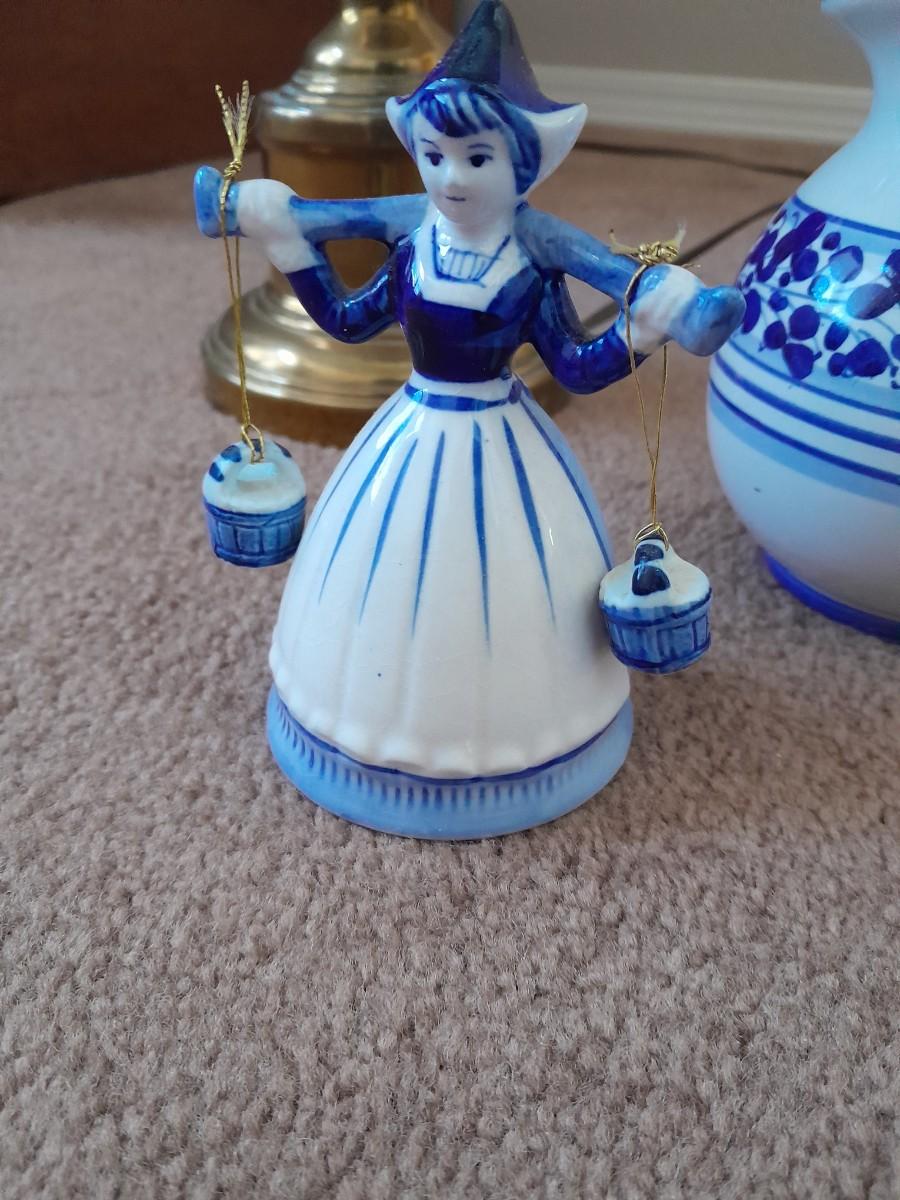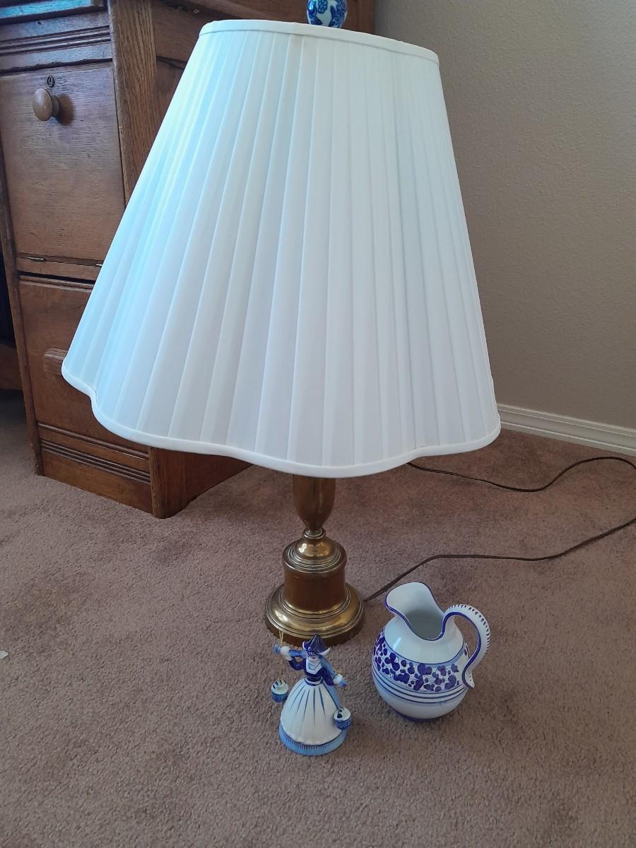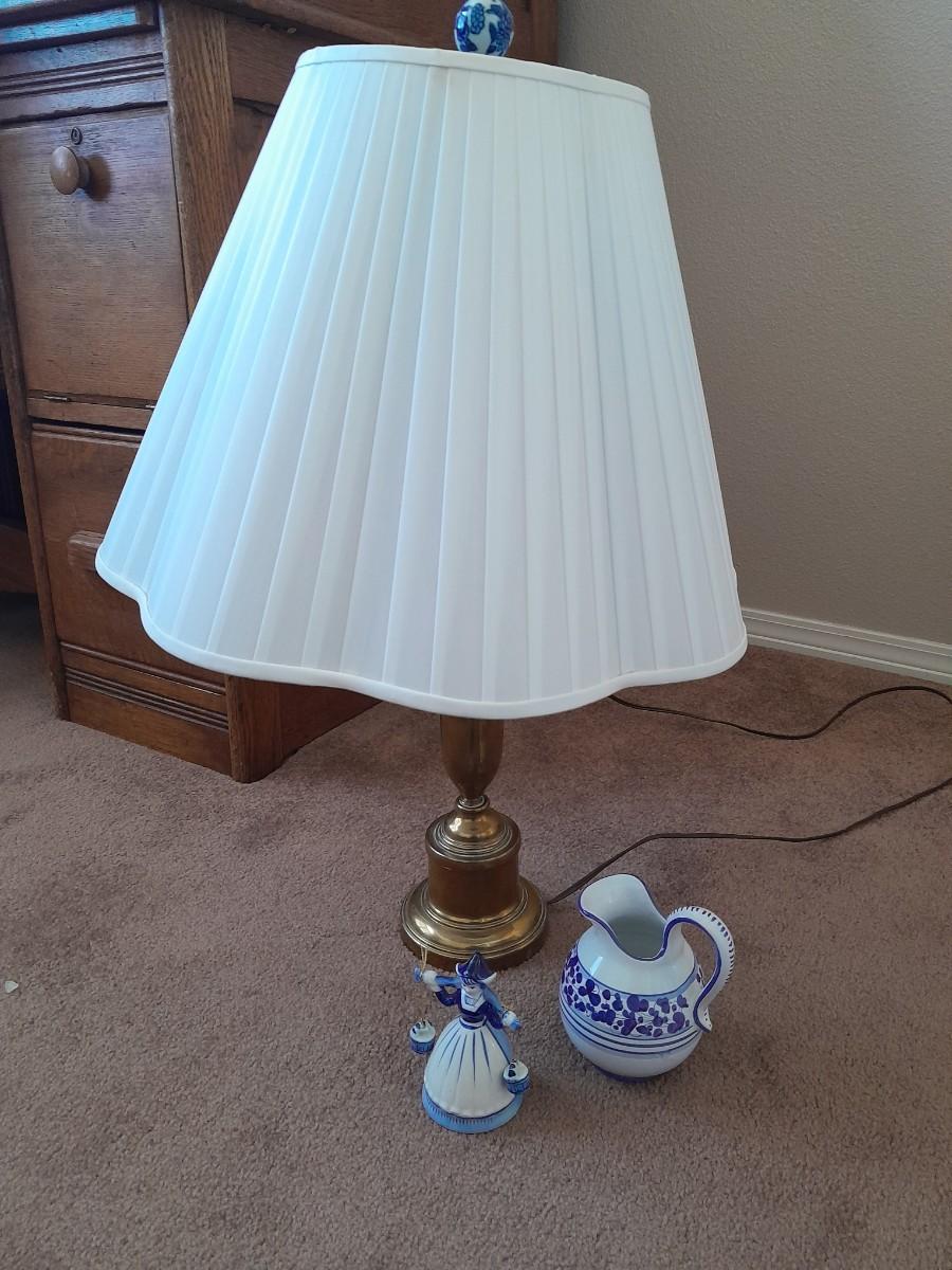 VINTAGE BRASS LAMP, DELFT BLUE HAND PAINTED GIRL, AND ITALIAN CREAMER