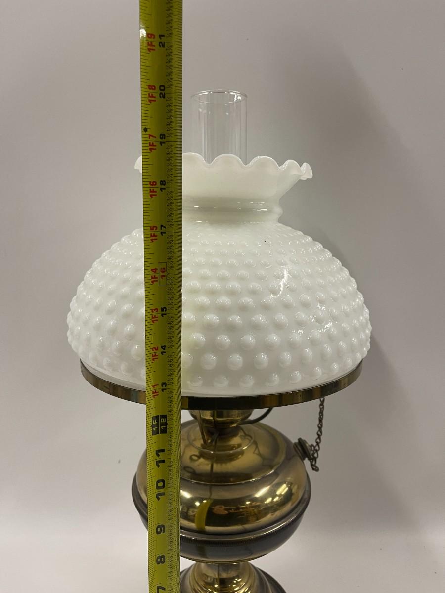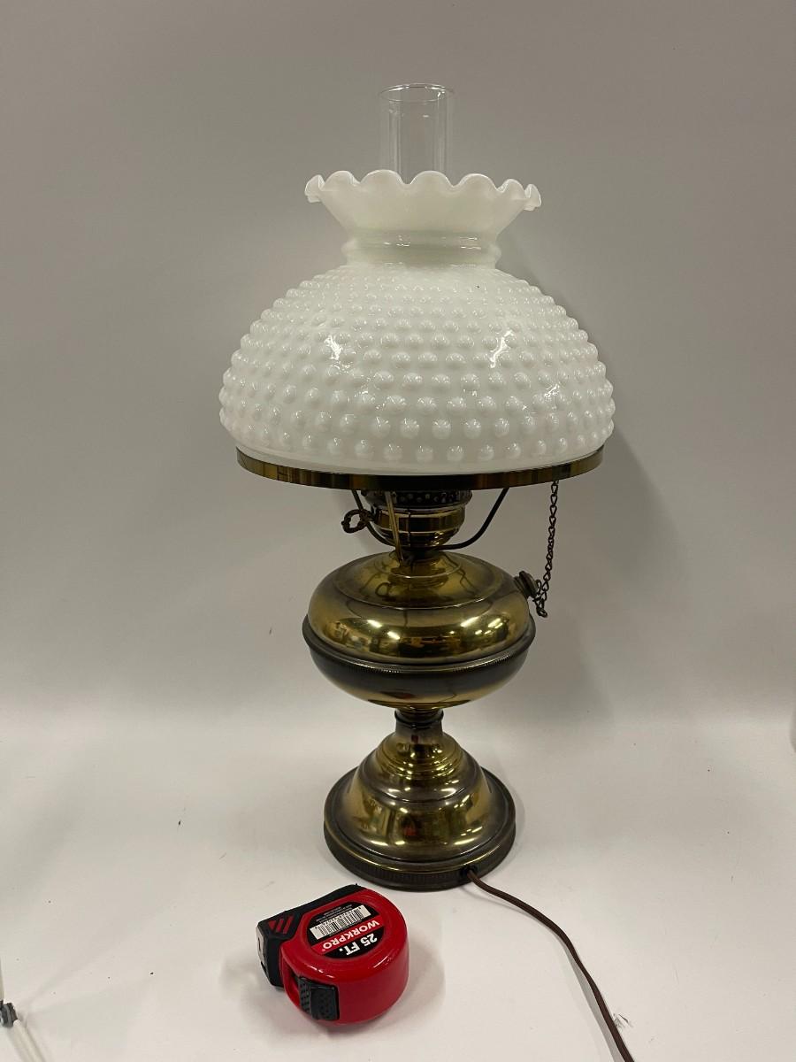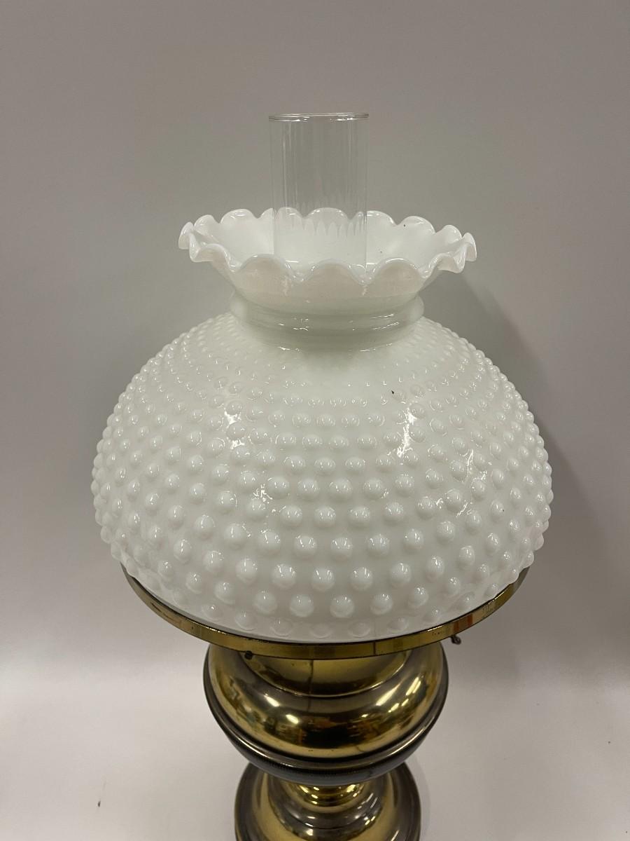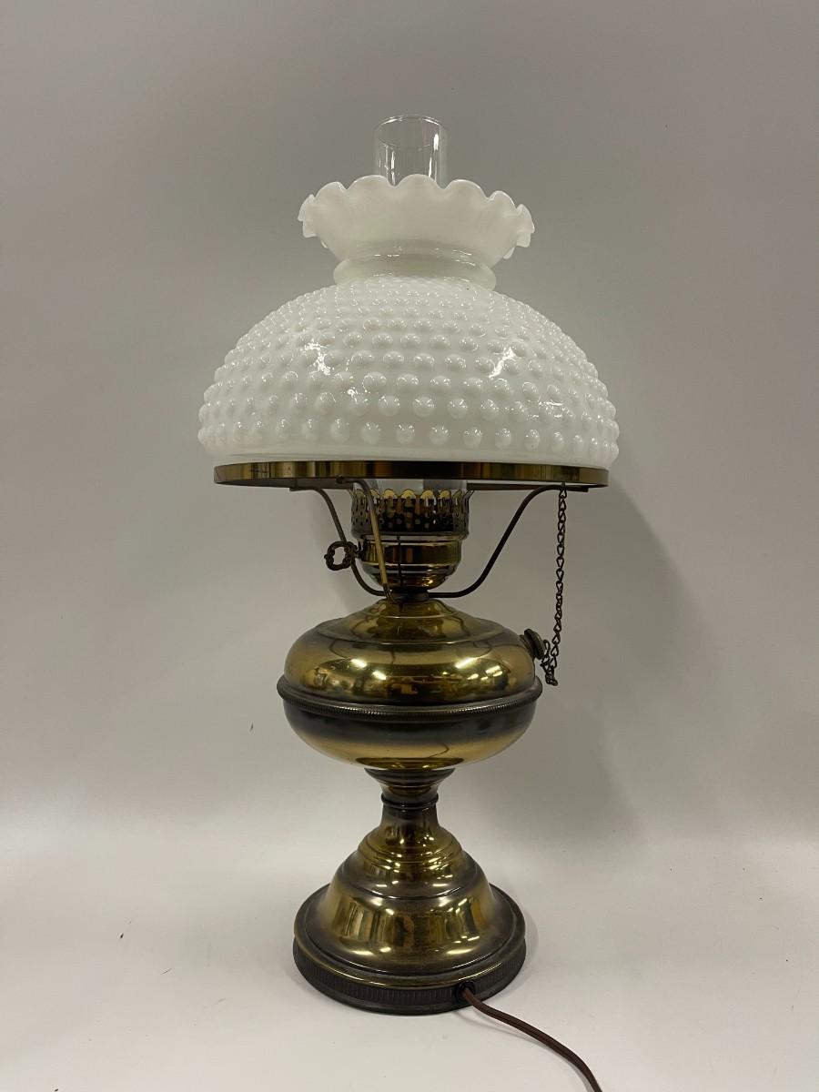 Vintage brass electrified oil lamp with white glass hobnail shade. Very good condition.