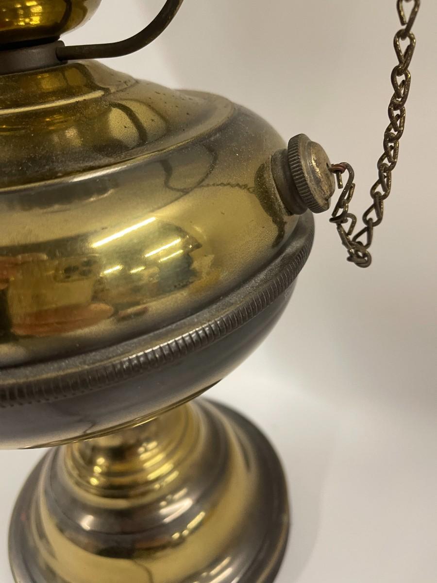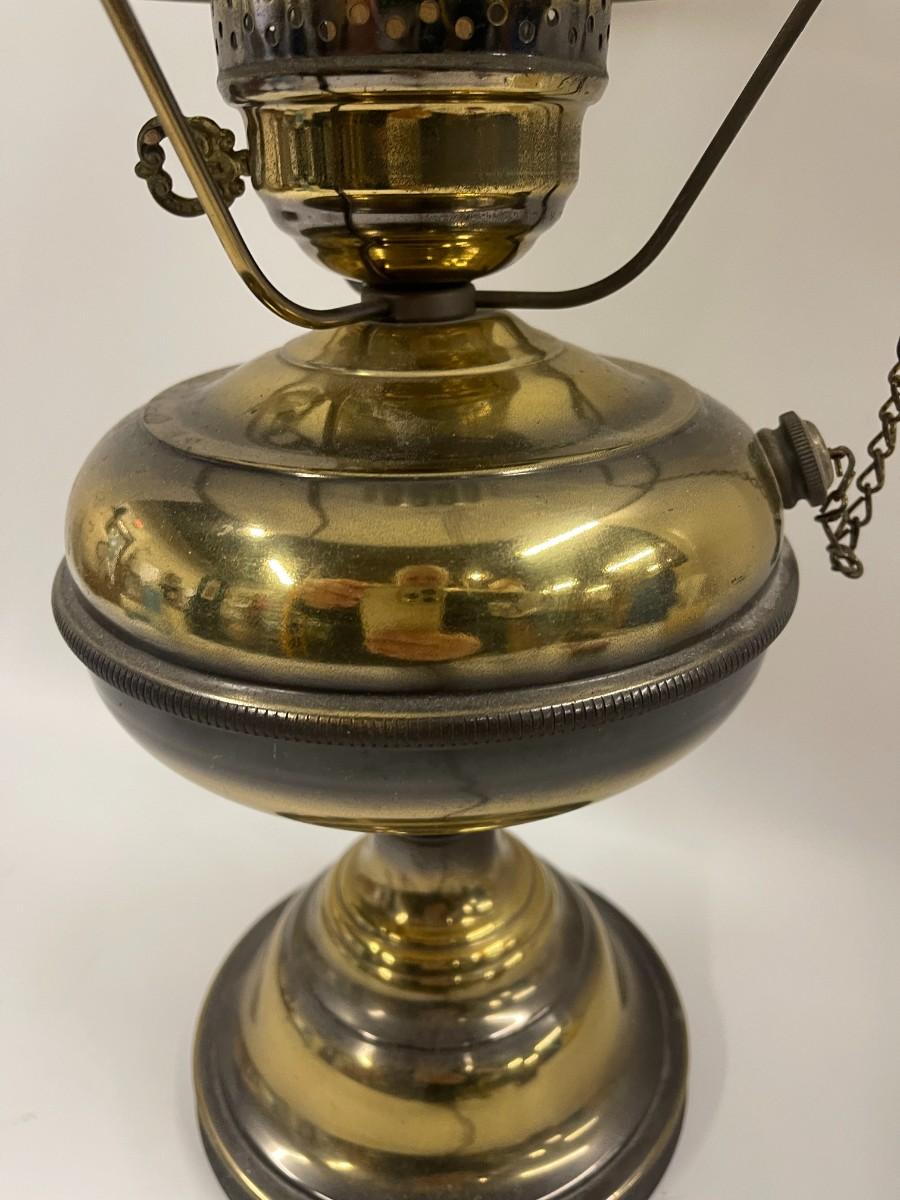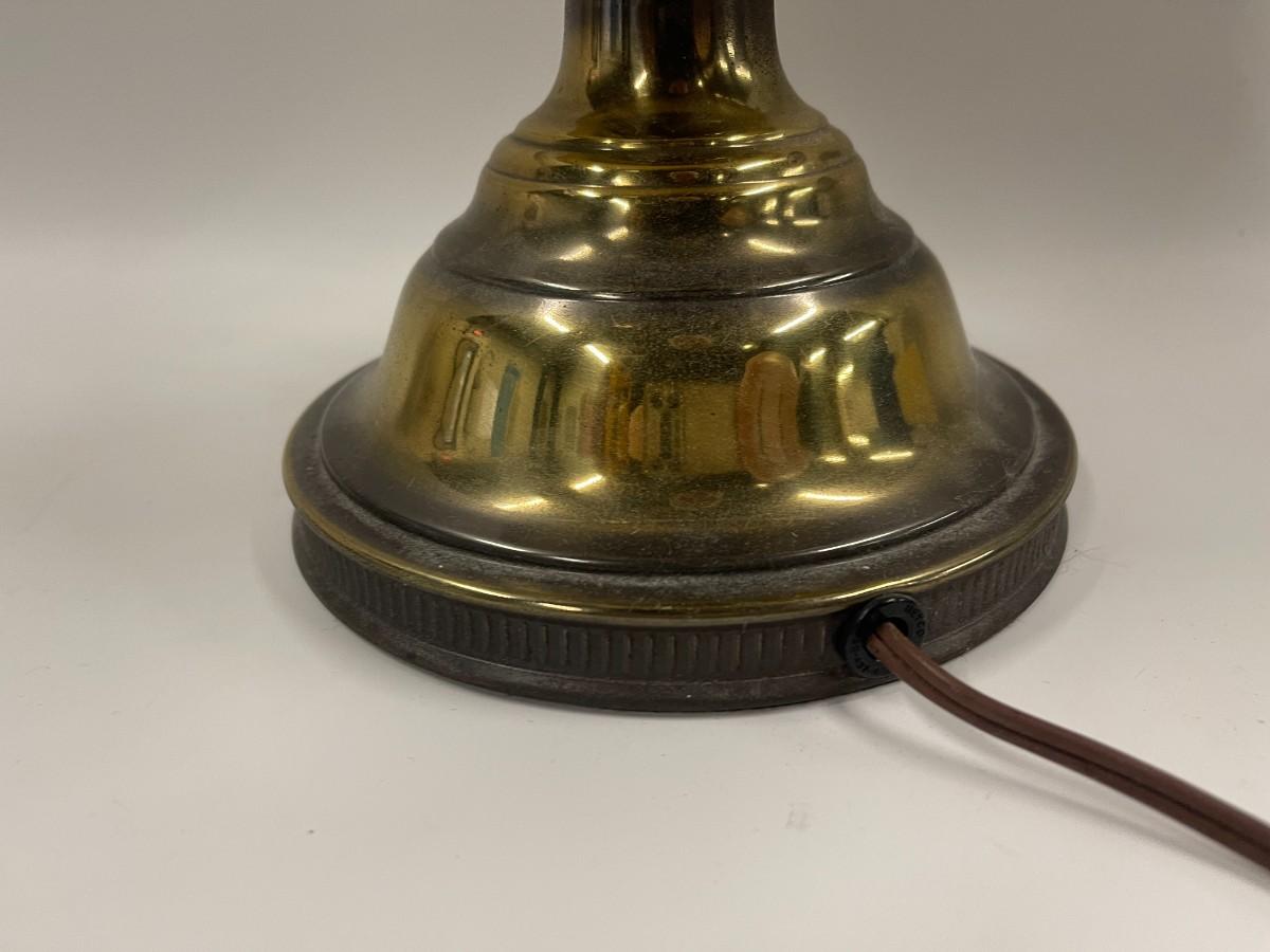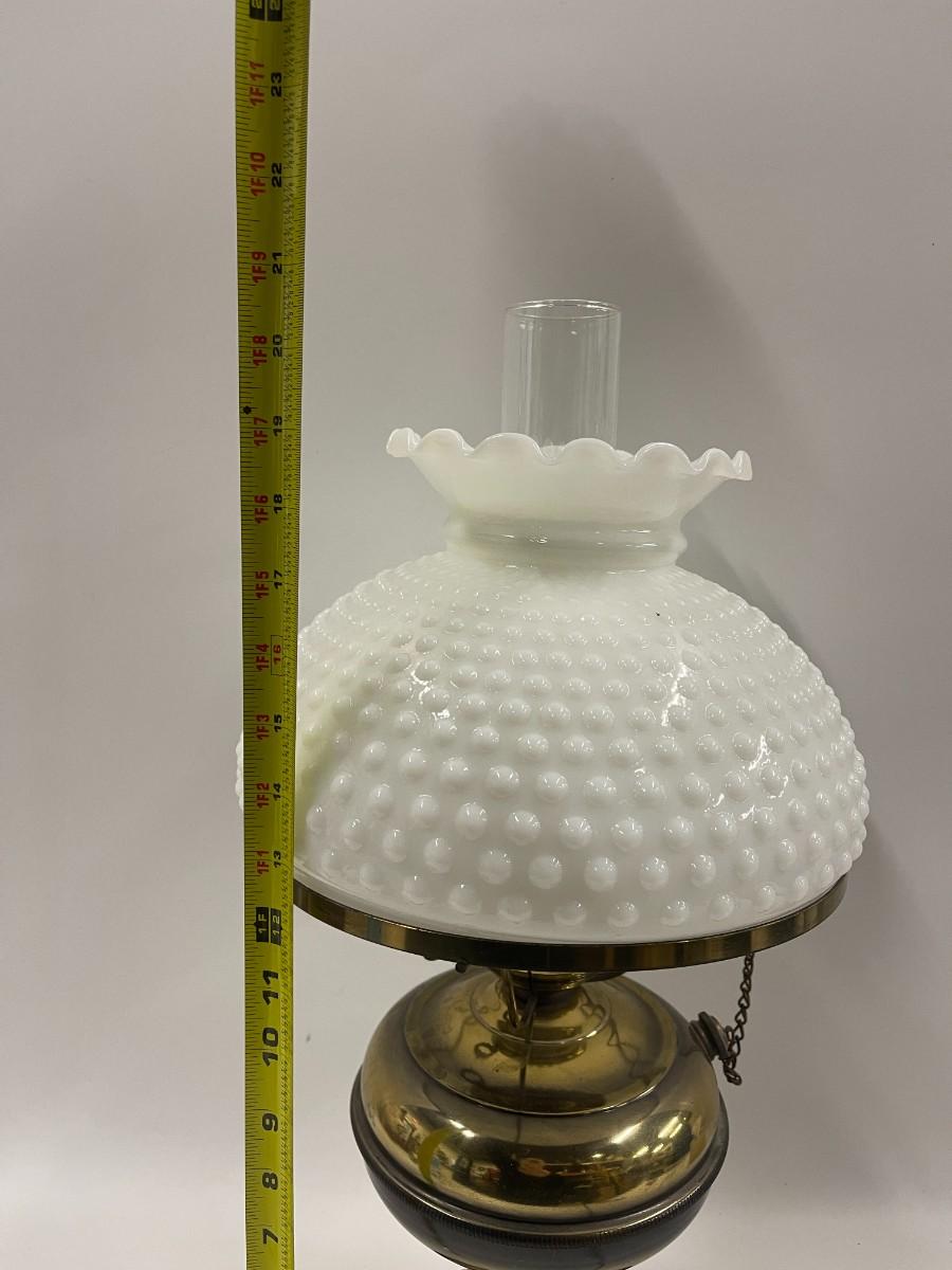Vintage brass electrified oil lamp with white glass hobnail shade. Very good condition.