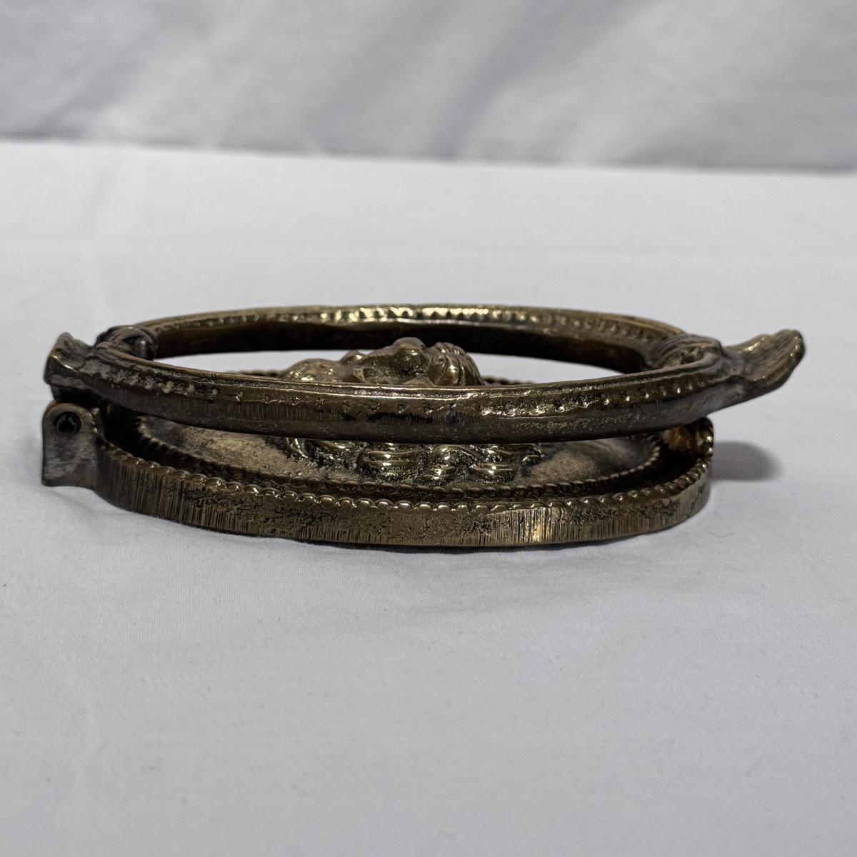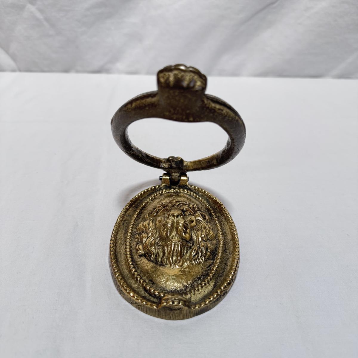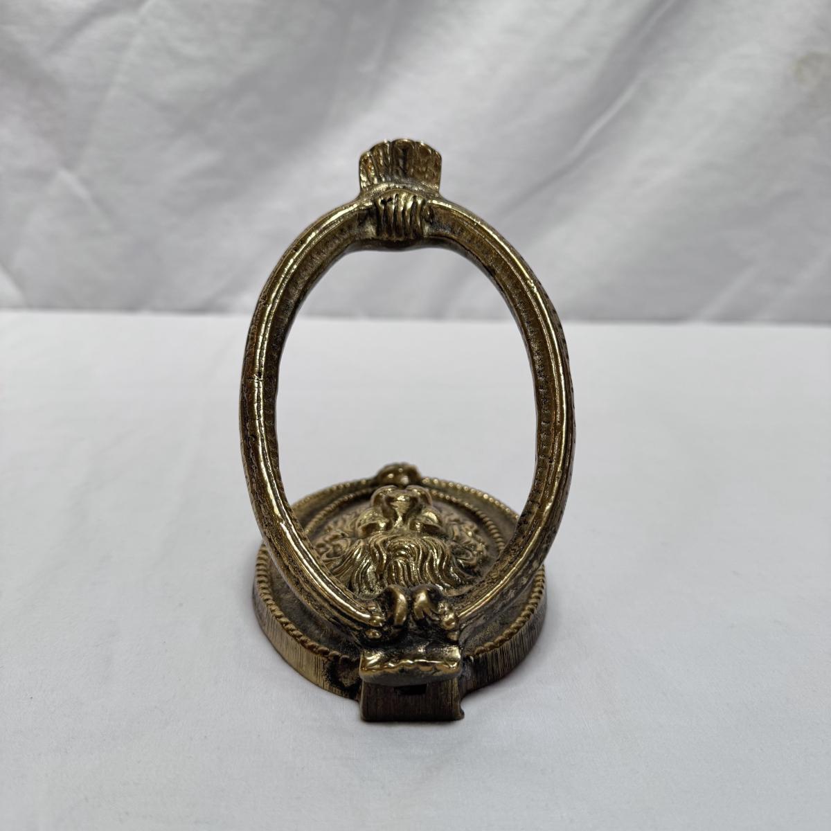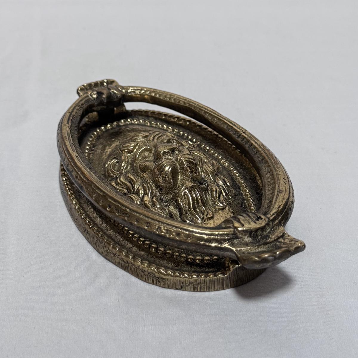 This lot includes, what appears to be, one vintage brass lion head door knocker. There are two holes in the back for wall hanging purposes. The door knocker is on the larger size, measures 3.5” x 6” x 1”H. Shipping available.