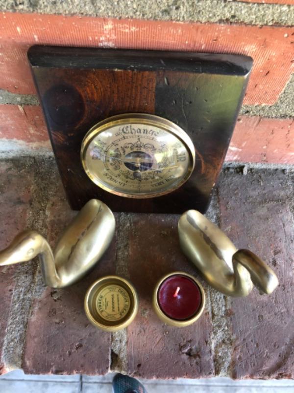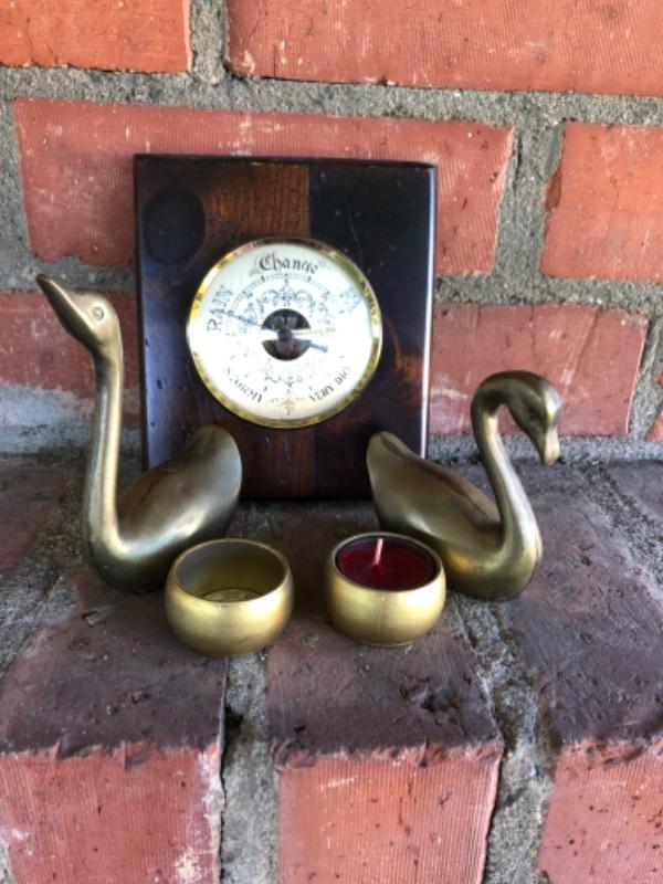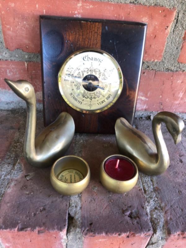 Vintage brass lot ducks, candleholder and weather gauge