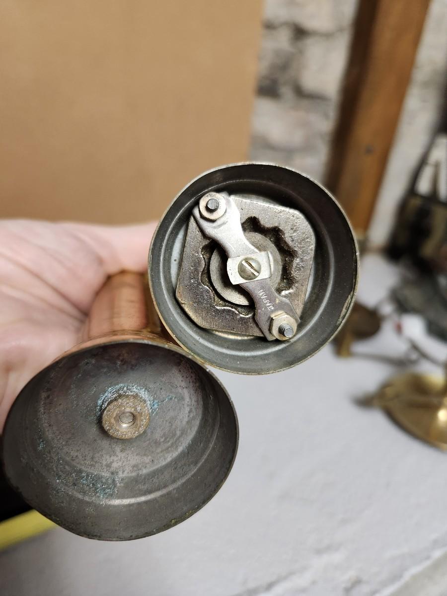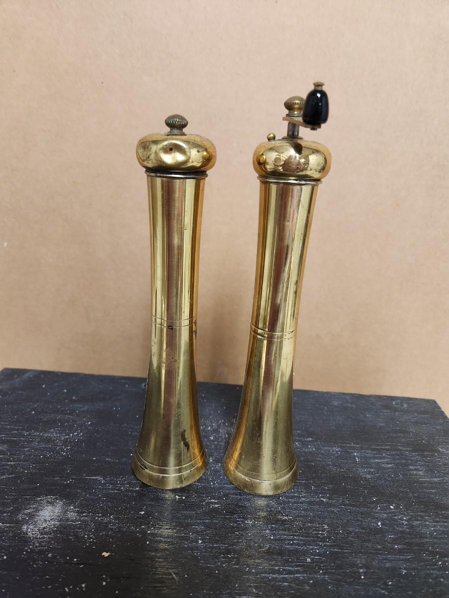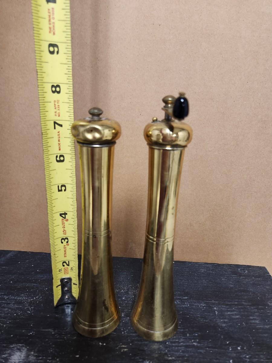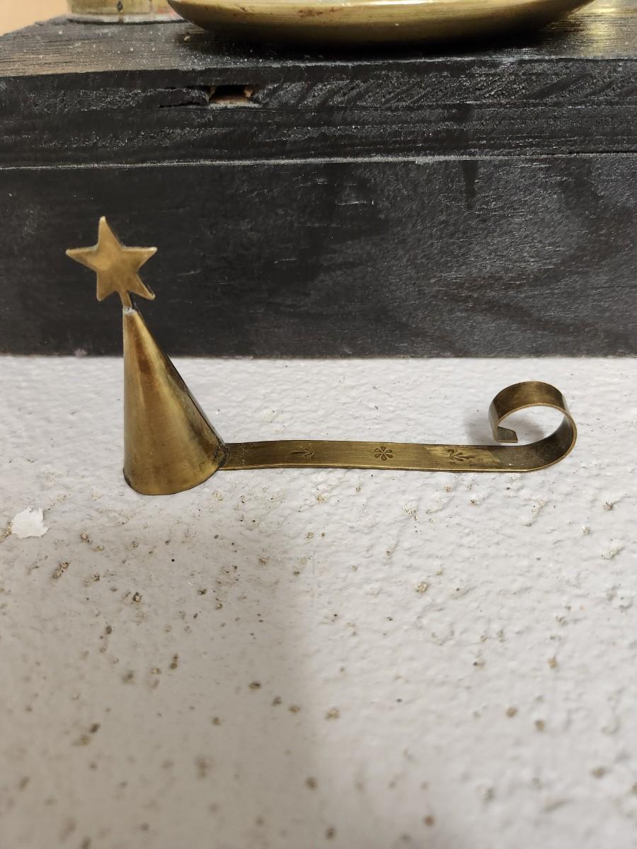 Some very old brass candle sticks, notice the one that swivels so you can hang it. Google says it is a nautical candlestick. A small snuffer from Sweden, salt and peppers, and more.