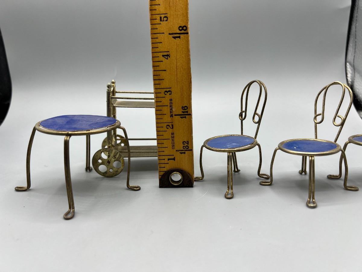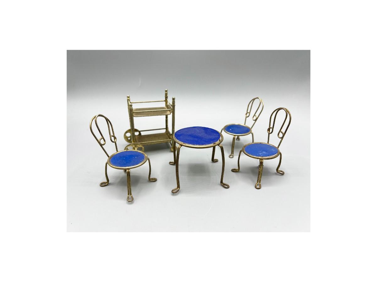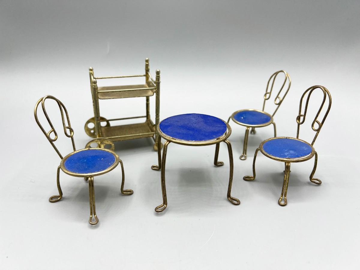 Vintage brass metal dollhouse furniture. Three chairs and small table bistro style set and a bar cart. Good vintage condition, some wear.