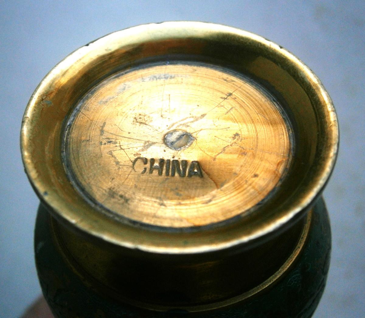 Vintage Brass Miniatures made in China consisting of two decorated vases2 1/4 & 3 1/4 in. tall, + two bells missing clappers.