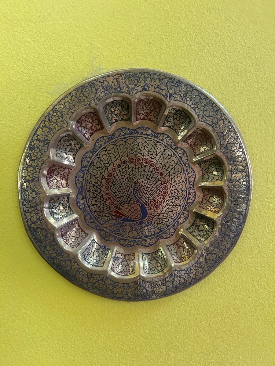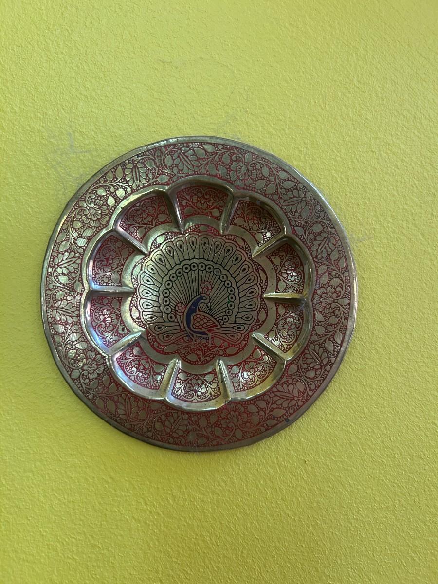 Vintage Turkish brass peacock plates (2), larger diameter 8", small diameter 4"