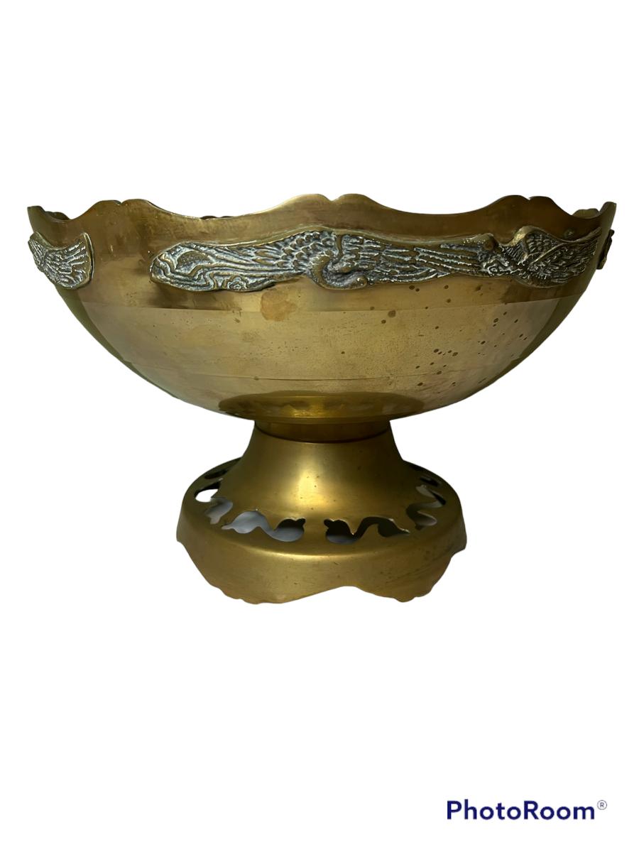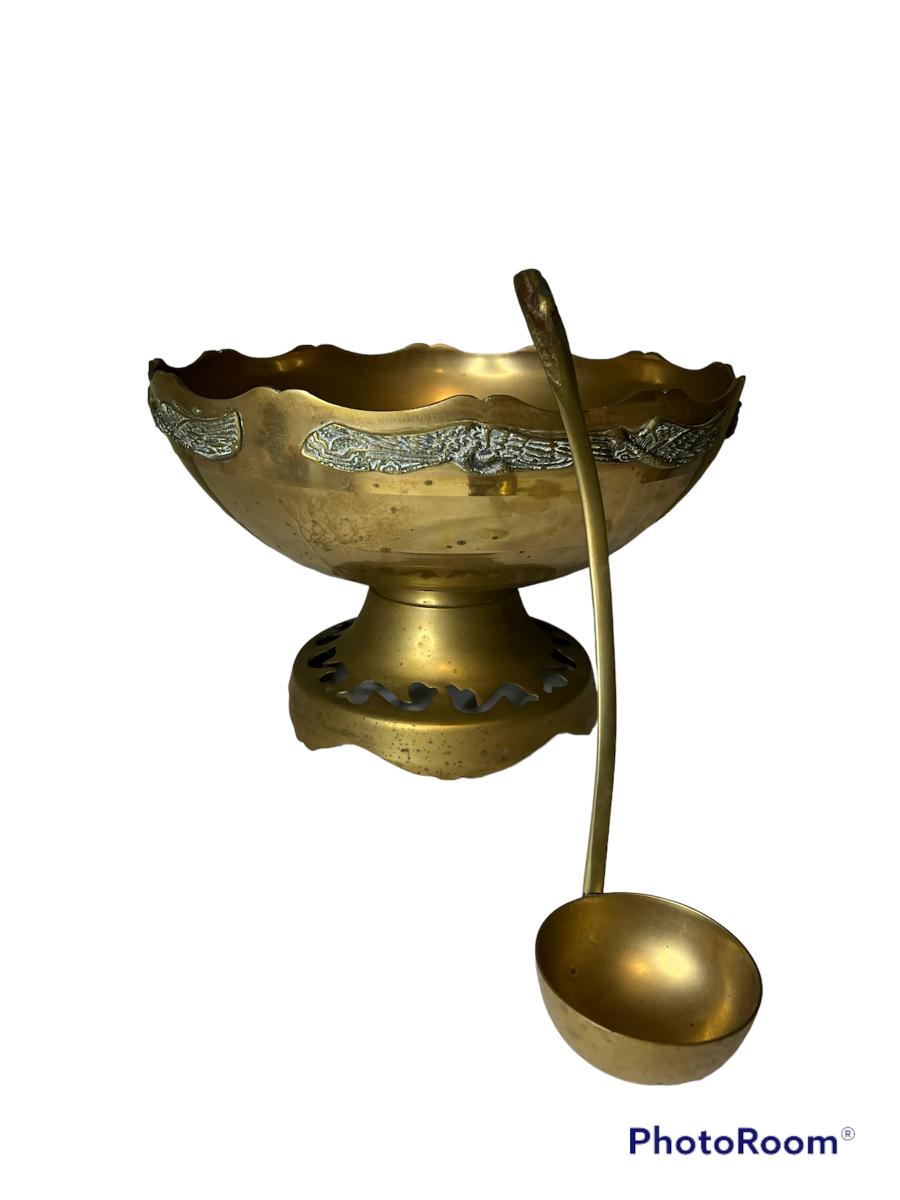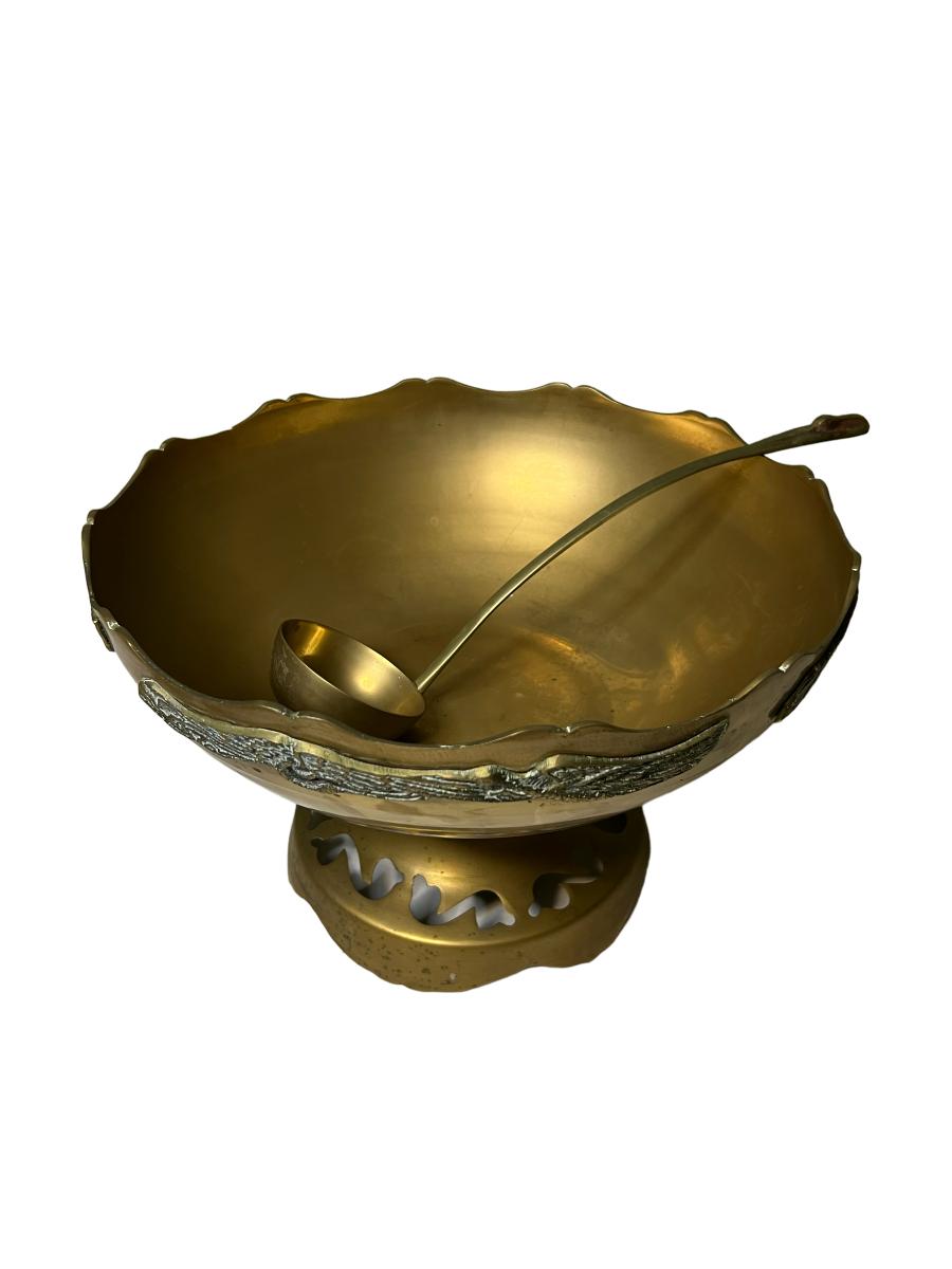 Vintage Indian Brass Punch Bowl and spoon Set. Measures 9 1/2 half inches tall 14 1/2 inches wide.