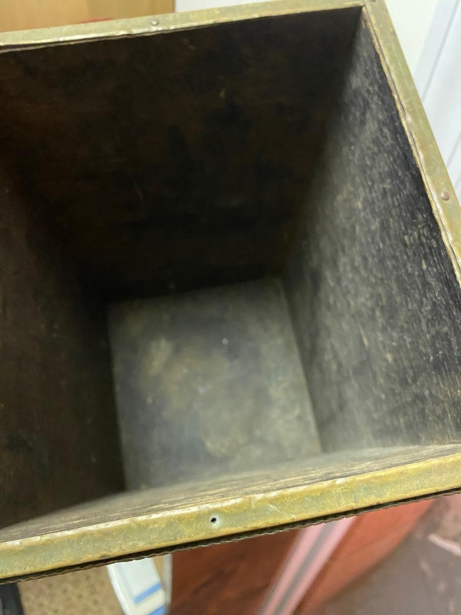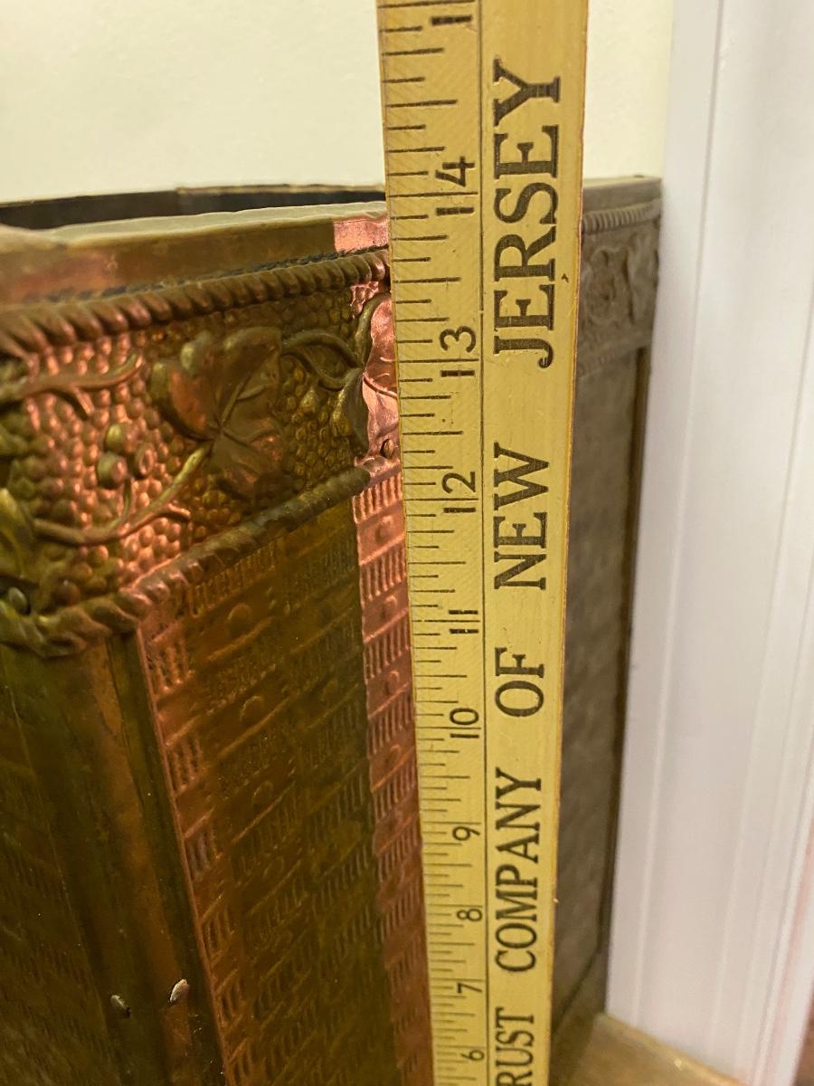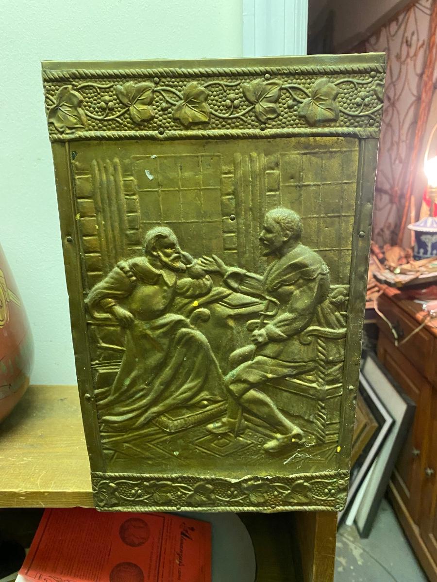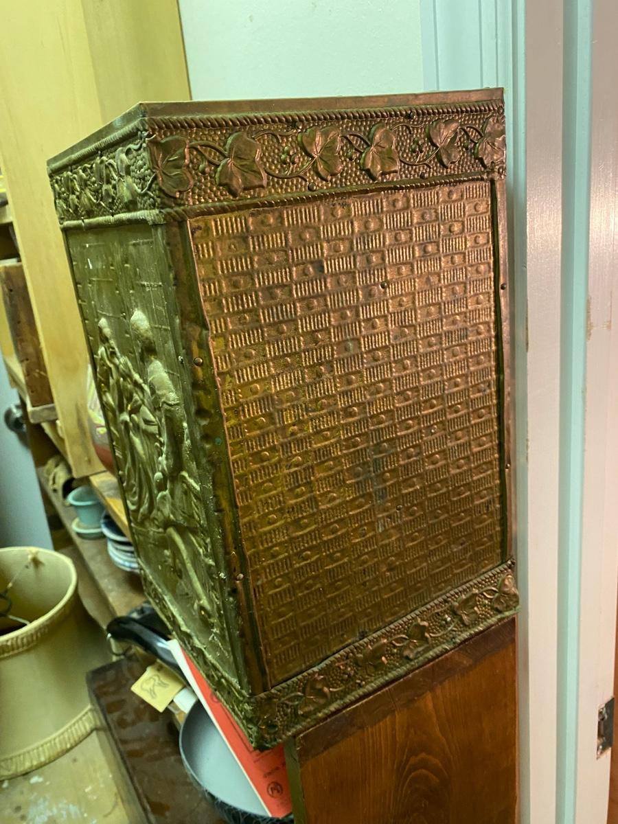 Brass high relief English-- Dutch, Wood lined interior. Multiple uses-- Waste Basket-- Cane Umbrella Holder. Planter vase.. Excellent condition with some patina on one panel. Very clean, Very Fine detail. Small bun feet.