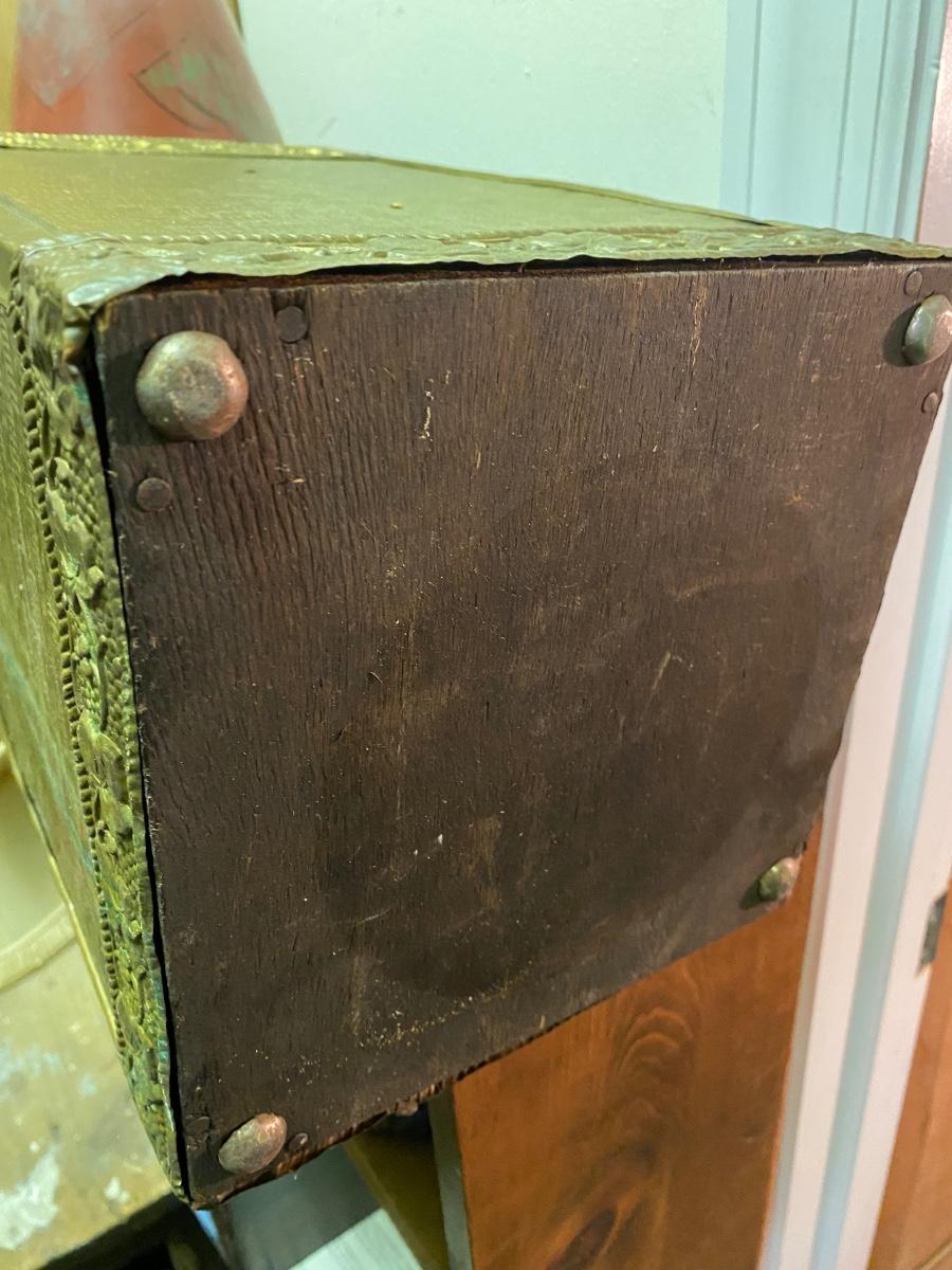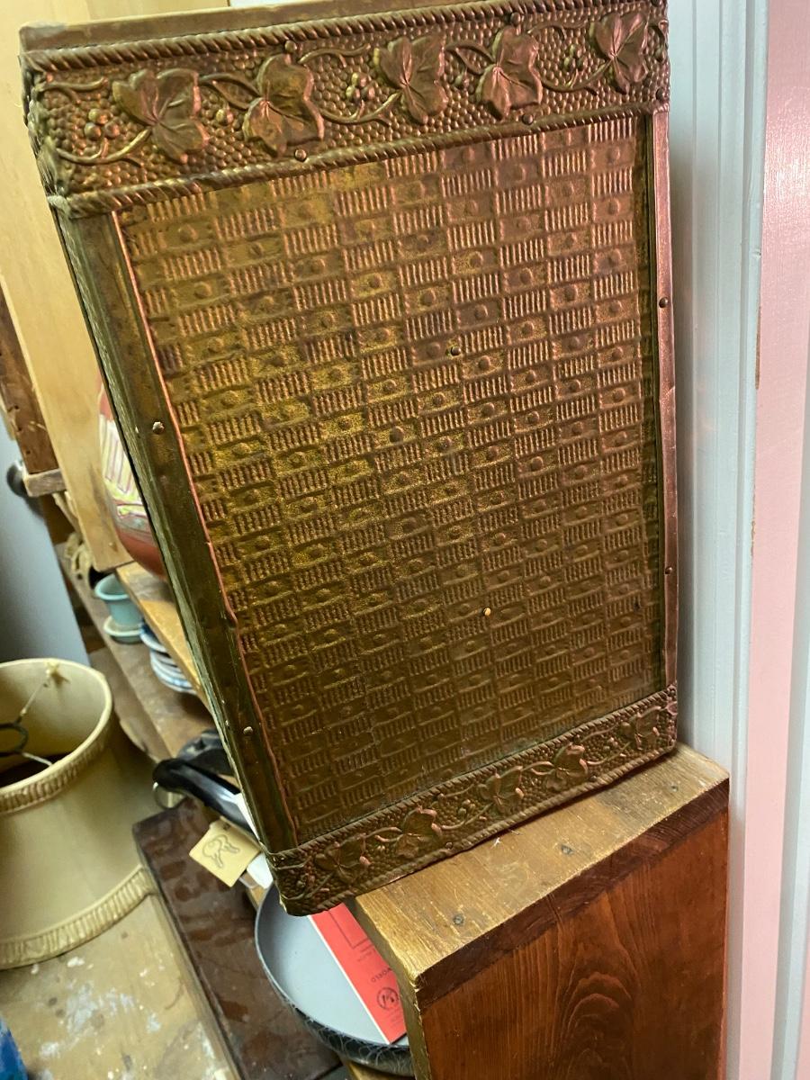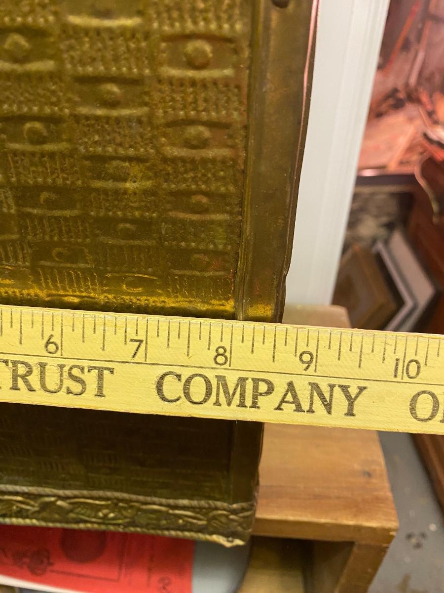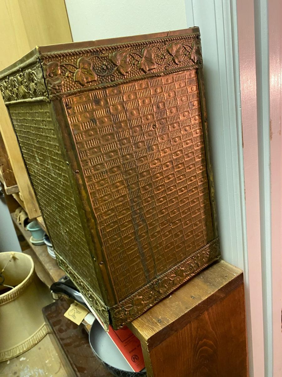 Brass high relief English-- Dutch, Wood lined interior. Multiple uses-- Waste Basket-- Cane Umbrella Holder. Planter vase.. Excellent condition with some patina on one panel. Very clean, Very Fine detail. Small bun feet.
