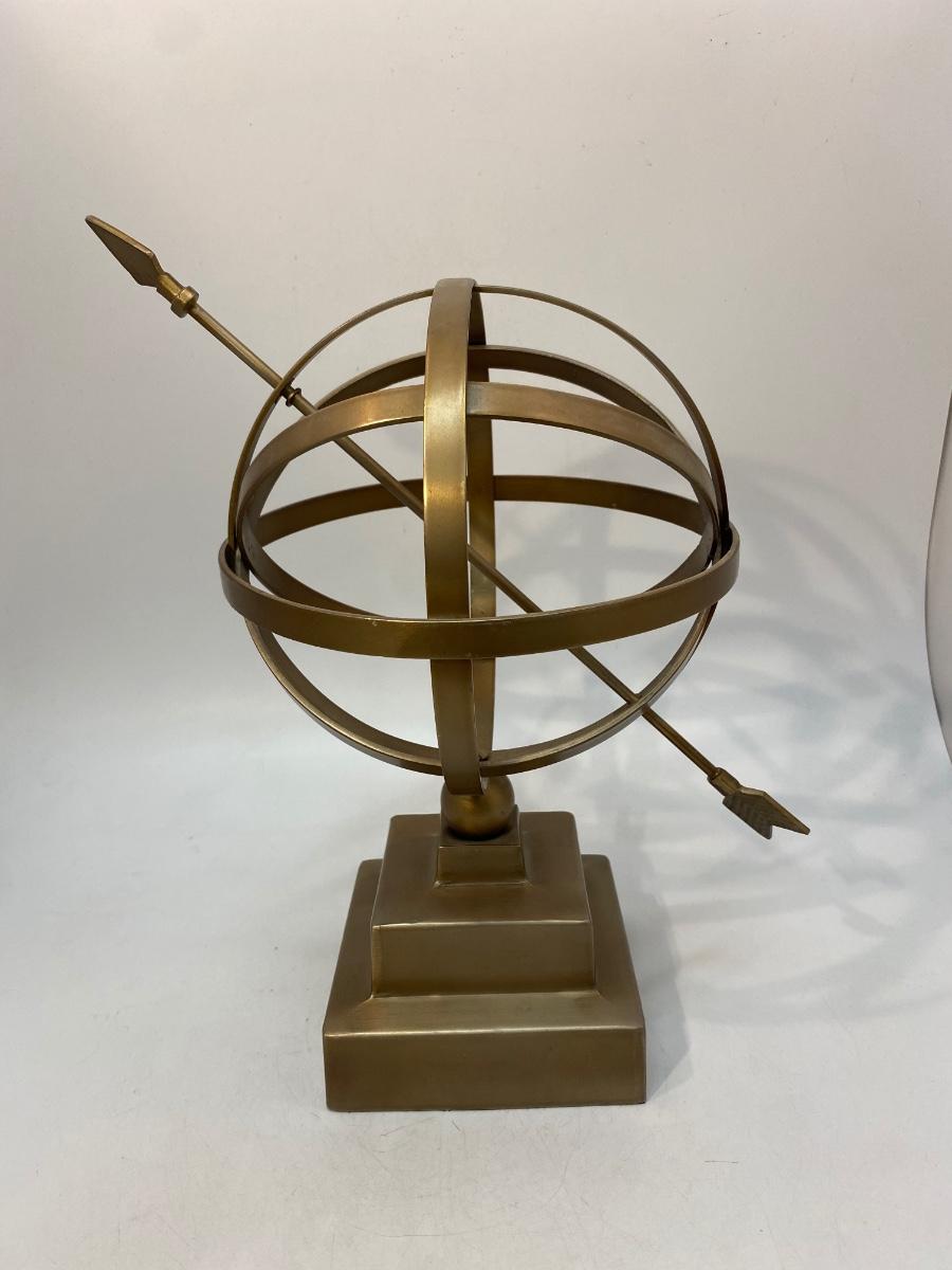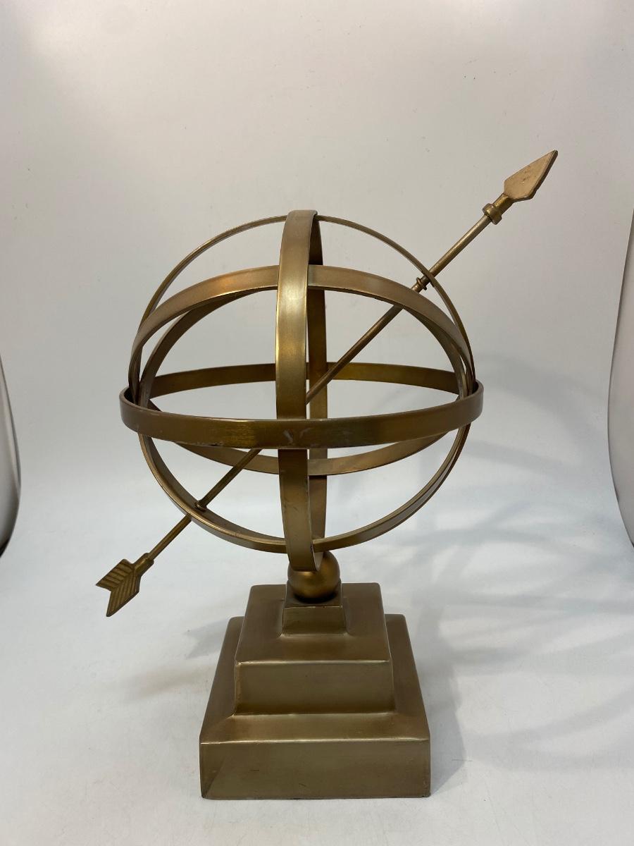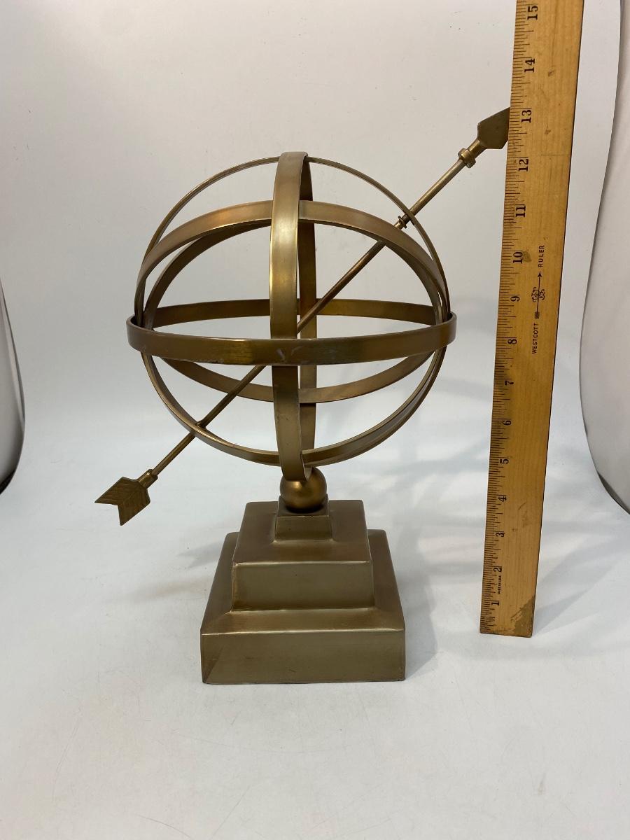 Vintage Brass Tone Metal Armillary Globe Sphere with Arrow Statue Decor. Good condition. About 13" size.