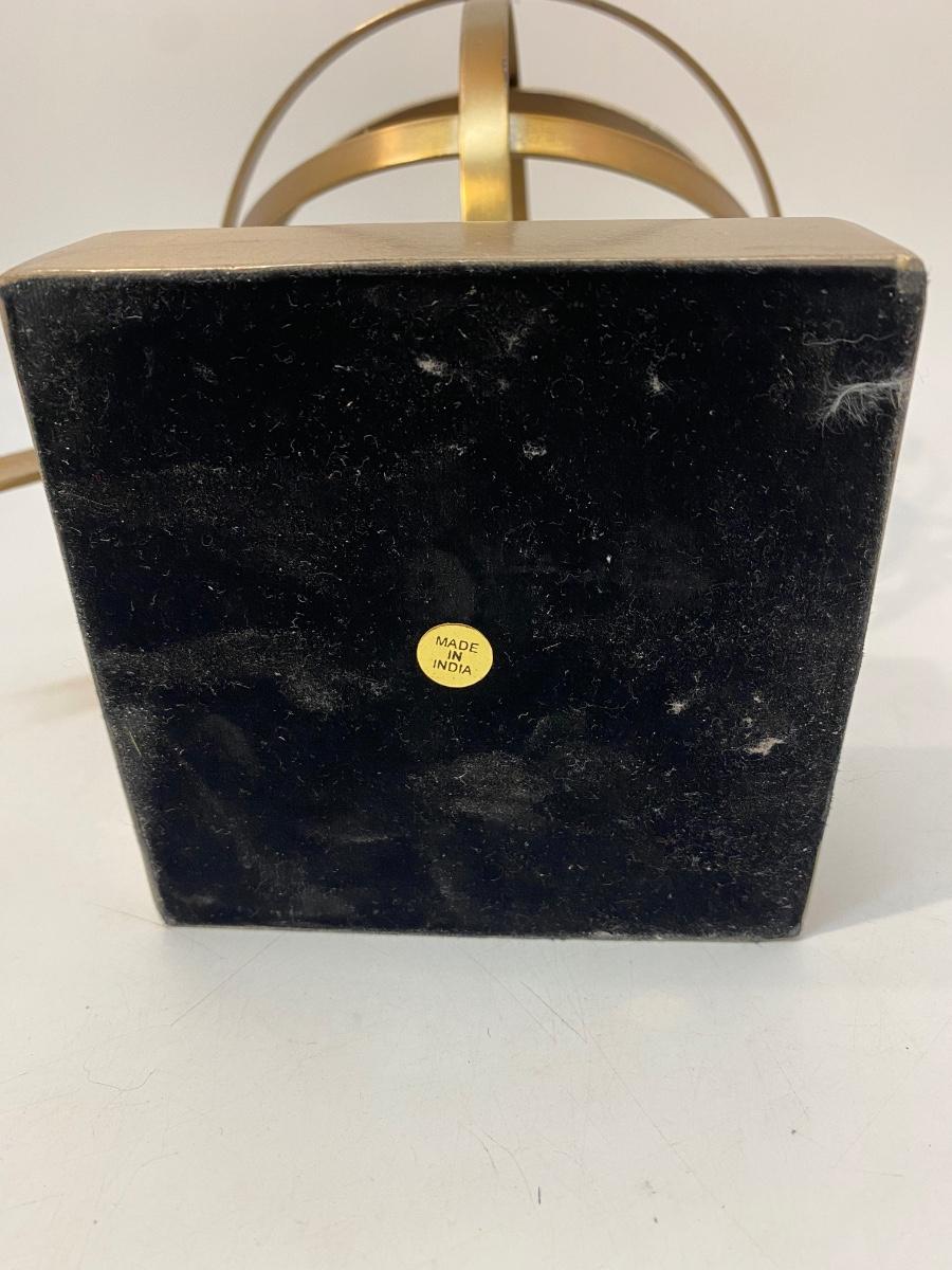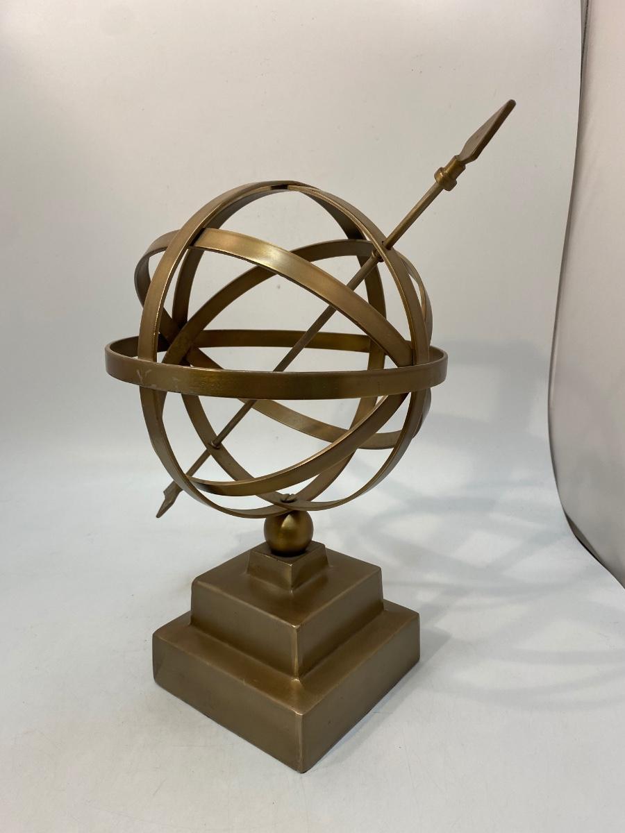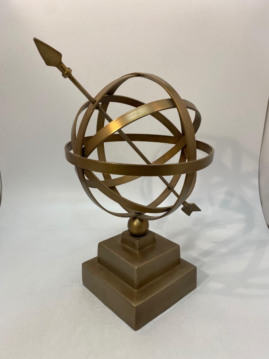 Vintage Brass Tone Metal Armillary Globe Sphere with Arrow Statue Decor. Good condition. About 13" size.