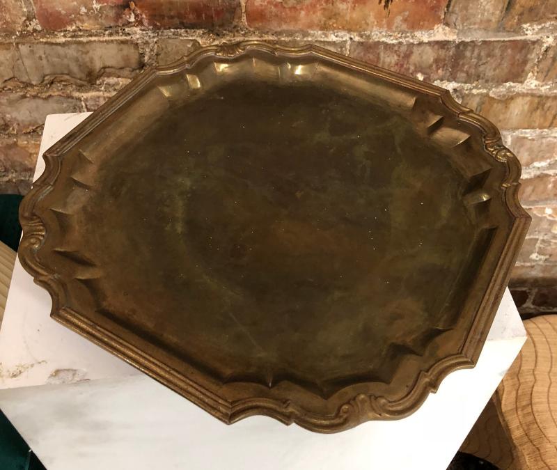 Here is a large ornate vintage brass tray with a nice age patina...This lot includes the brass table lamp as shown..Good working condition...