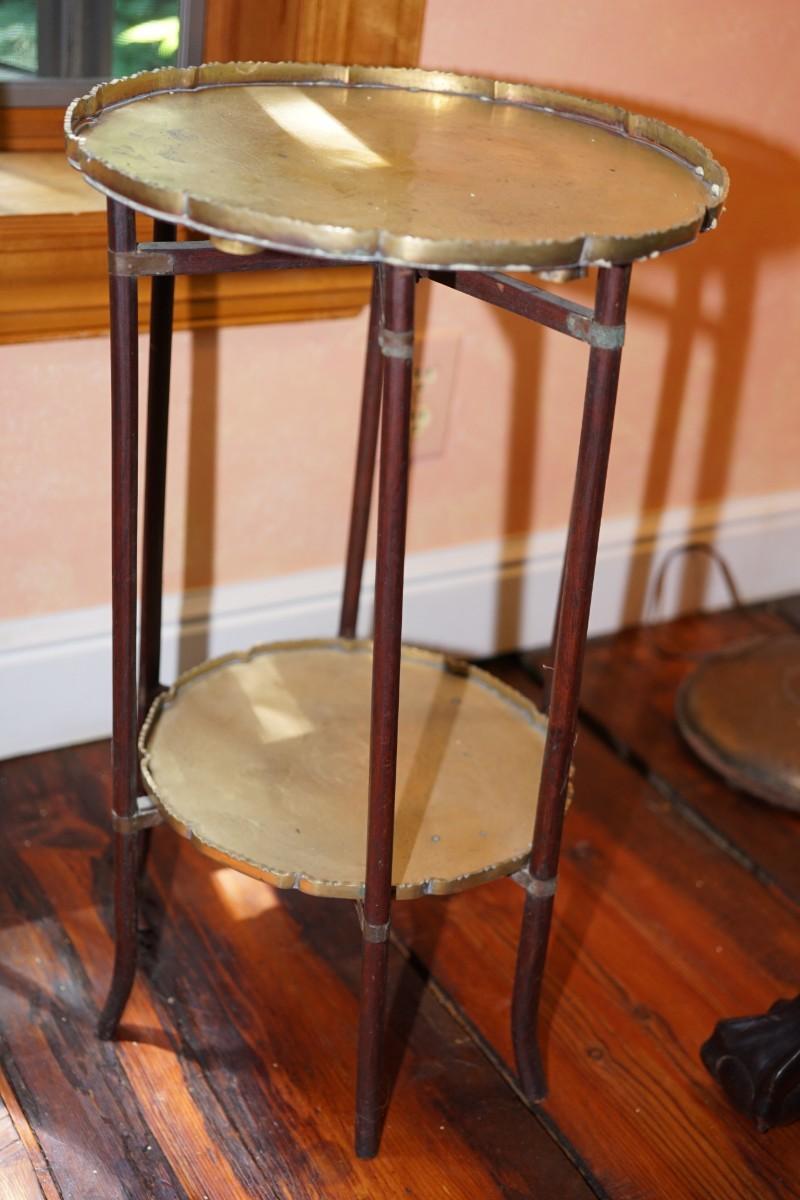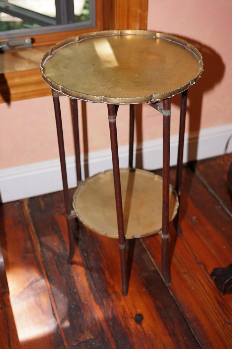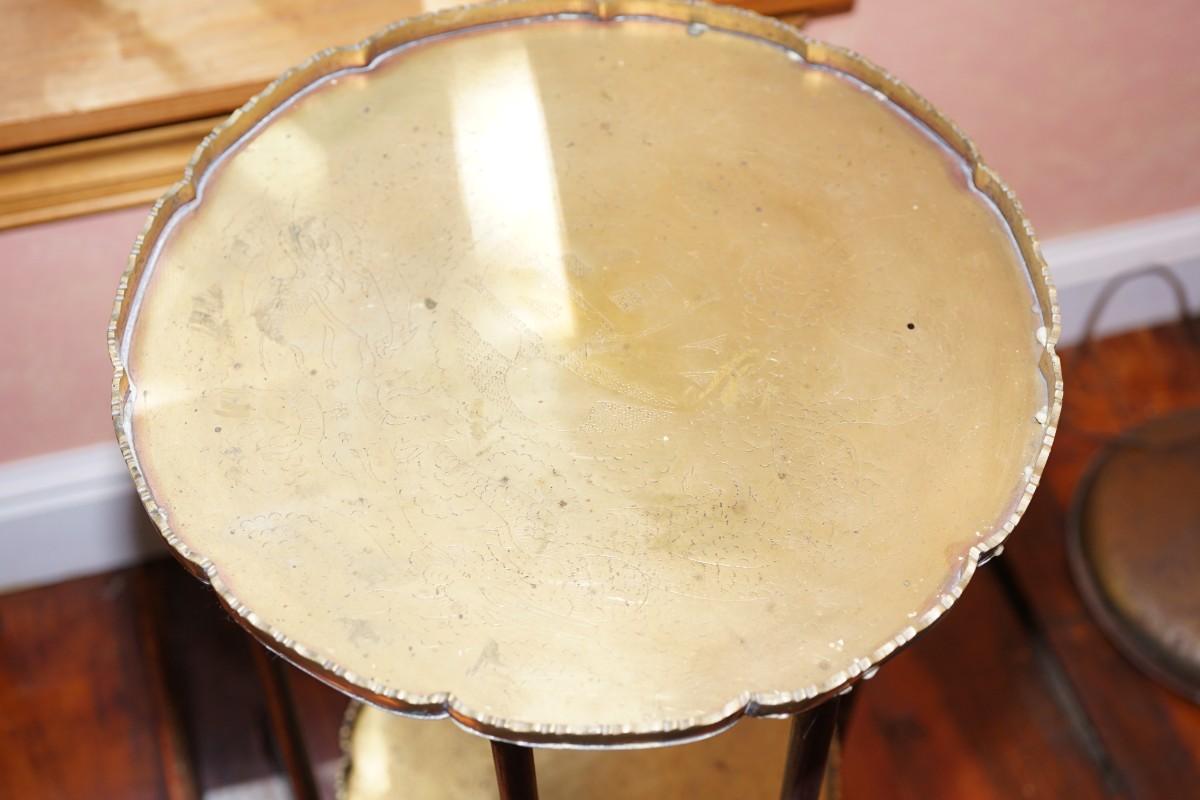 VINTAGE BRASS TRAY FERN STAND W/ ASIAN ENGRAVED DESIGNS WOODEN STAND