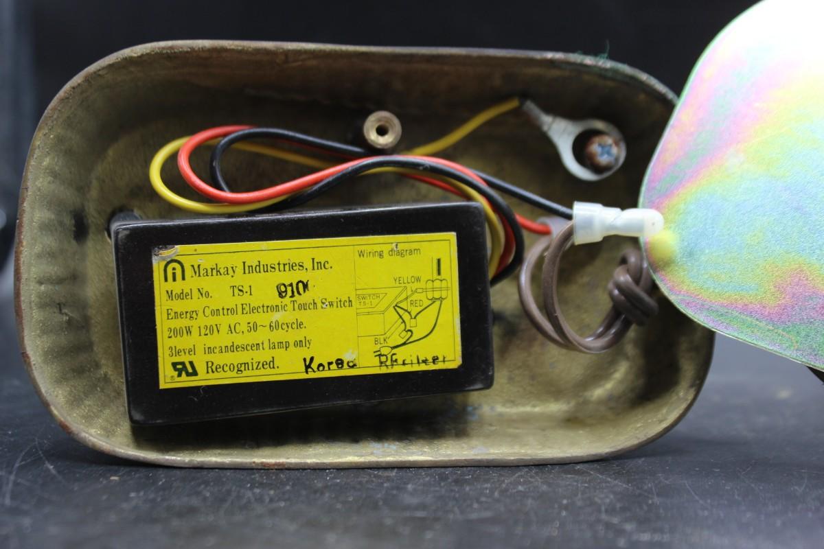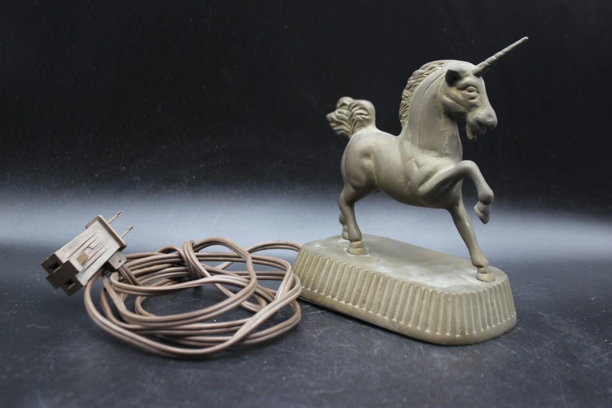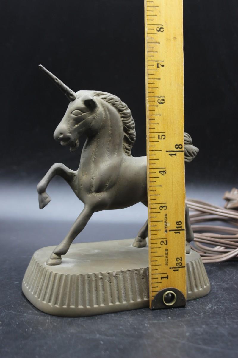 Interesting repurpose/reuse project. Brass unicorn statue was turned into a touch control unit. Previous owner was good was electric projects. You can plug in a lamp to the plug end and use the unicorn as an on/off switch. Works, sort of, the light we plugged in had a strobe effect going when touched. May need rewiring. Wire can be removed for those who just want a unicorn statue. Stands about 7".