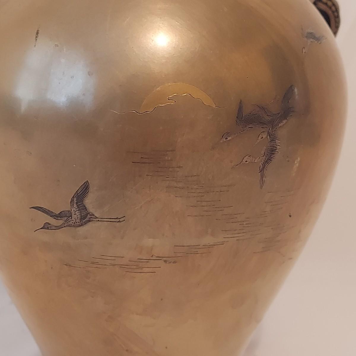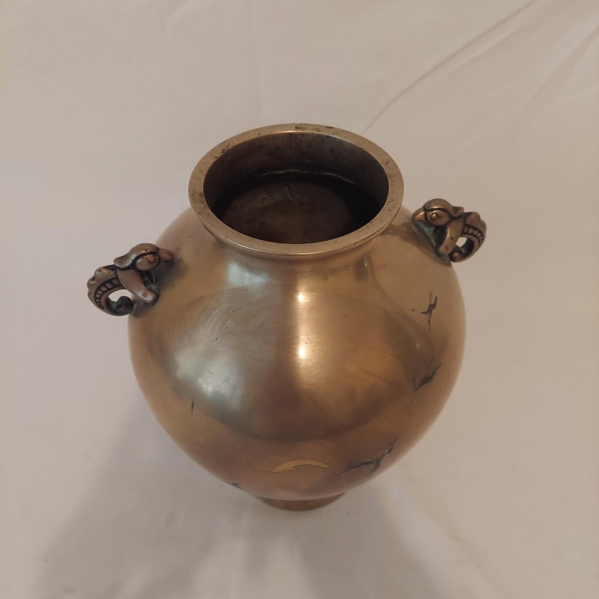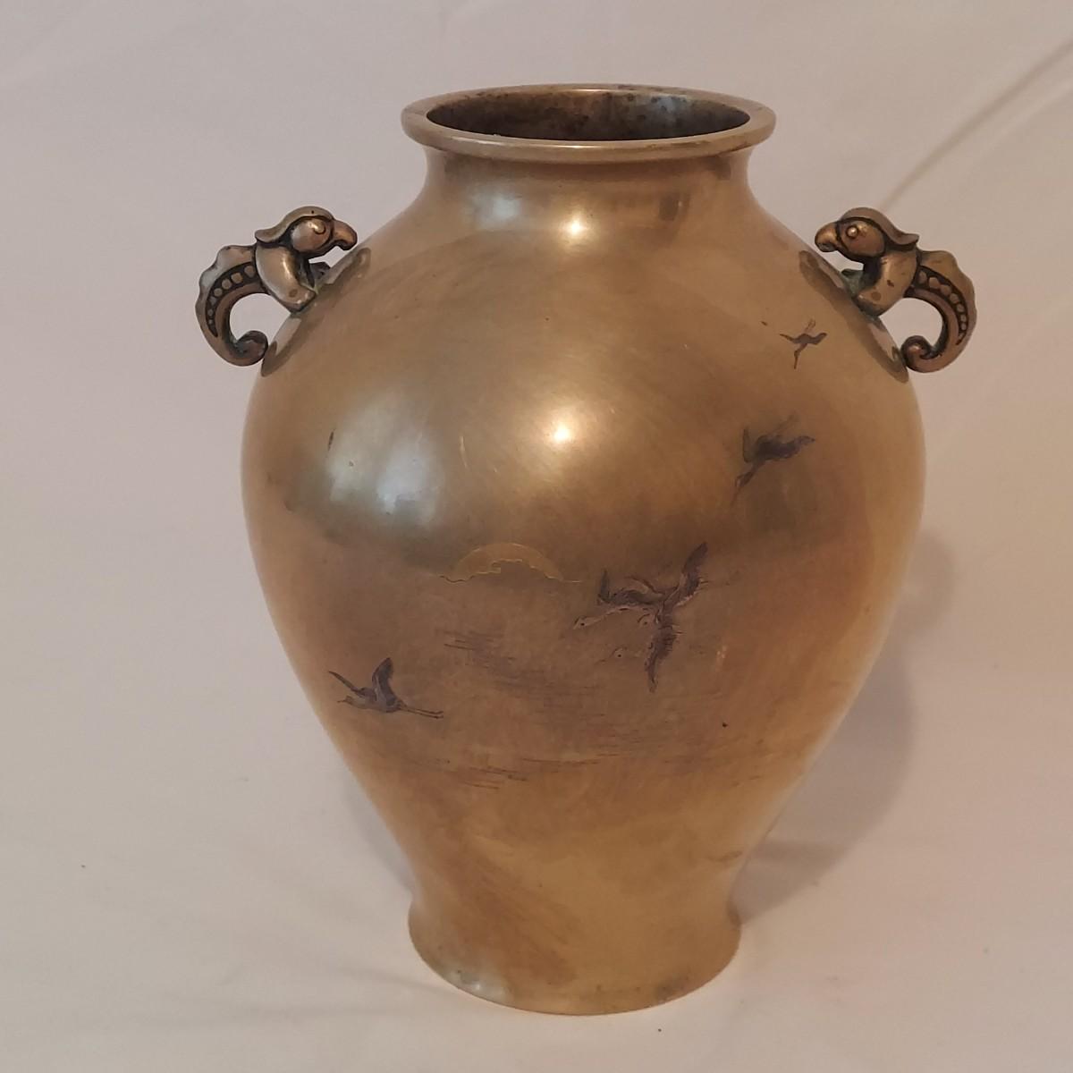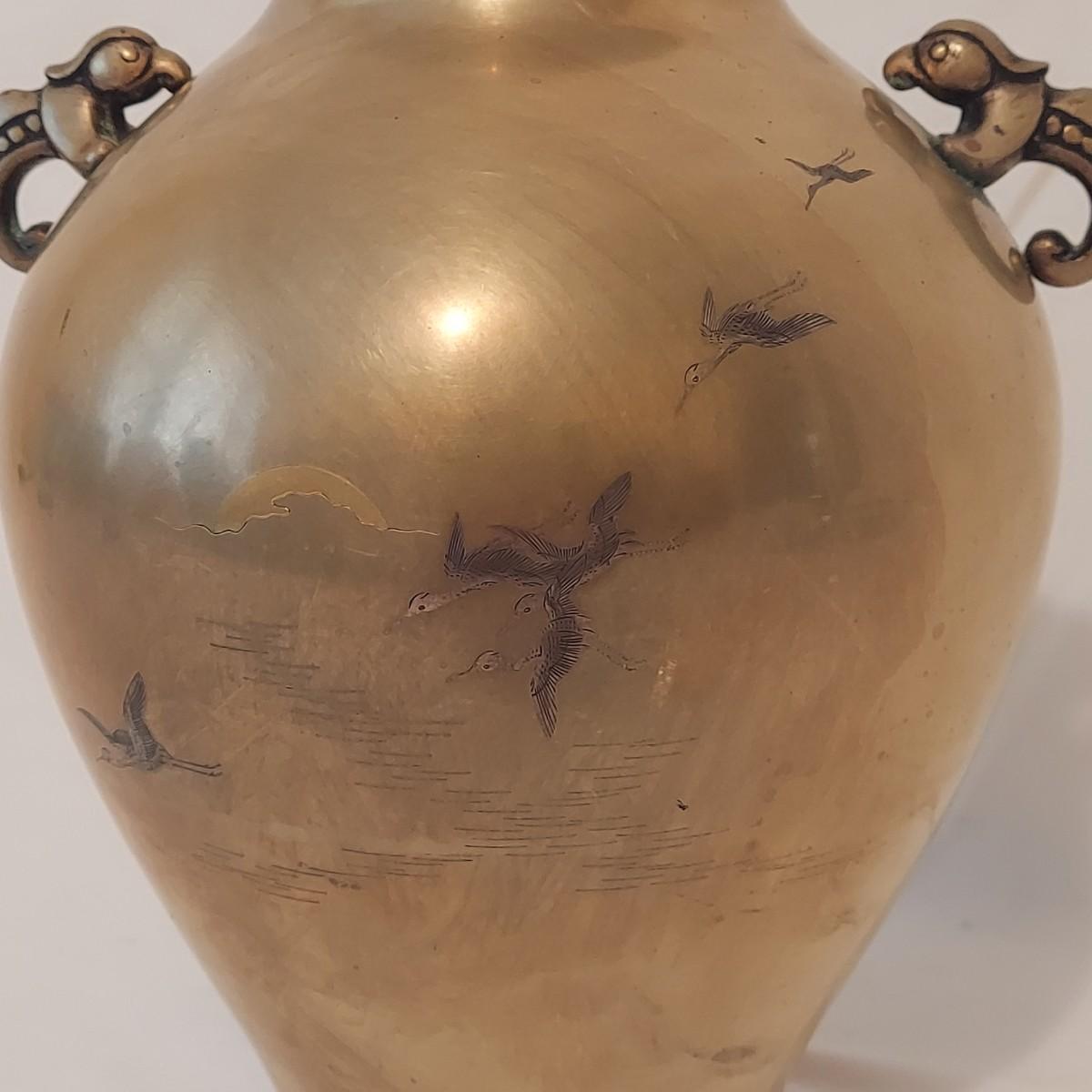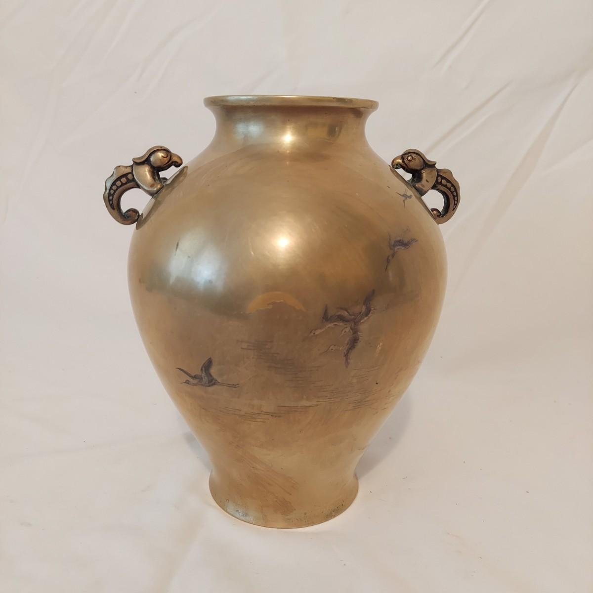 Metal urn with etched water bird scene that appears to be vintage and brass. Measures 7"D x 10"H. Please see photos for details. Shipping available. Shipping certain items can be costly. We suggest contacting our preferred local shipping provider, Postage Express, with dimensions and getting an estimate before bidding: (828) 255-9250 or shipping@postageexpressnc.com