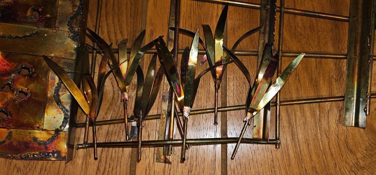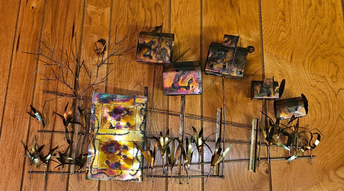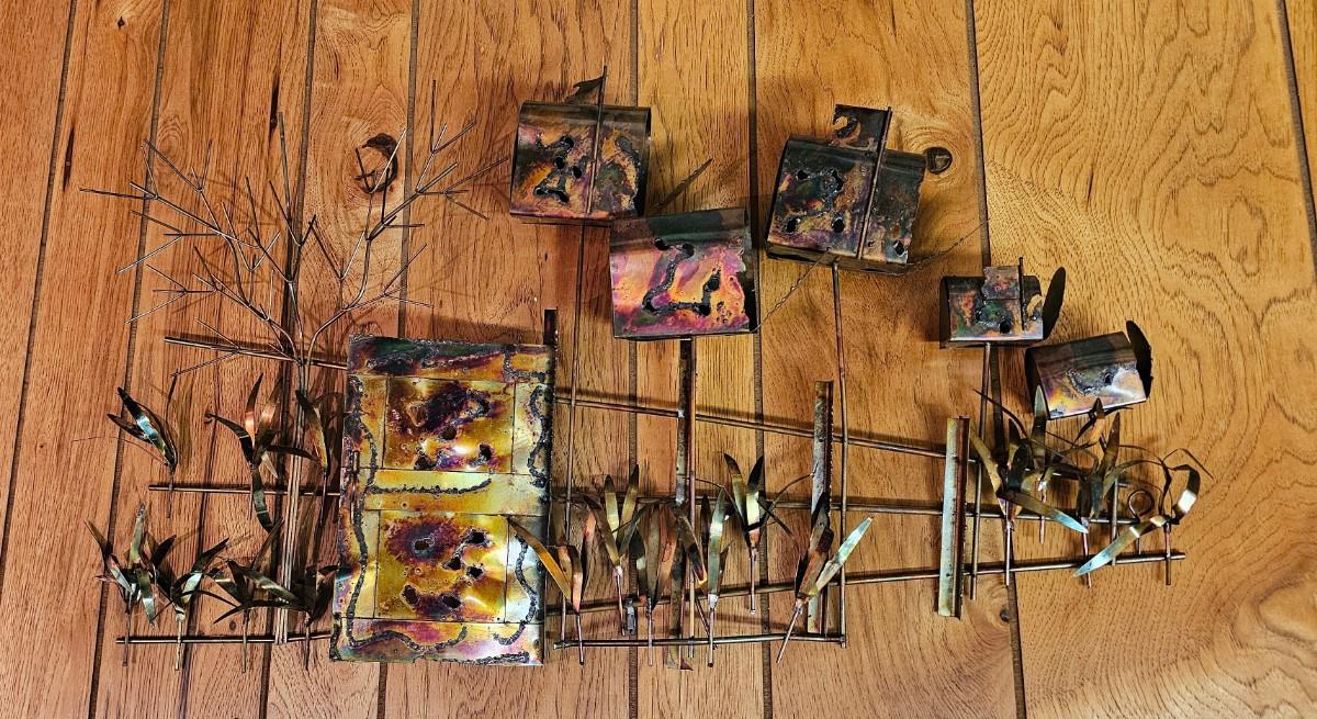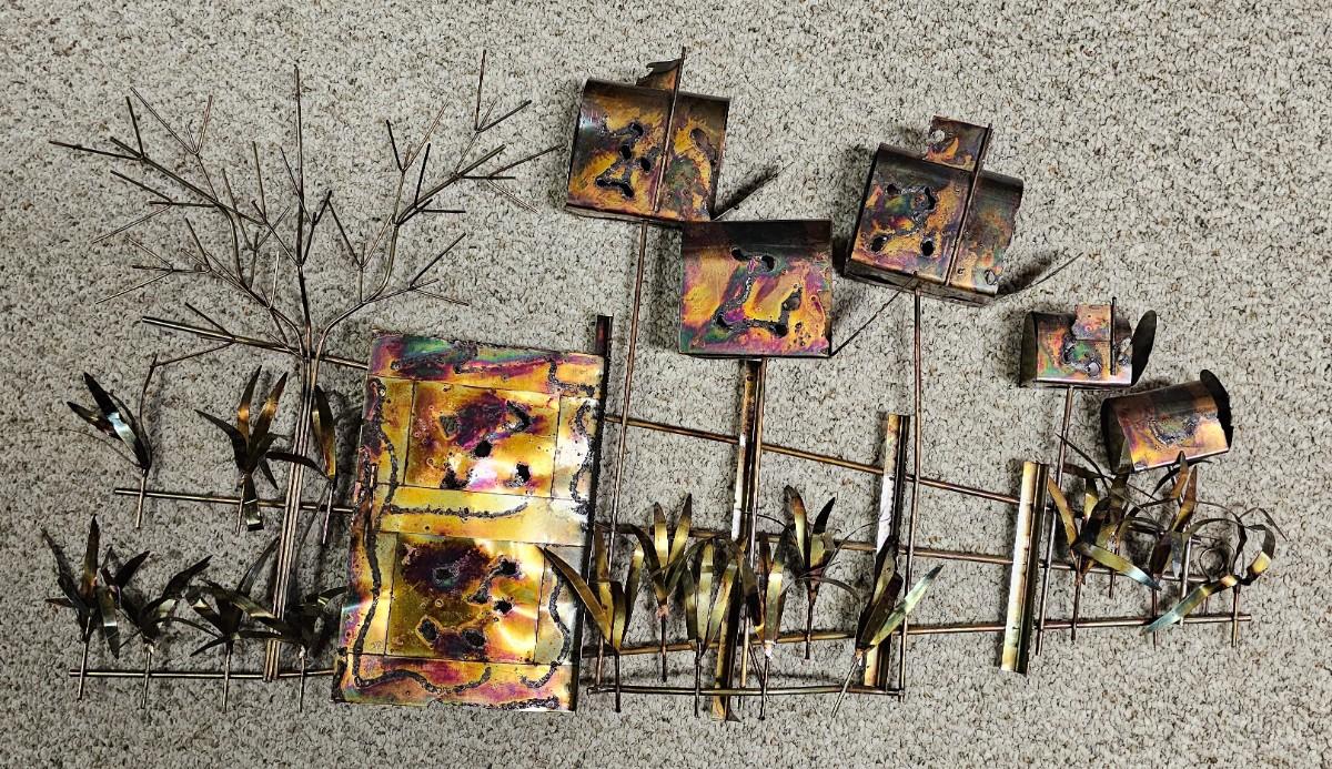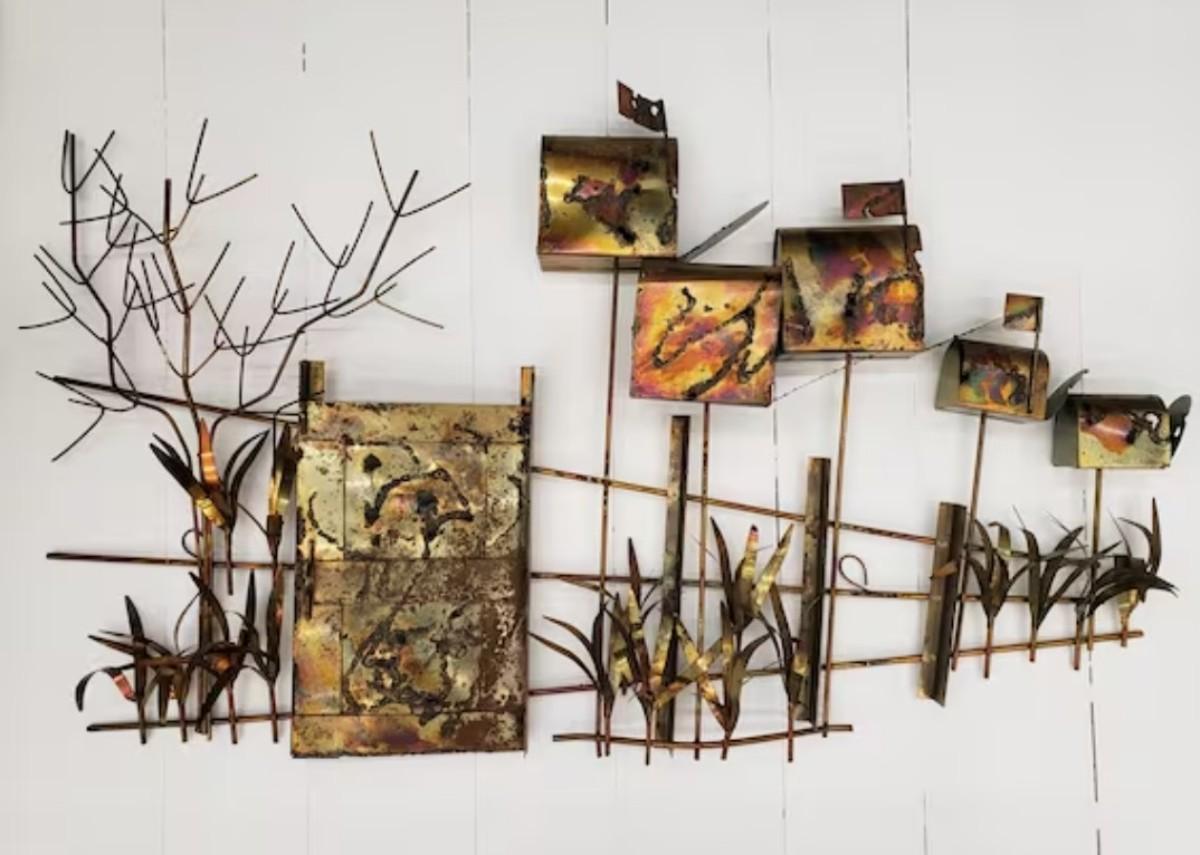 Vintage Brass wall hanging depicting a fence with mail boxes Brutalist Sculpture