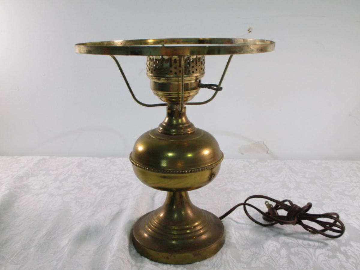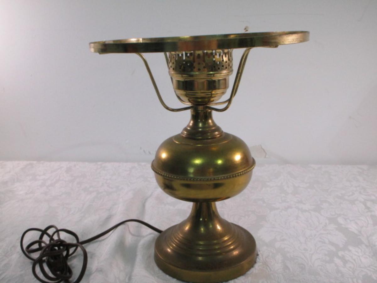 No shade, tested & works, 11-5/7" tall x 10-1/8" across at widest spot, see pictures