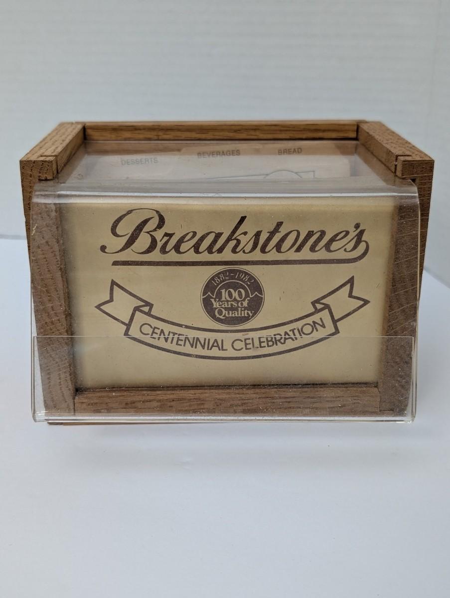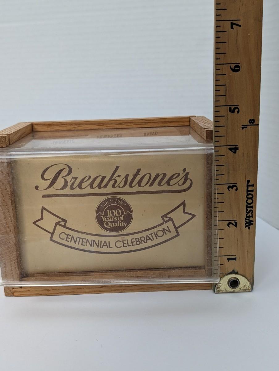 Celebrate a century of quality with this vintage Breakstone's recipe box! This unique piece commemorates the brand's centennial, with "1882-1982" proudly displayed on the front. The box has a lovely wooden frame with a clear plastic front and lid, and it comes complete with the original recipe card dividers for categories like "Desserts," "Beverages," and "Bread." It's a fantastic piece of food history and a perfect addition to any vintage kitchen or retro-themed collection.