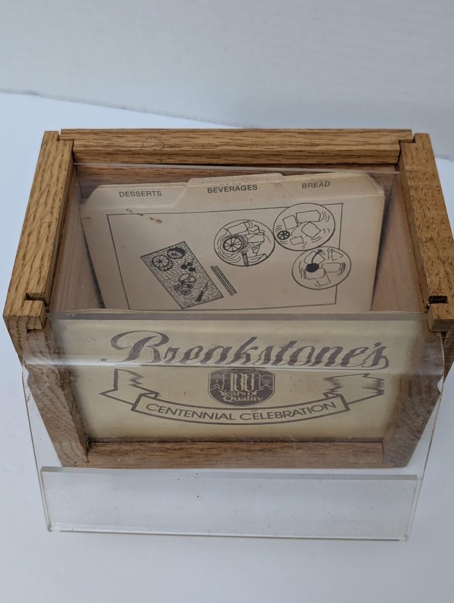 Celebrate a century of quality with this vintage Breakstone's recipe box! This unique piece commemorates the brand's centennial, with "1882-1982" proudly displayed on the front. The box has a lovely wooden frame with a clear plastic front and lid, and it comes complete with the original recipe card dividers for categories like "Desserts," "Beverages," and "Bread." It's a fantastic piece of food history and a perfect addition to any vintage kitchen or retro-themed collection.