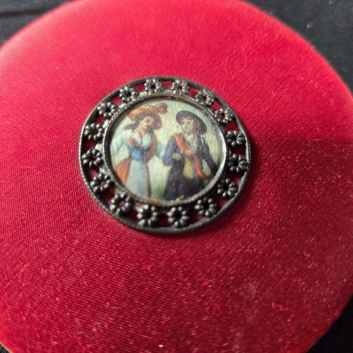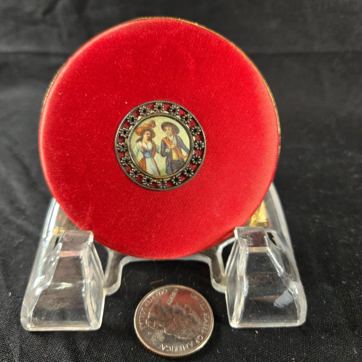 This auction lot is for a Vintage Brevettao Italian Ladies Compact. This is an Italian made compact cover in a ruby colored fabric adorned with a picture of Victorian Ladies. The inside mirror is beveled and in good condition. Contains no powder. It measures about 3-inches in diameter.