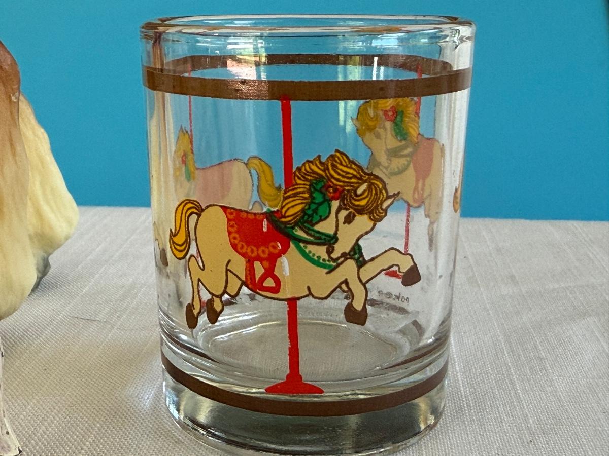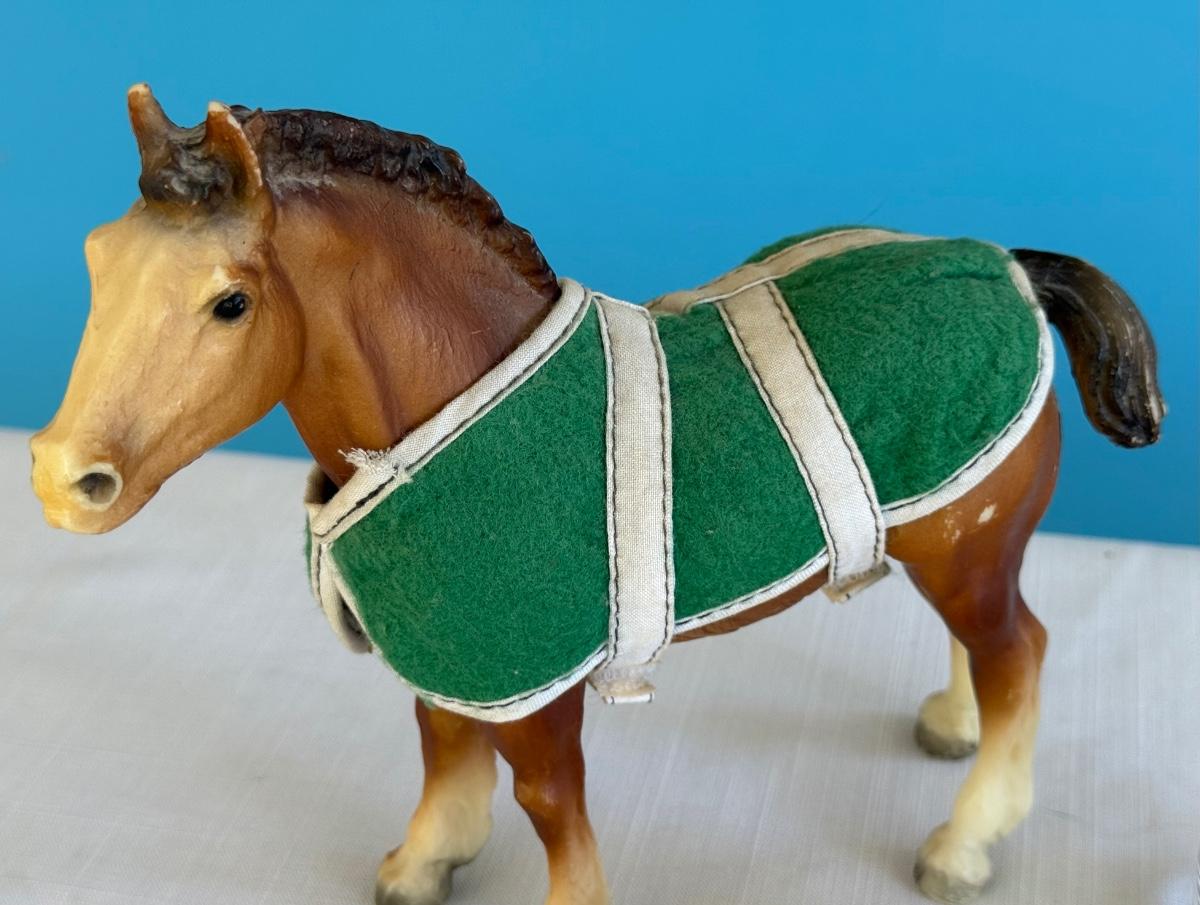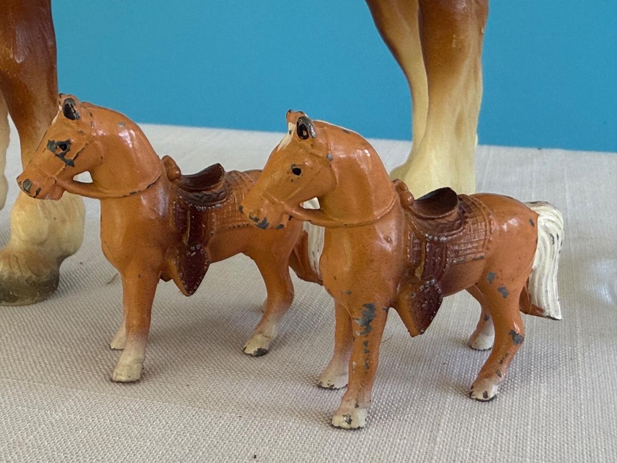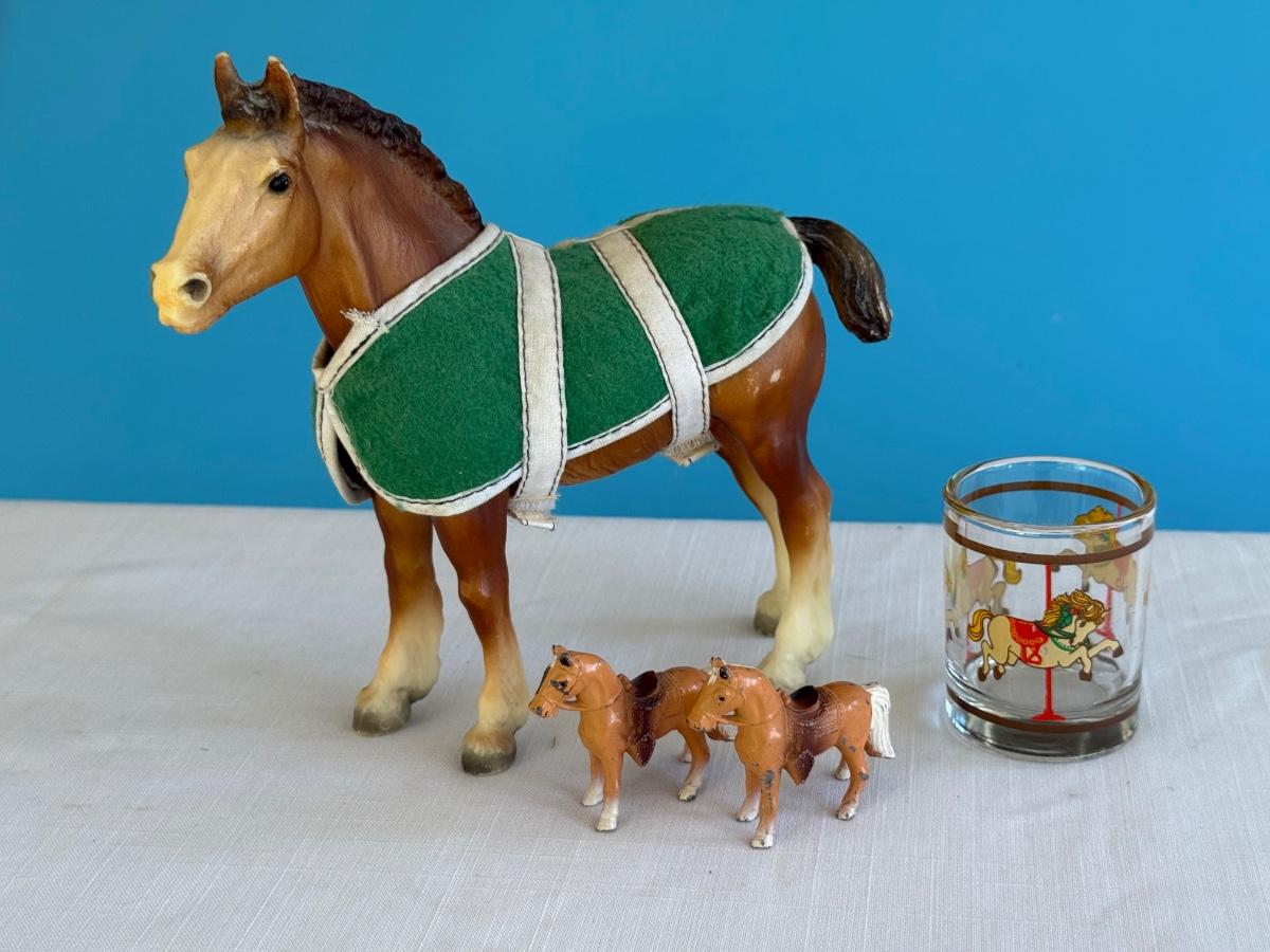 Vintage Breyer Clydesdale, two mini Japan cast iron horses w/Pokee Votive glass